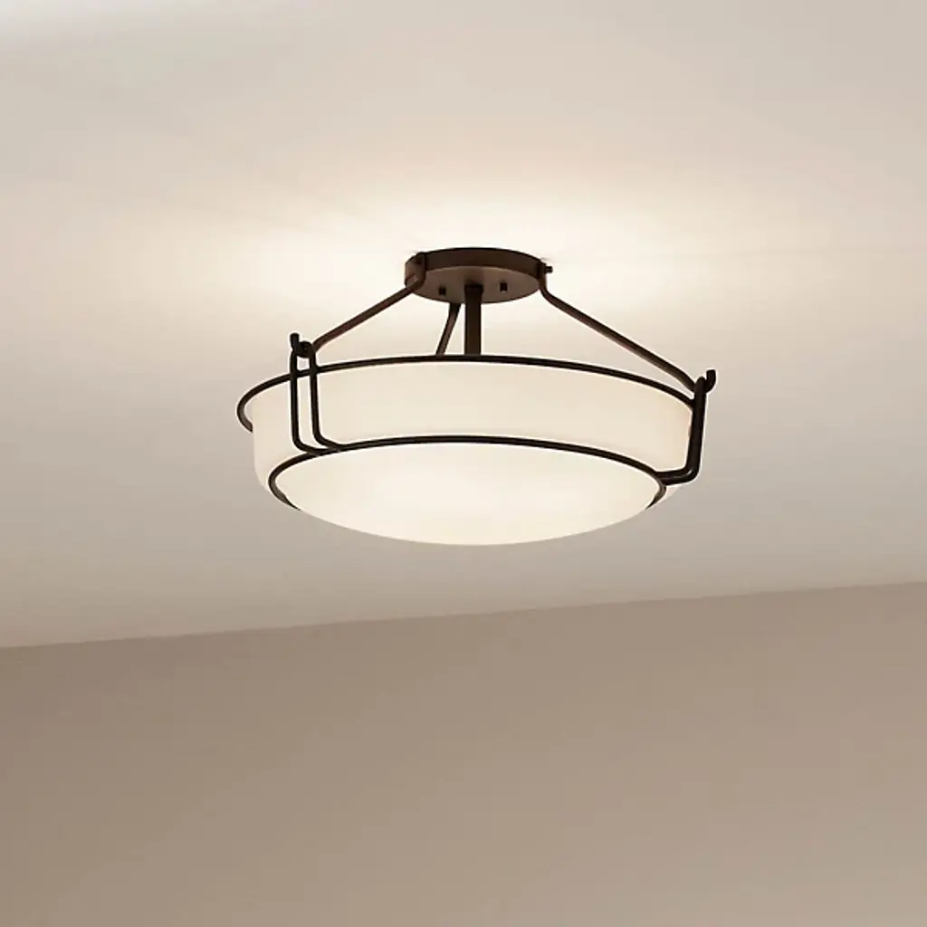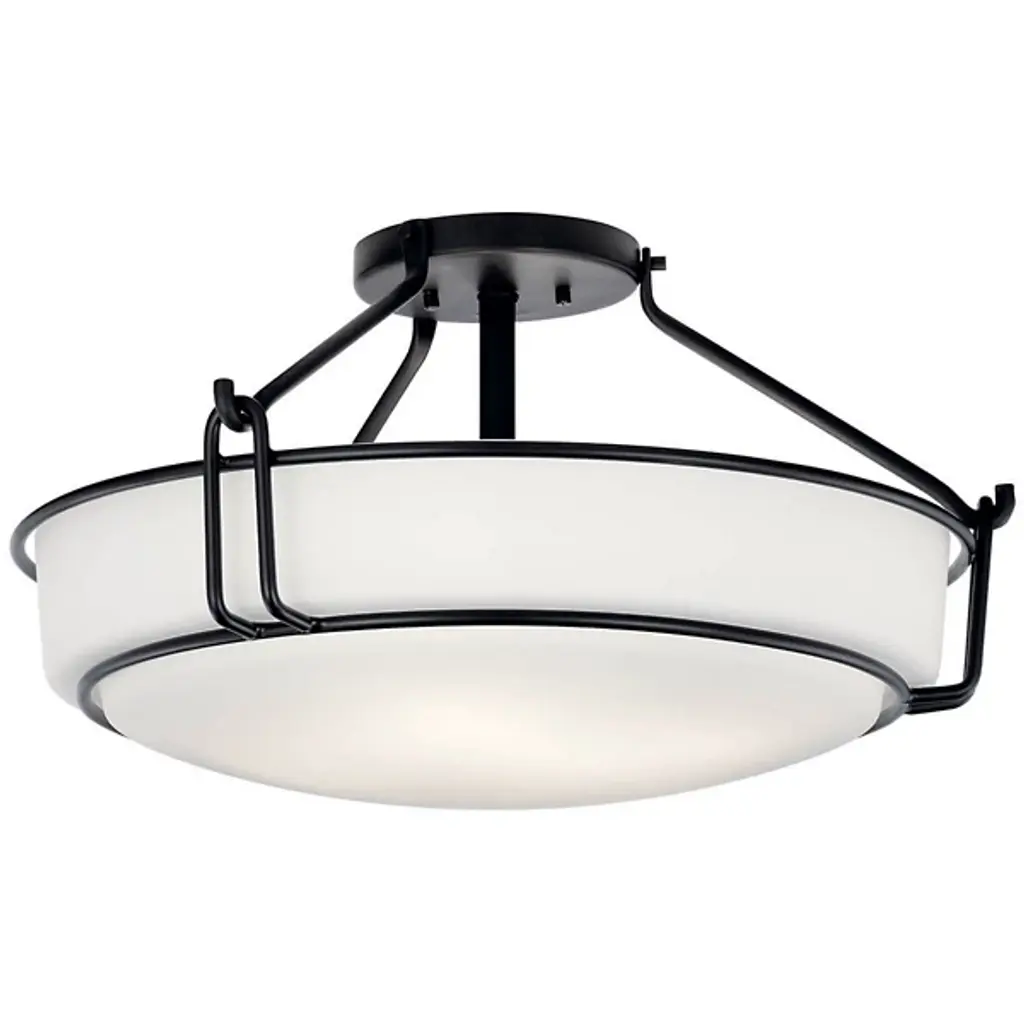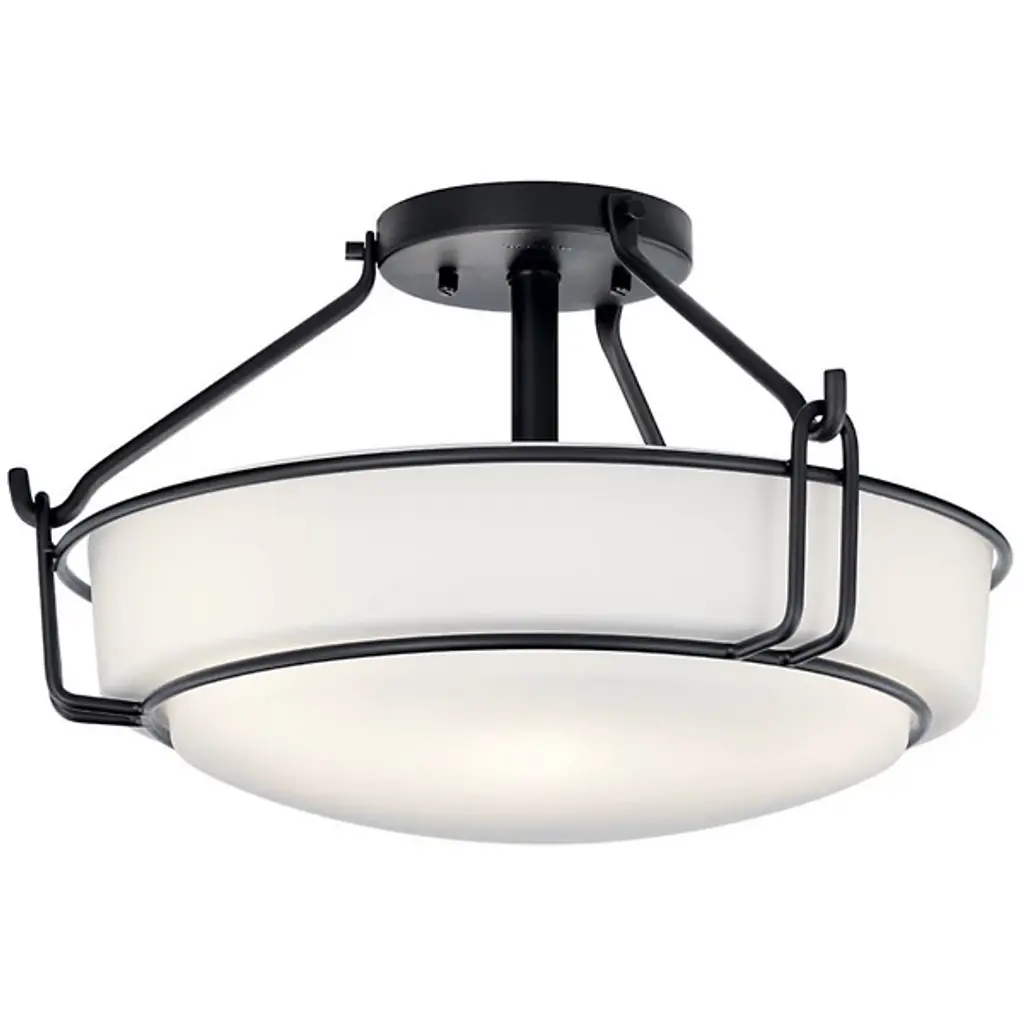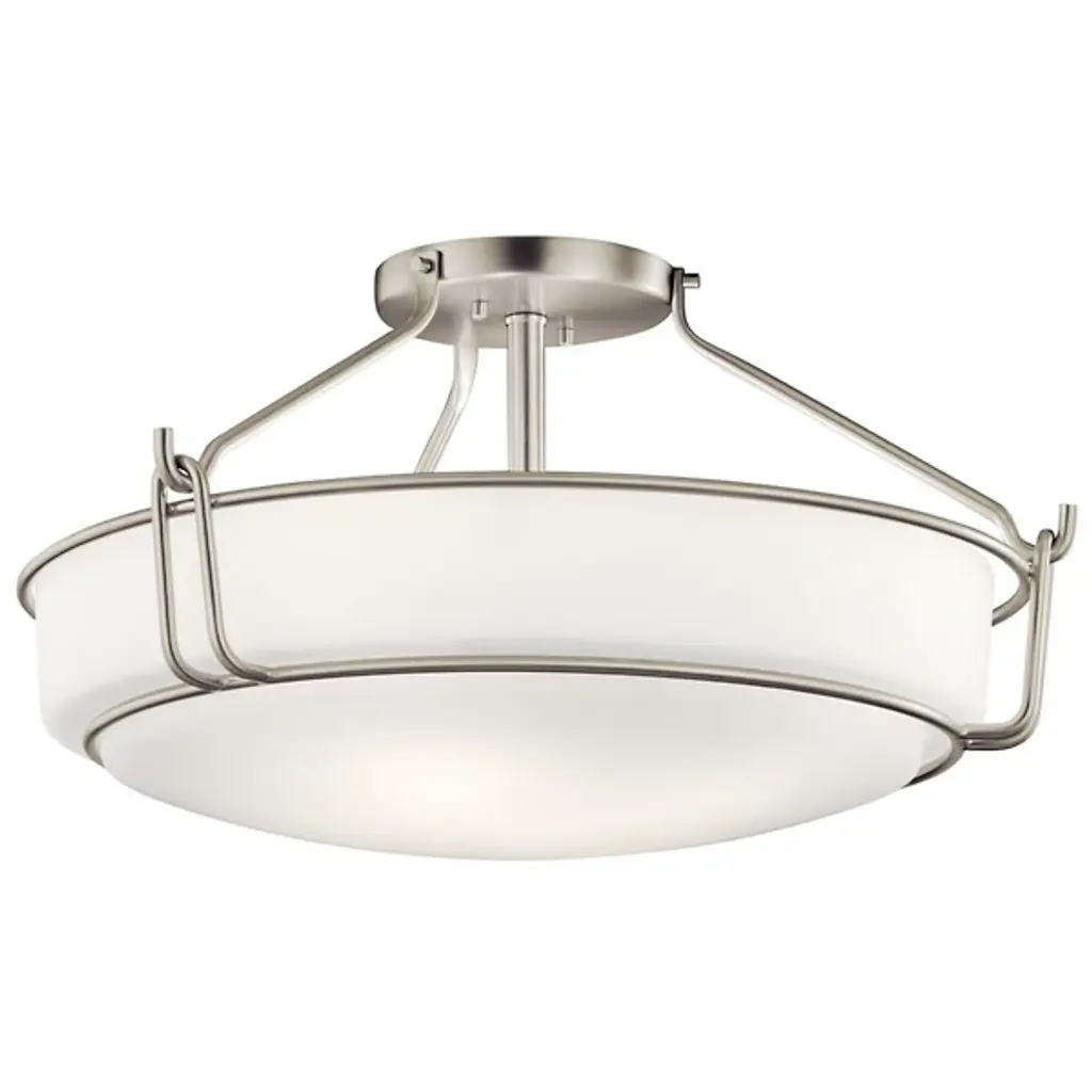 The Alkire Semi-Flushmount form Kichler has transitional style rooted in minimalist tradition. The opaque Glass shade is suspended from the canopy with “hook and eye” style metal work, which adds a dash of rustic flair to your design environment. The light is efficiently diffused by the shade, providing essential ambient light that is needed in every room.