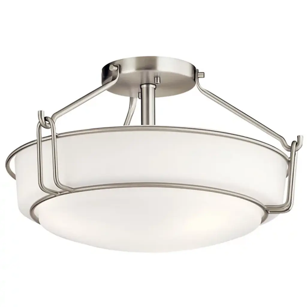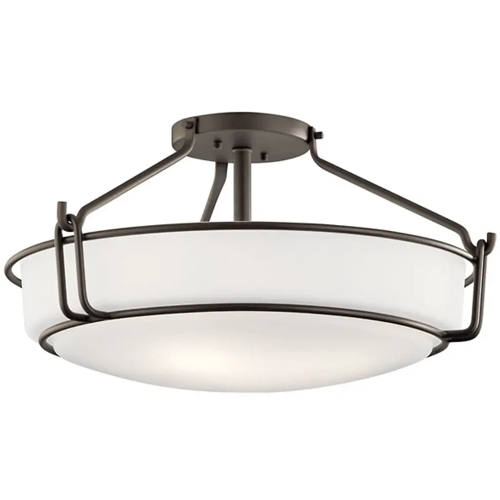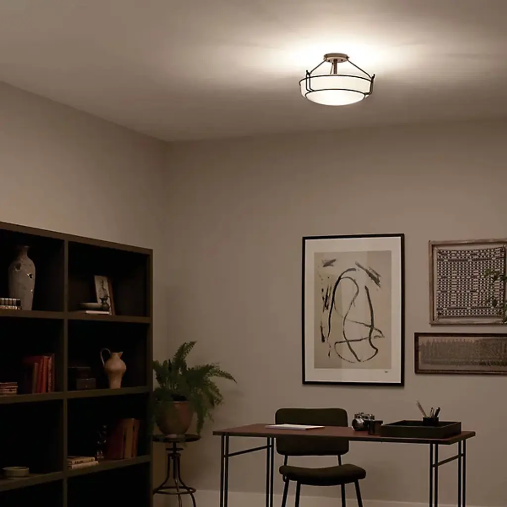 The Alkire Semi-Flushmount form Kichler has transitional style rooted in minimalist tradition. The opaque Glass shade is suspended from the canopy with “hook and eye” style metal work, which adds a dash of rustic flair to your design environment. The light is efficiently diffused by the shade, providing essential ambient light that is needed in every room.