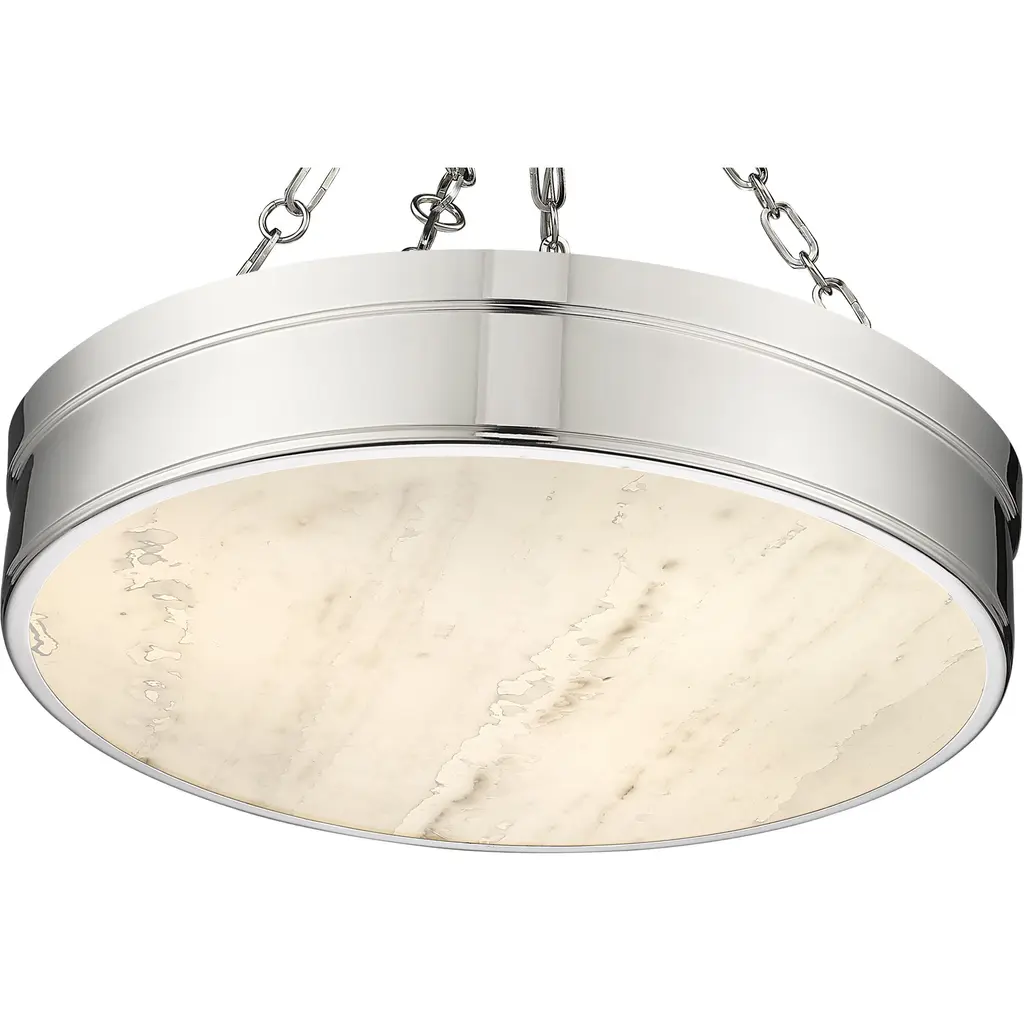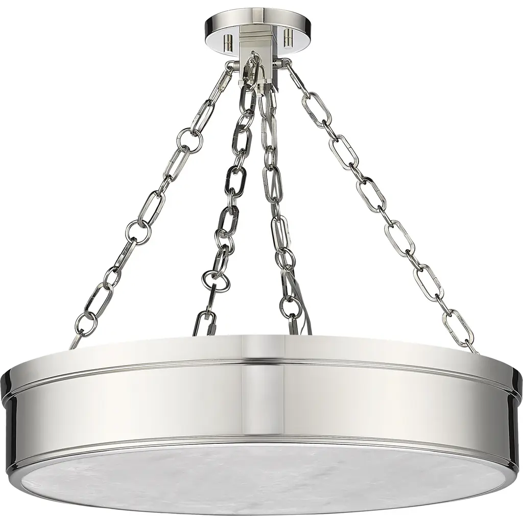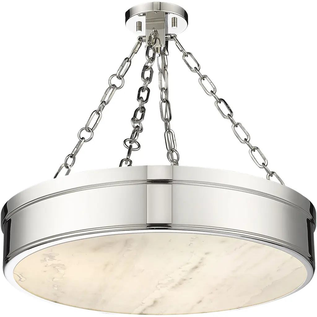 Illuminate a modern or transitional space in style with a light fixture reflecting a host of styles from industrial to architectural to Mid-Century Modern. This three-light LED semi-flush mount ceiling light provides a gleaming quality with a steel frame offering a polished nickel finish and a decadent alabaster diffuser that infuses ambient lighting.