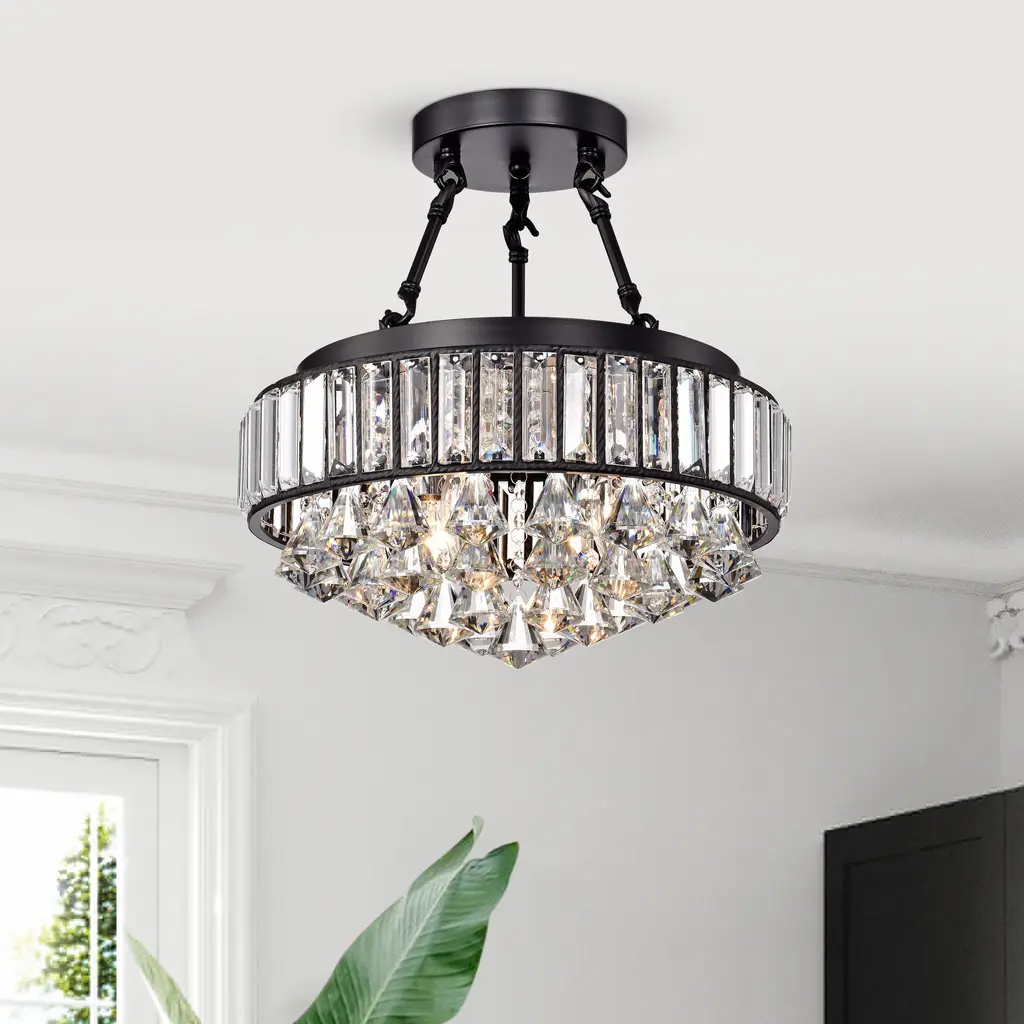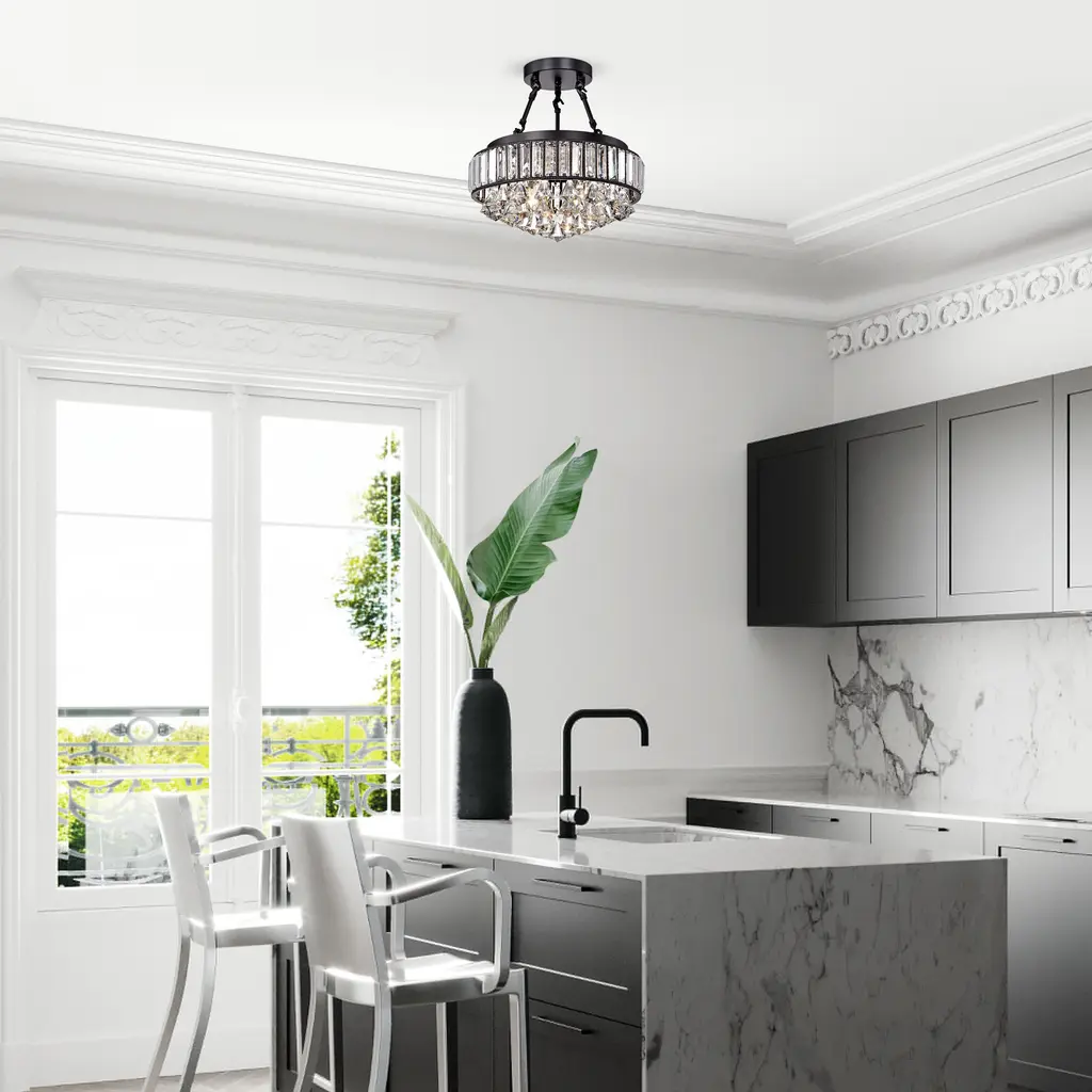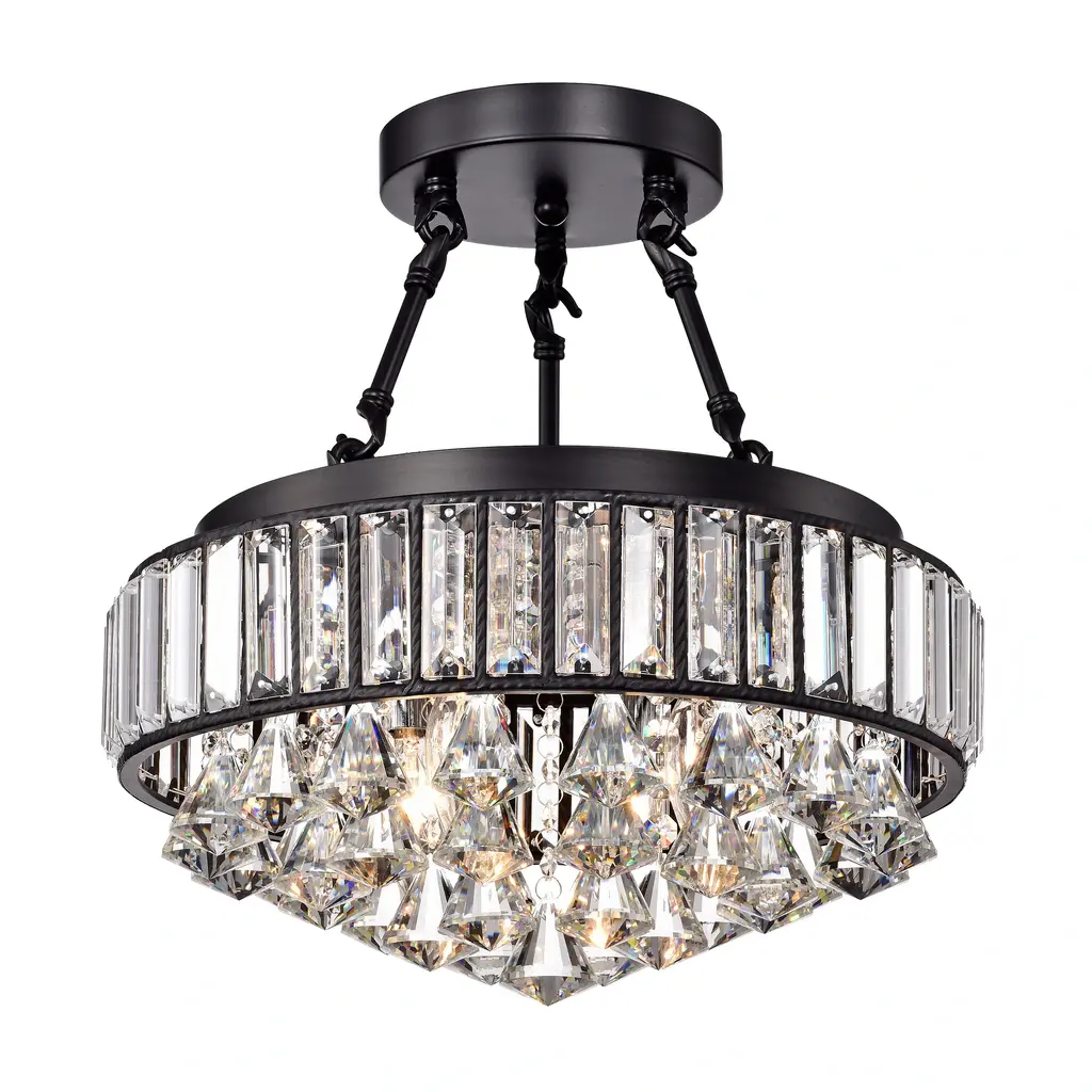 Create a dazzling atmosphere in your home with this Aresi 4-Light Semi-Flush Mount chandelier. Crafted from metal and adorned with sparkling crystals, it features a black finish that contrasts beautifully with the shimmering accents. With its semi-flush mount design and compatibility with halogen bulbs, this chandelier is perfect for small and medium-sized rooms that require an elegant touch.Features: