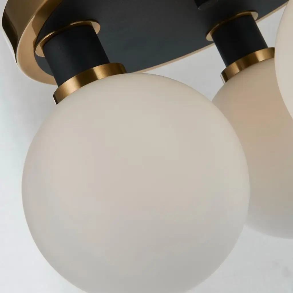 The Gem collection with �Blizzard� glassware exudes a sense of sophistication. Featuring a glossy textured white, the glass glows giving it a timeless and contemporary feel. The combination of the black framing with brushed brass is simply exquisite. A beautiful 3 lite semi flushmount shown. Black and Brushed Brass finish / Dimmable / 3 x E12 bulb base required (bulbs not included) / Glossy textured white glass / ETL listed / Limited lifetime warranty / Sloped ceiling compatible. ,