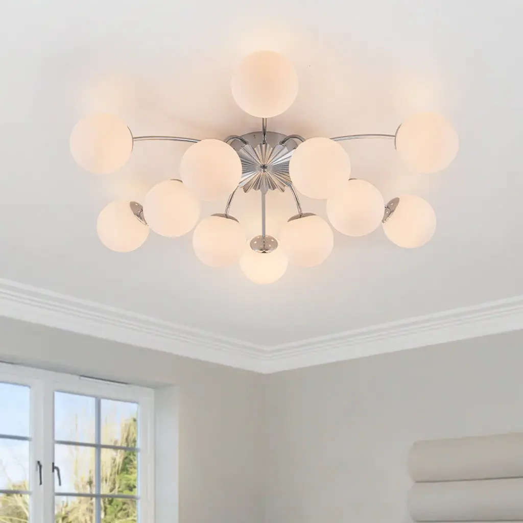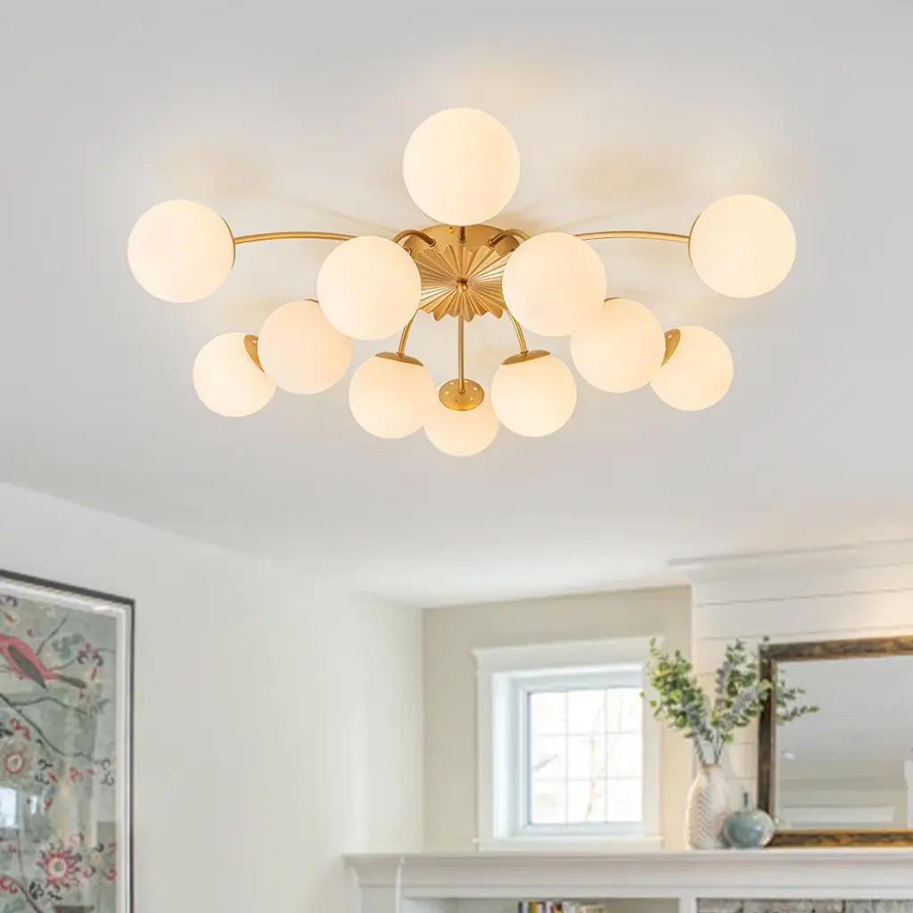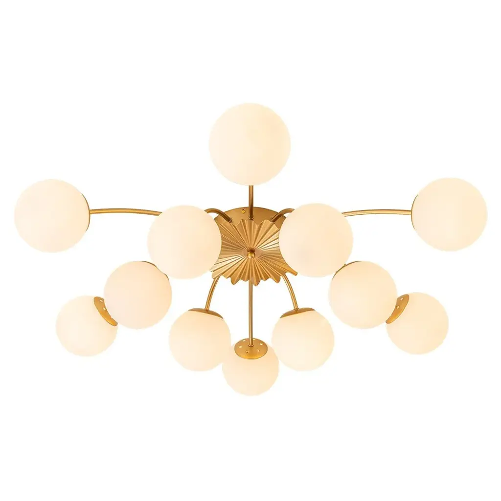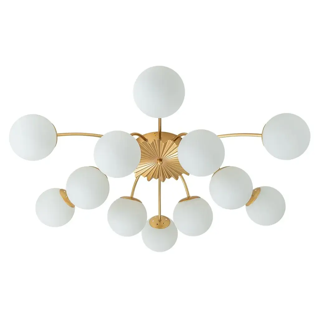 Upgrade your space with the dazzling Art Deco 12-light star-night fireworks matte glass globe semi-flush mount. This stunning fixture features twelve matte glass globes, resembling a burst of fireworks, creating a spectacular display of light and shadow. The sleek, geometric frame in a gold or chrome finish adds a touch of vintage glamor, making it a perfect centerpiece for any room. Experience the enchantment of a starlit night, where elegance and modernity converge in a breathtaking design.Features:Dimensions: