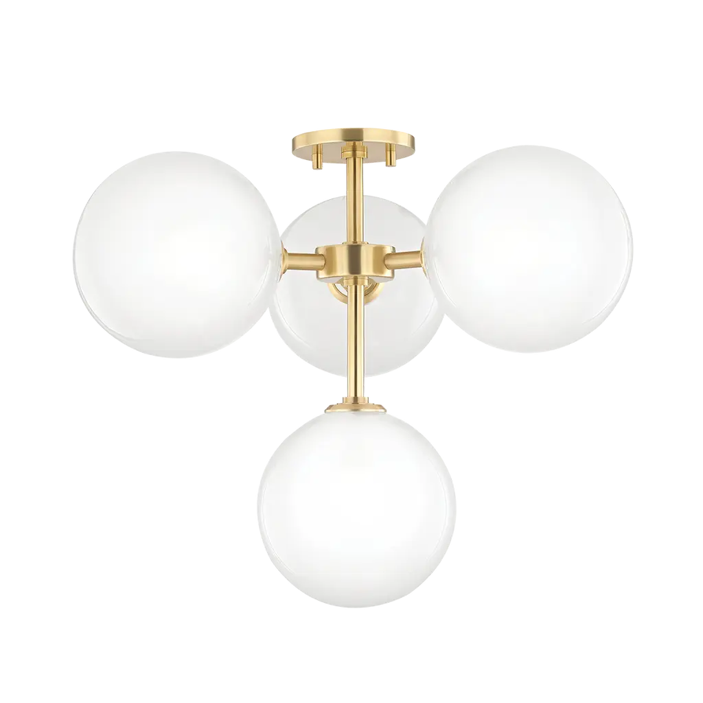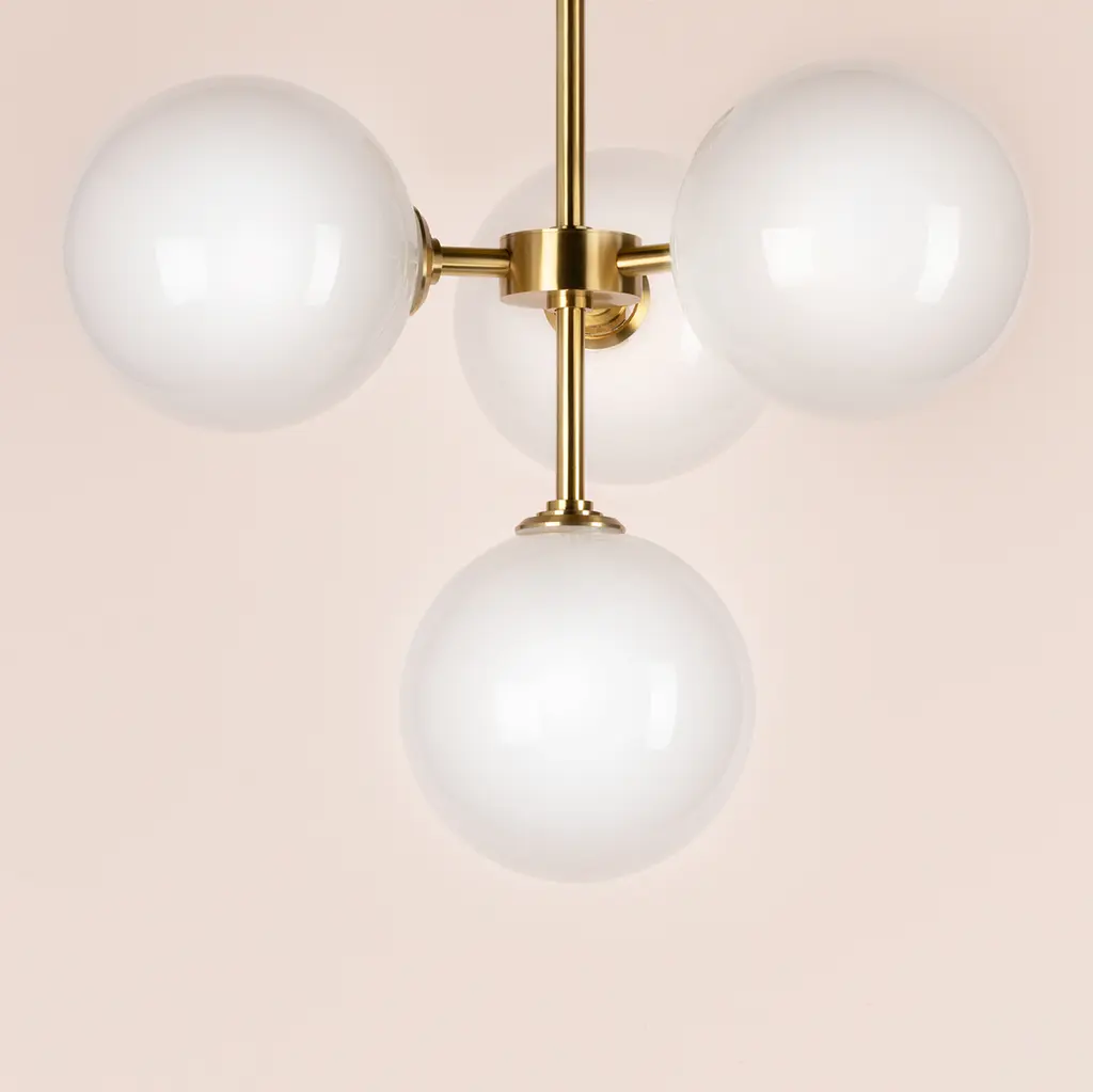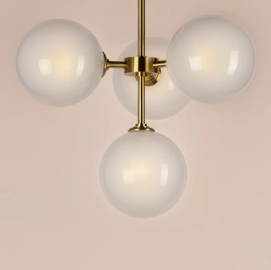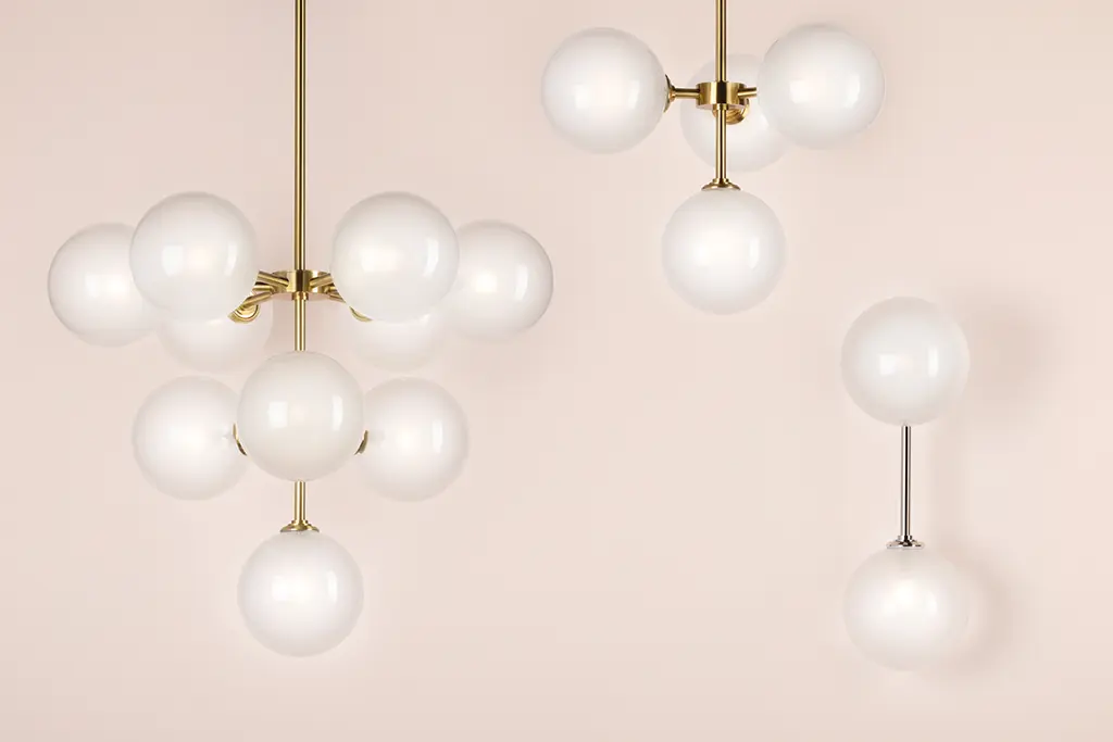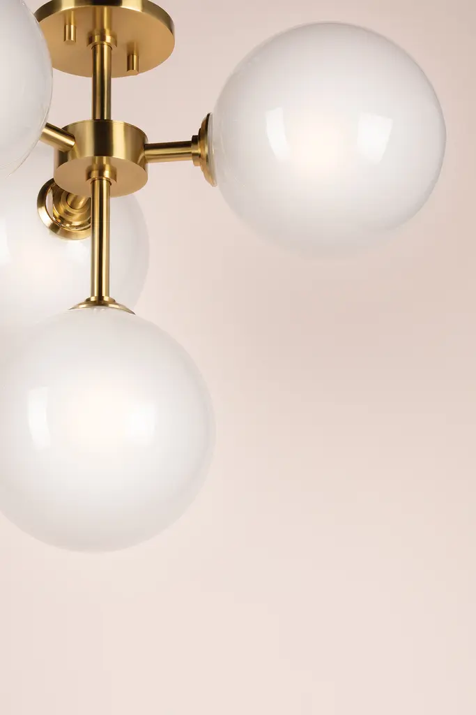 A mid-century muse, Ashleigh marries clean lines and bubbly forms for a striking style that elevates any space. Exaggerated shades feature an etched glossy finish, diffusing the light ever so slightly. A midpoint between clear and milk glass, the glossy globes lend a beautiful luster that pops against the metallic finish. Available as a chandelier, wall sconce, and flush mount in aged brass or polished nickel.