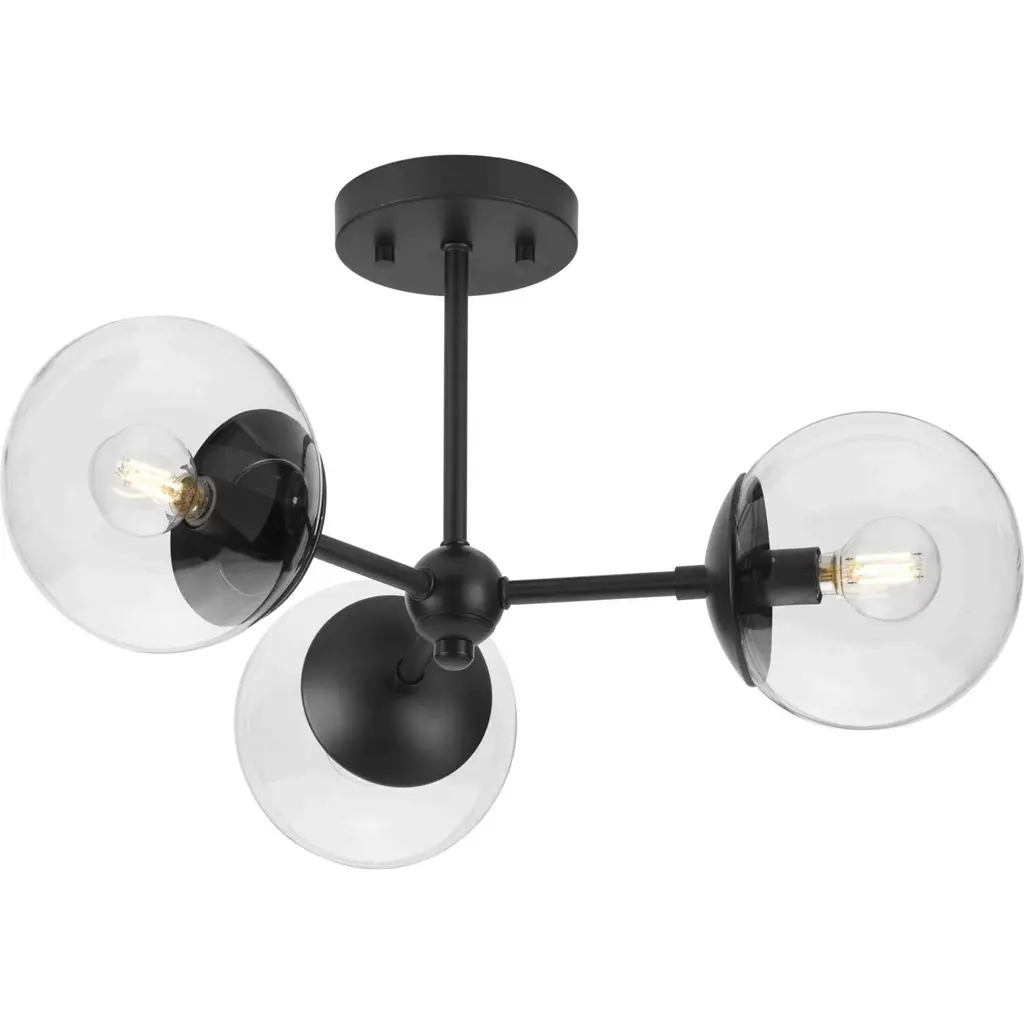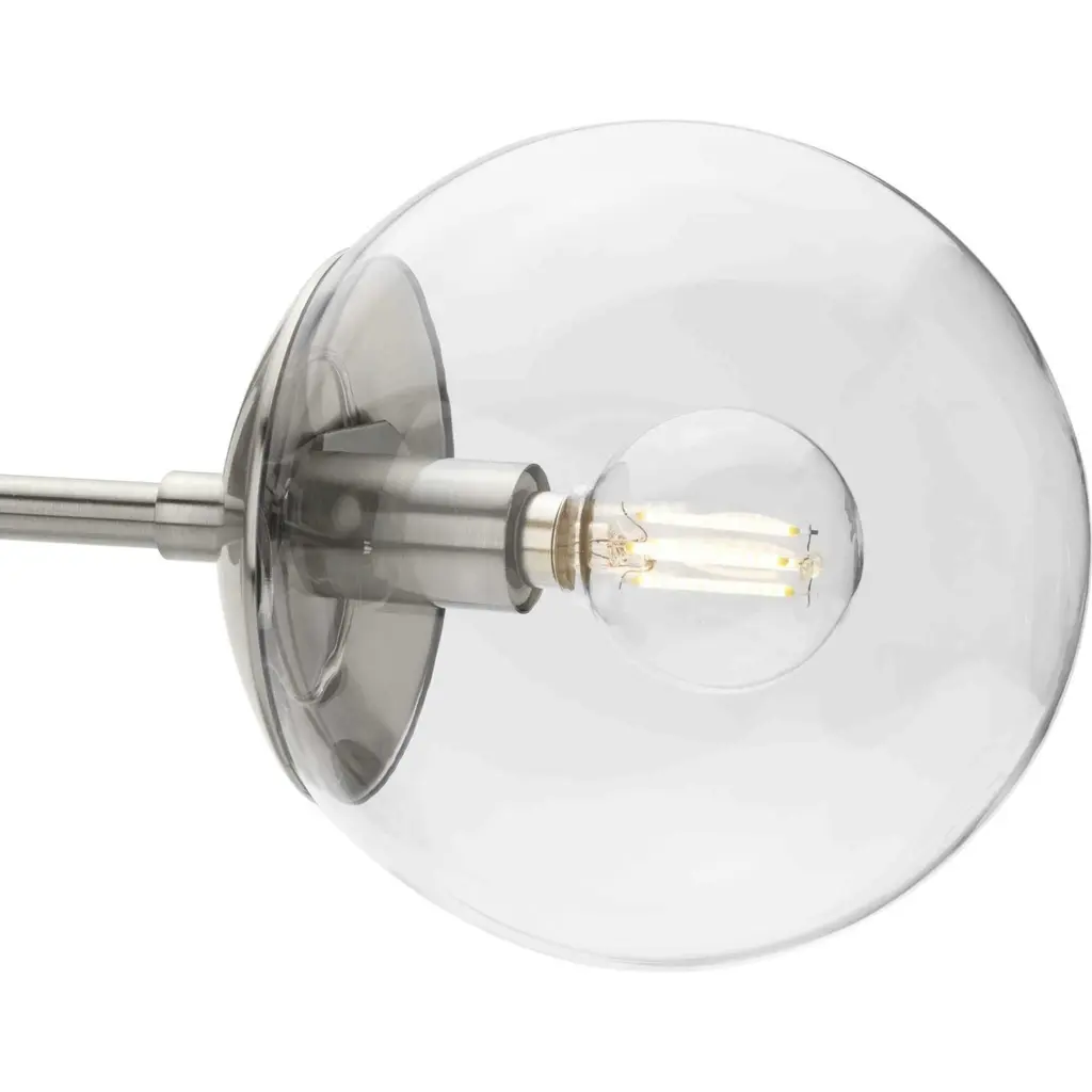 Long lines ending in clear glass globe shades define the Atwell Close-to-Ceiling fixture's modern aesthetic. One central stem is capped by clear glass, creating bright illumination from the light source glowing within. Atwell fits beautifully into mid-century modern and contemporary settings, delivering ambient illumination to bedrooms, halls and foyers and settings, delivering ambient illumination to bedrooms, foyers and living rooms.