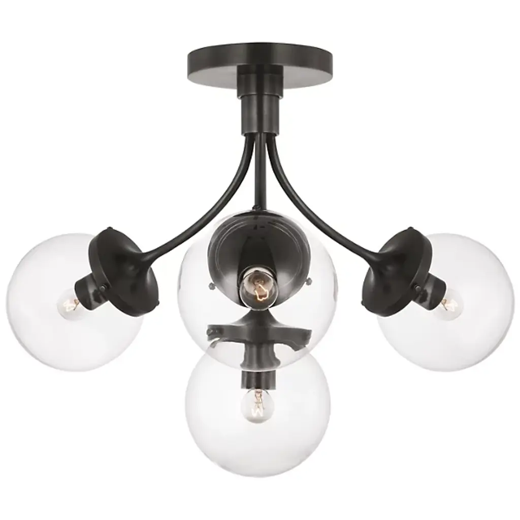 Long lines ending in clear glass globe shades define the Atwell Close-to-Ceiling fixture's modern aesthetic. One central stem is capped by clear glass, creating bright illumination from the light source glowing within. Atwell fits beautifully into mid-century modern and contemporary settings, delivering ambient illumination to bedrooms, halls and foyers and settings, delivering ambient illumination to bedrooms, foyers and living rooms.