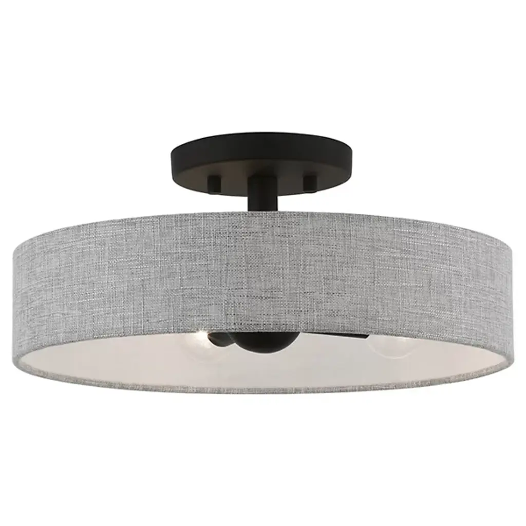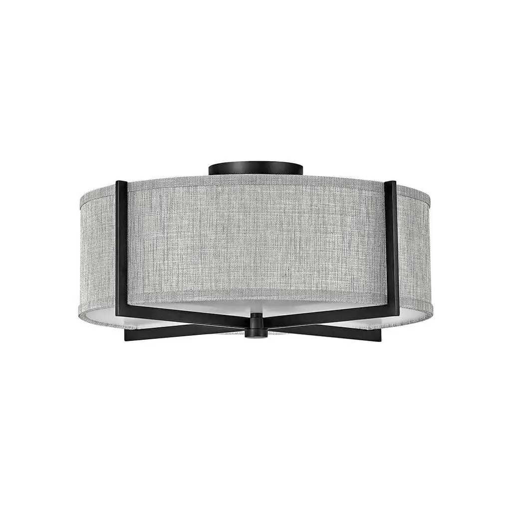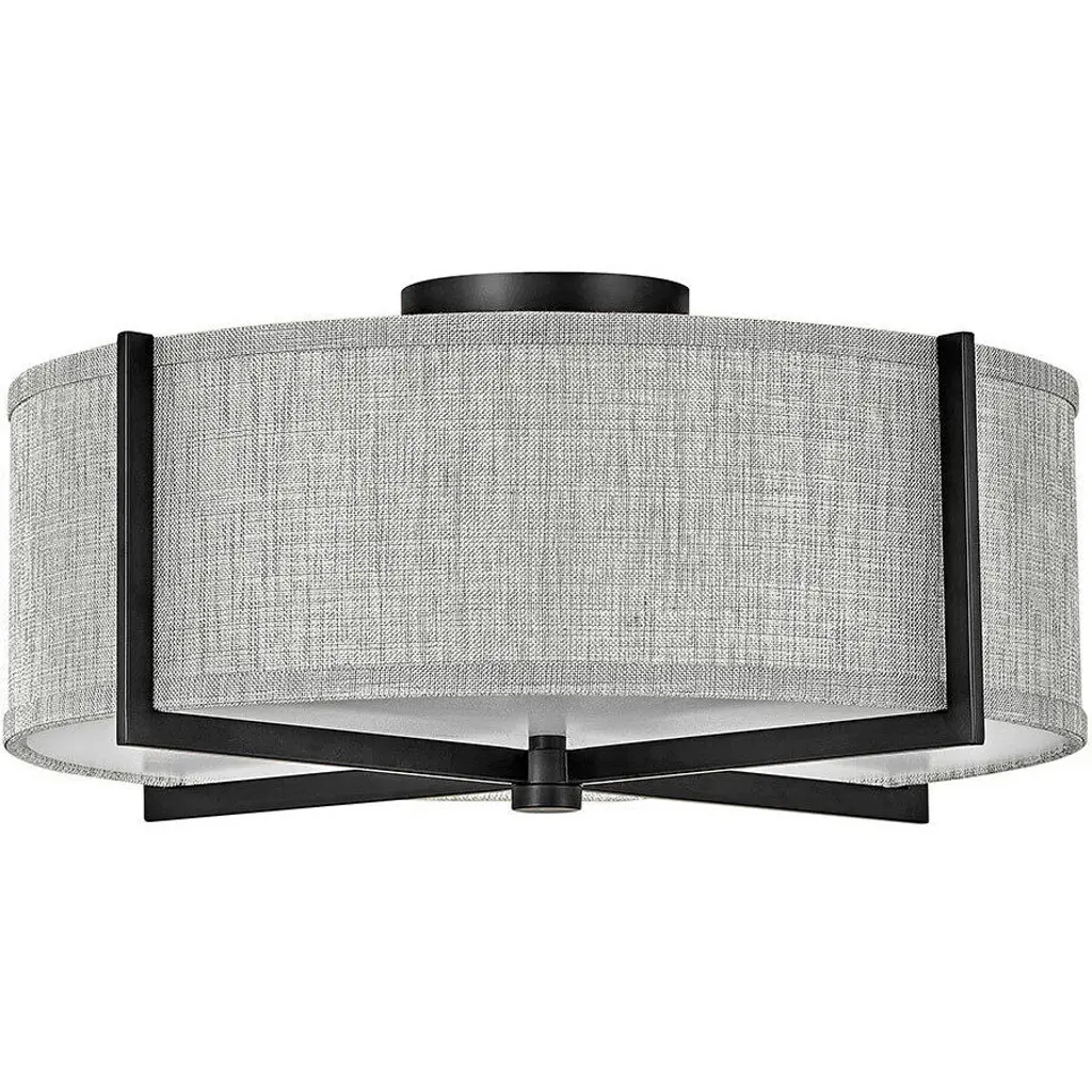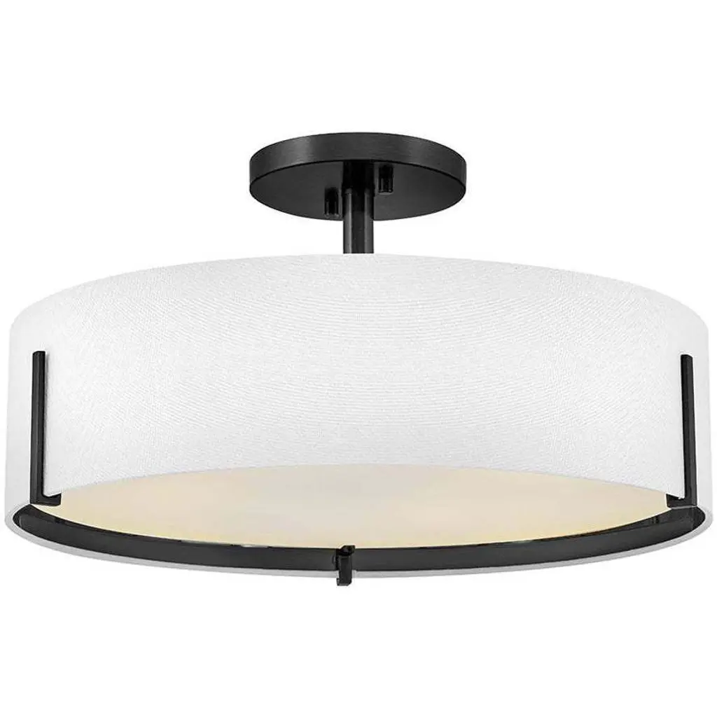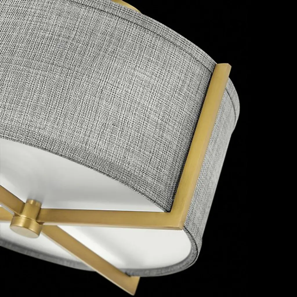 Razer-sharp edges meet endless curves in the handsome design of the Axis Semi-Flushmount from Hinkley Lighting. The piece brings a fresh modern personality that complements the stylish living room or bedroom. An axis of sleek metal brackets elevates the look of the piece from the bottom and the side. Soft to the touch, a linen shade rounds out the design, concealing a group of bulbs. When turned on, clean diffused light penetrates out the shapely diffuser and shade.