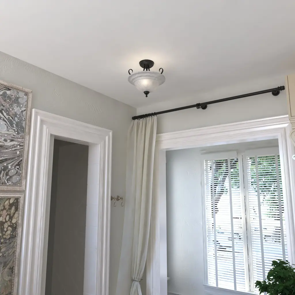 The curved arms and white alabaster glass are the key elements of this transitional collection. The well-balanced design details highlight the natural beauty of the materials and are perfectly combined to create a sophisticated, elegant statement. The Babylon collection is offered in multiple finishes. Medium screw base lamping provides maximum light output, and flexibility in bulb choice. This versatile fixture can be installed two ways mount as a semi flush ceiling fixture or use the chain to mount as a pendant.
