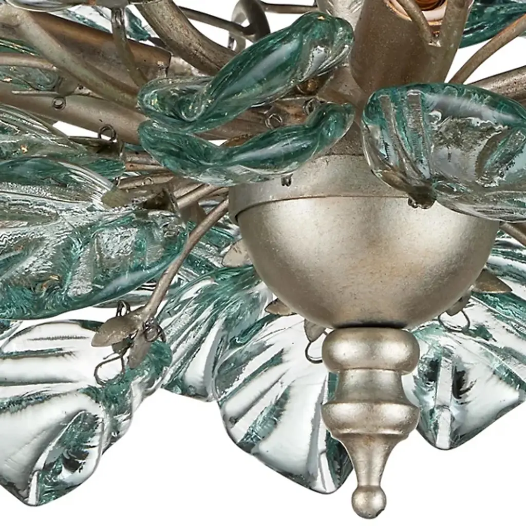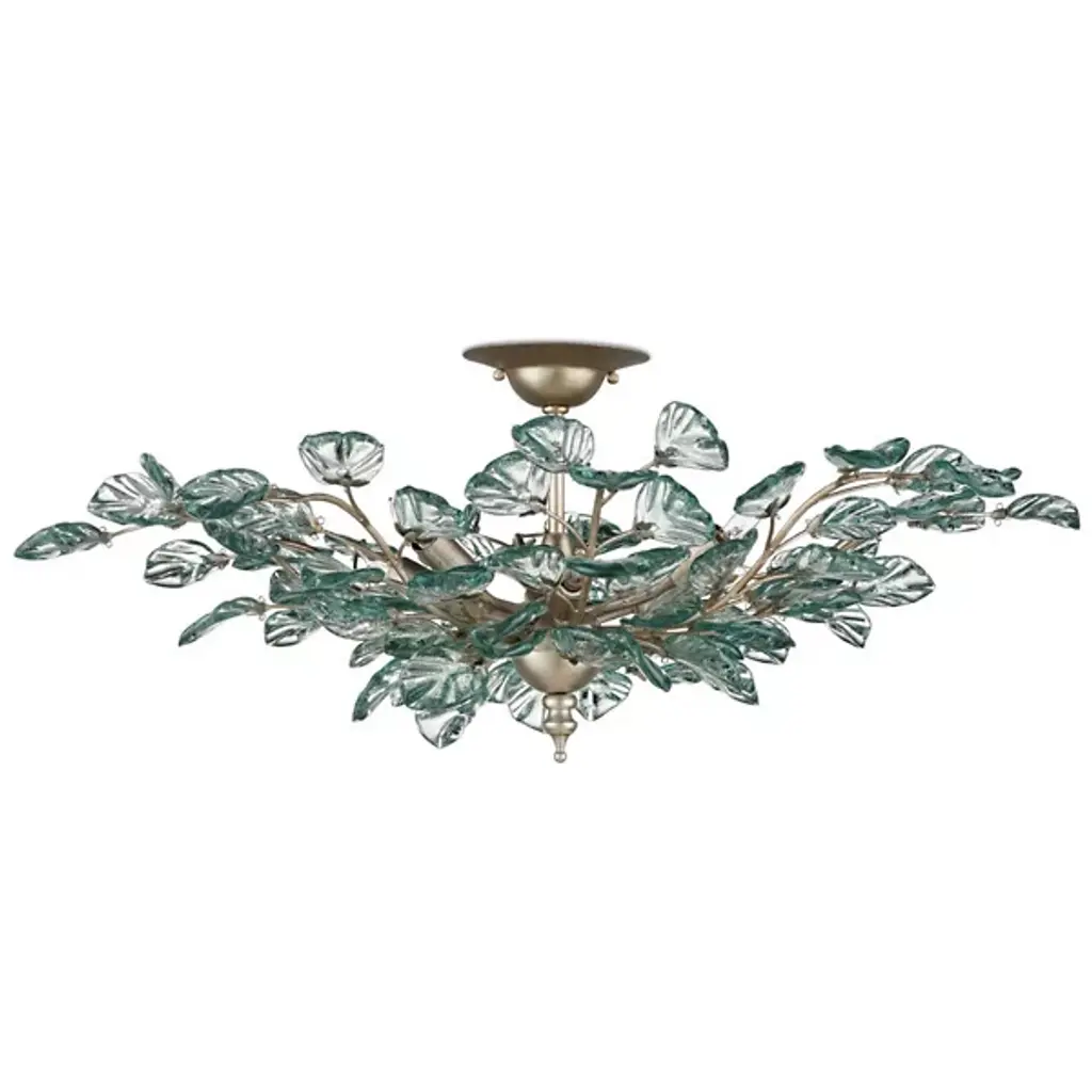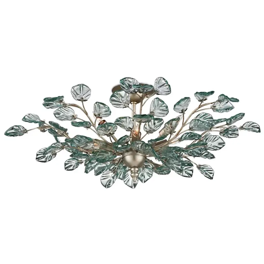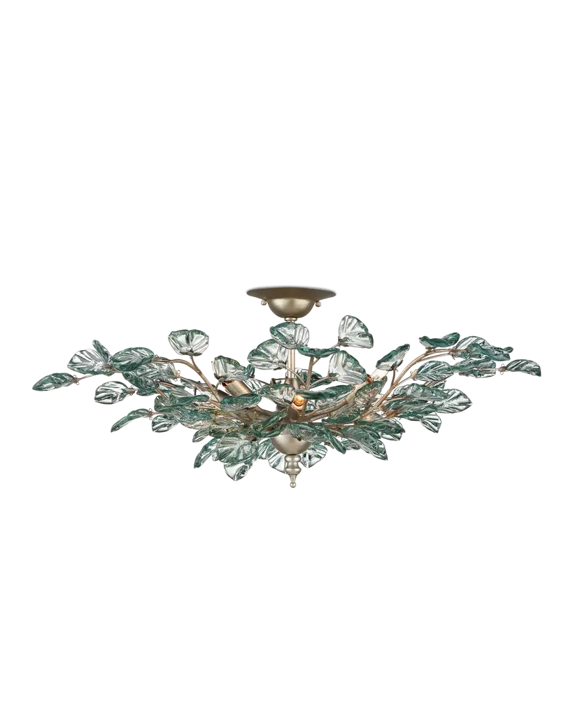 The Baobab Semi-Flush Mount from Currey & Company brings garden inspiration indoors through handcrafted glass leaves. Each recycled glass element appears to flutter in an unseen breeze, supported by metal stems that branch outward from the center. The arrangement captures a moment of natural movement in permanent form, suggesting leaves caught in a gentle wind. Light passes through the glass pieces, creating subtle patterns across surrounding surfaces. The combination of pressed glass technique with nature-inspired forms results in lighting that offers a fresh perspective on botanical themes.