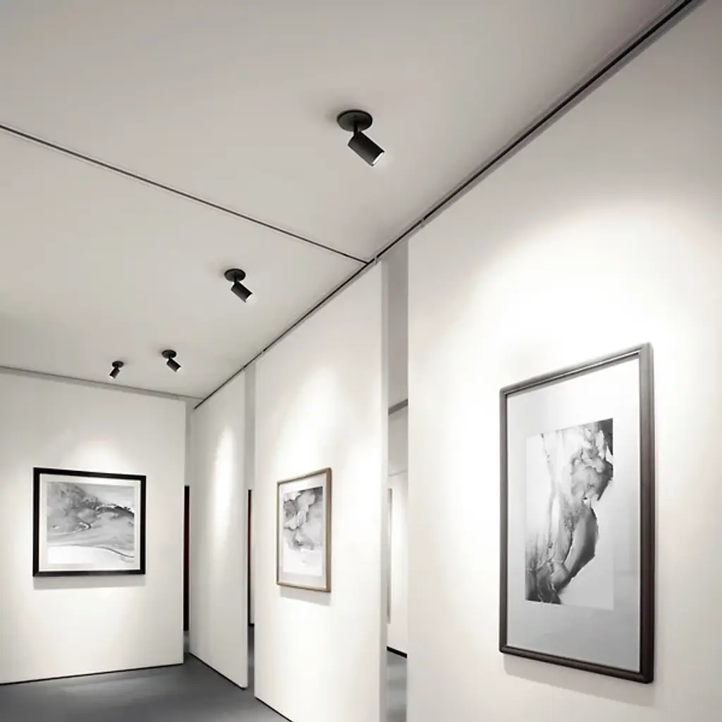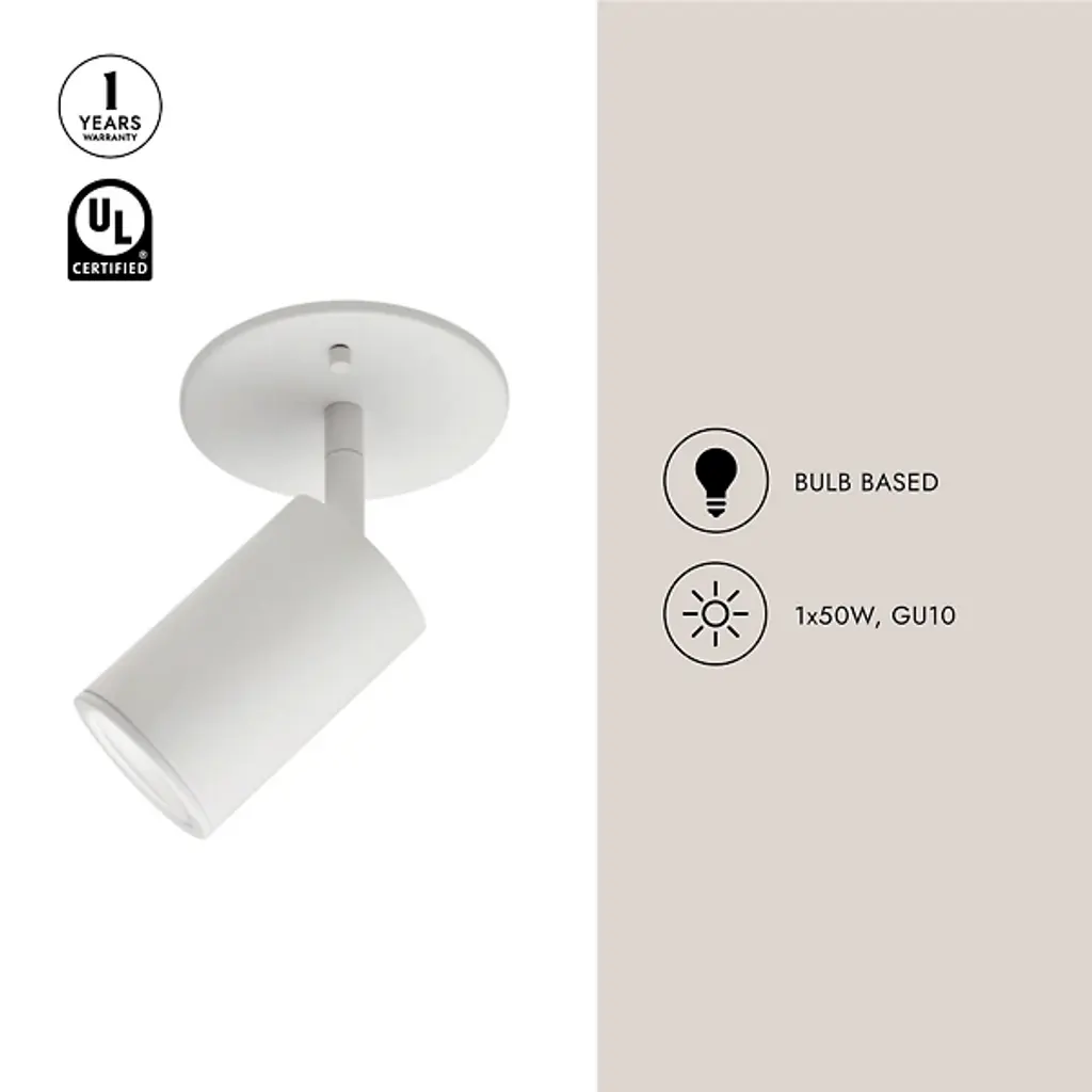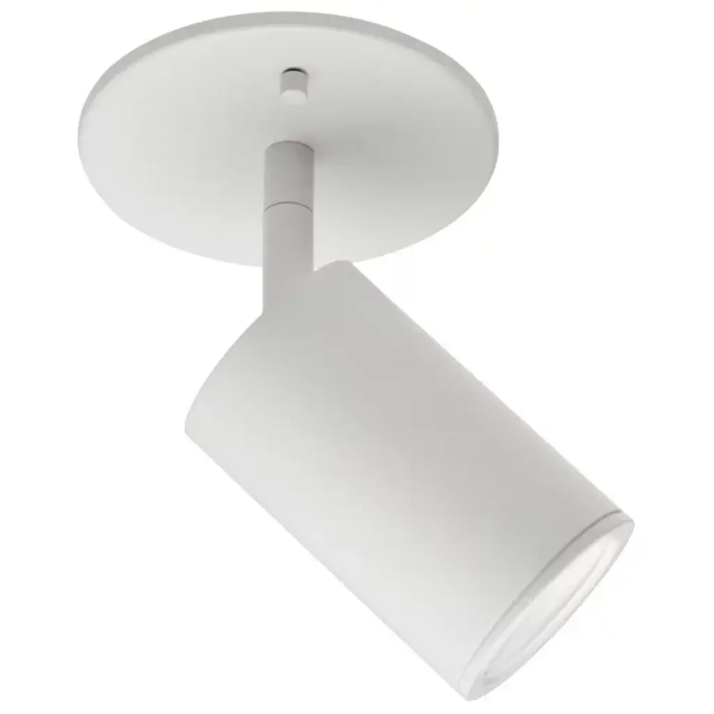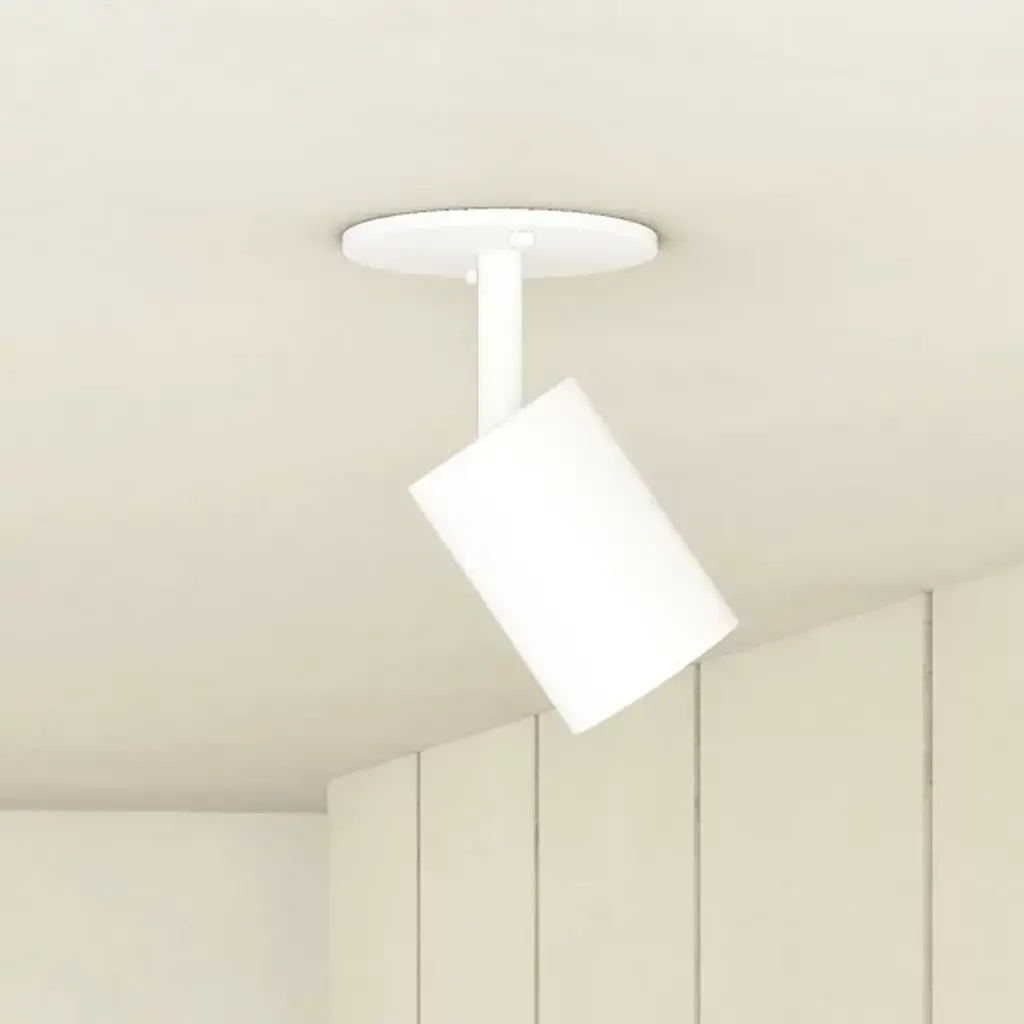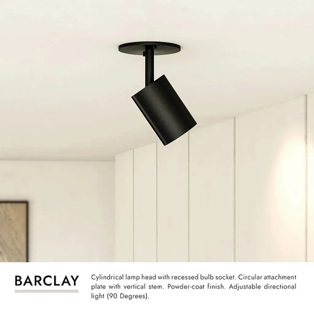 The Barclay Semi-Flushmount from Kuzco Lighting adapts commercial spotlight design for use in the home. The design centers on directional control through a pivoting cylindrical head that adjusts vertically up to 90 degrees from its circular ceiling canopy. This articulation allows users to shift between ambient ceiling wash and focused accent lighting applications. The adjustable downrod accommodates various ceiling heights, maintaining the fixture's proper proportion to the room while offering both practical flexibility and clean, modern styling.