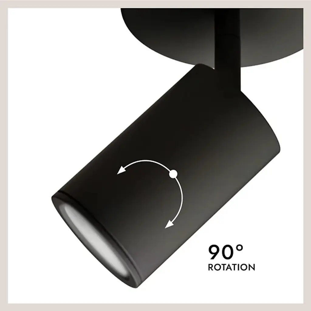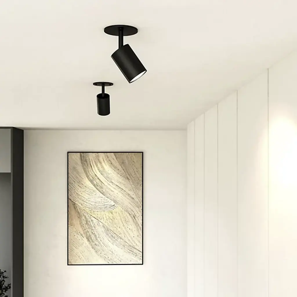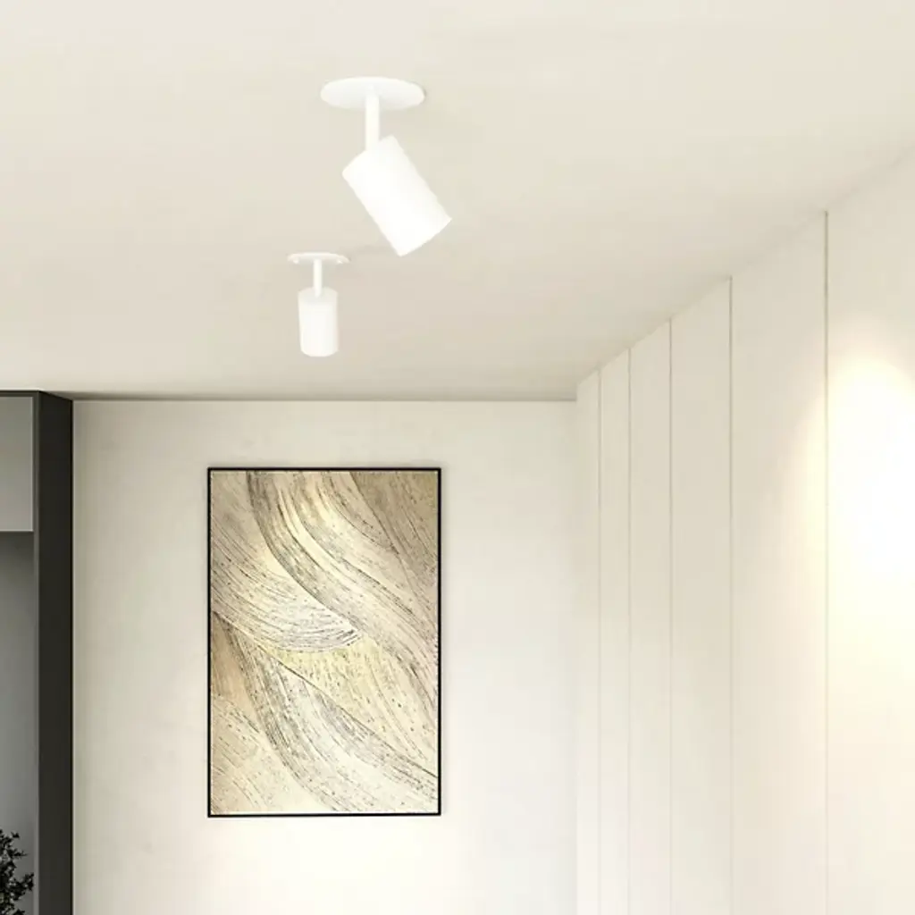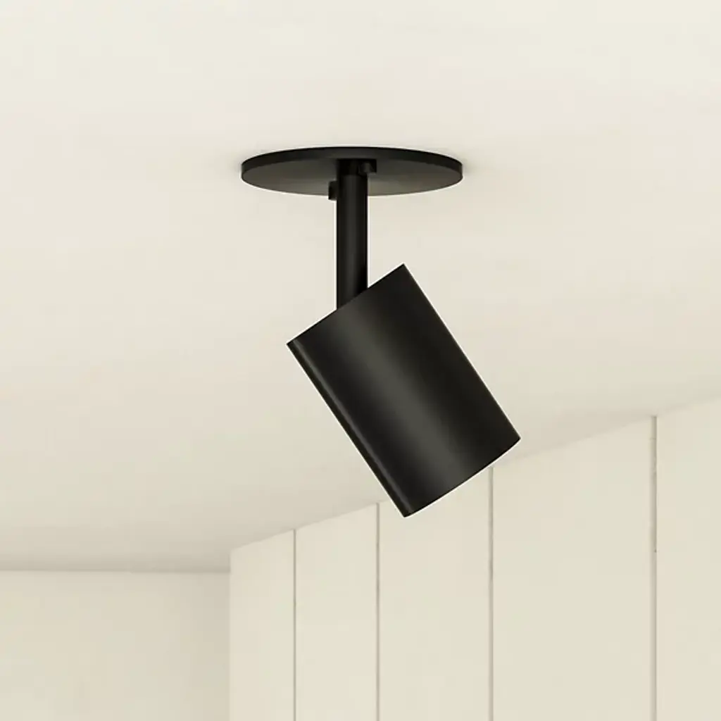 The Barclay Semi-Flushmount from Kuzco Lighting adapts commercial spotlight design for use in the home. The design centers on directional control through a pivoting cylindrical head that adjusts vertically up to 90 degrees from its circular ceiling canopy. This articulation allows users to shift between ambient ceiling wash and focused accent lighting applications. The adjustable downrod accommodates various ceiling heights, maintaining the fixture's proper proportion to the room while offering both practical flexibility and clean, modern styling.