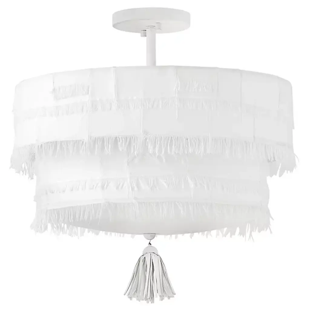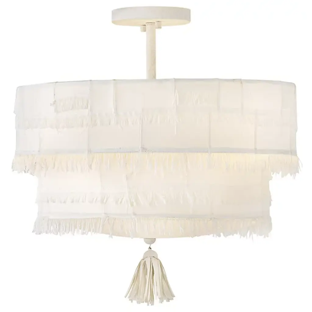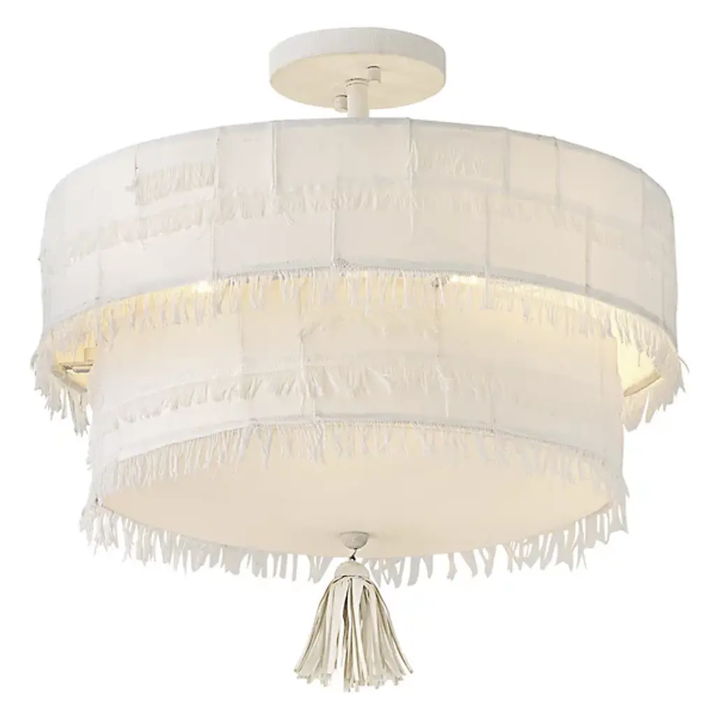 The Baya Semi-Flushmount from Hinkley brings artisanal craft to ceiling lighting through its carefully constructed fabric shade. Multiple tiers of hand-sewn patchwork create subtle dimension and texture. A leather tassel adds an unexpected finishing touch to this design inspired by current distressed fashion trends. The light filters gently through the layered material, while dimmable capabilities let you adjust the output. This fixture proves that thoughtful details can transform everyday materials into something extraordinary.