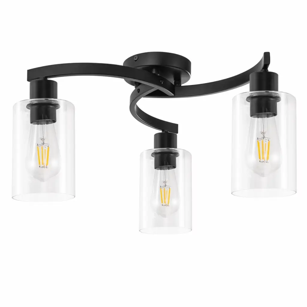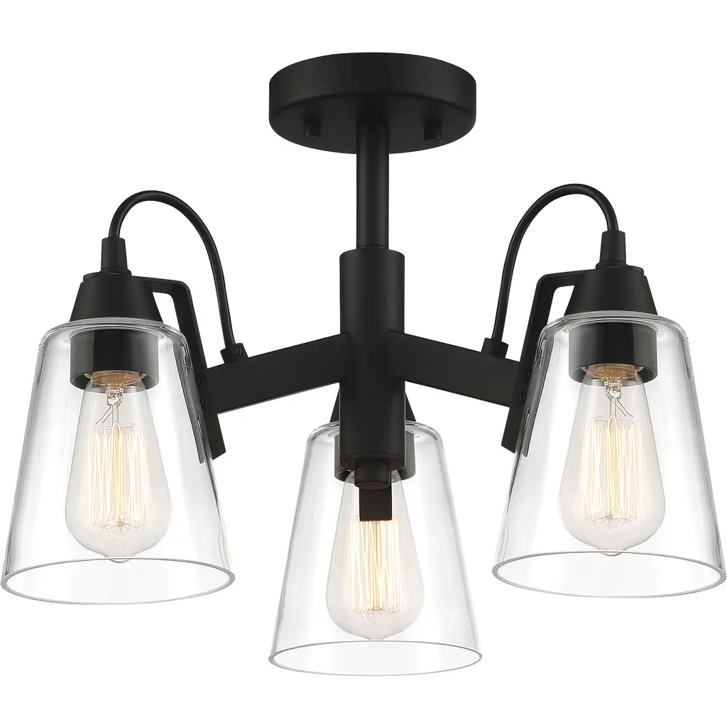 The Beckonridge Semi Flushmount by Minka-Lavery has a bold, structured feel that lends a handsome look to the spaces it brightens. Nestled close to the ceiling, this design is supported by a round canopy and short stem that a series of metal bars expand from, holding tapered glass shades with crisply bent metal frames. The metal tops of the shades are connected back to the main structure with visible wires, lending a pared-down, layered look to this design as it offers plenty of practical downlight to its surroundings.