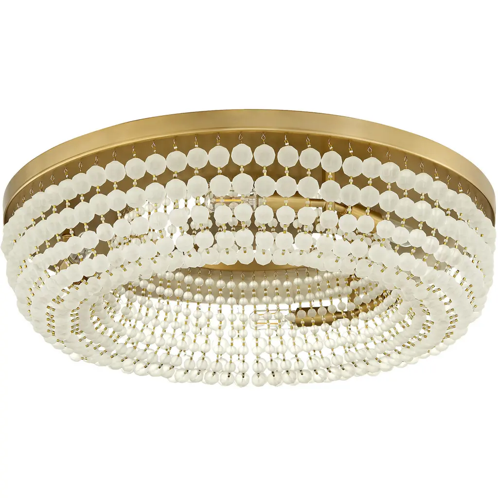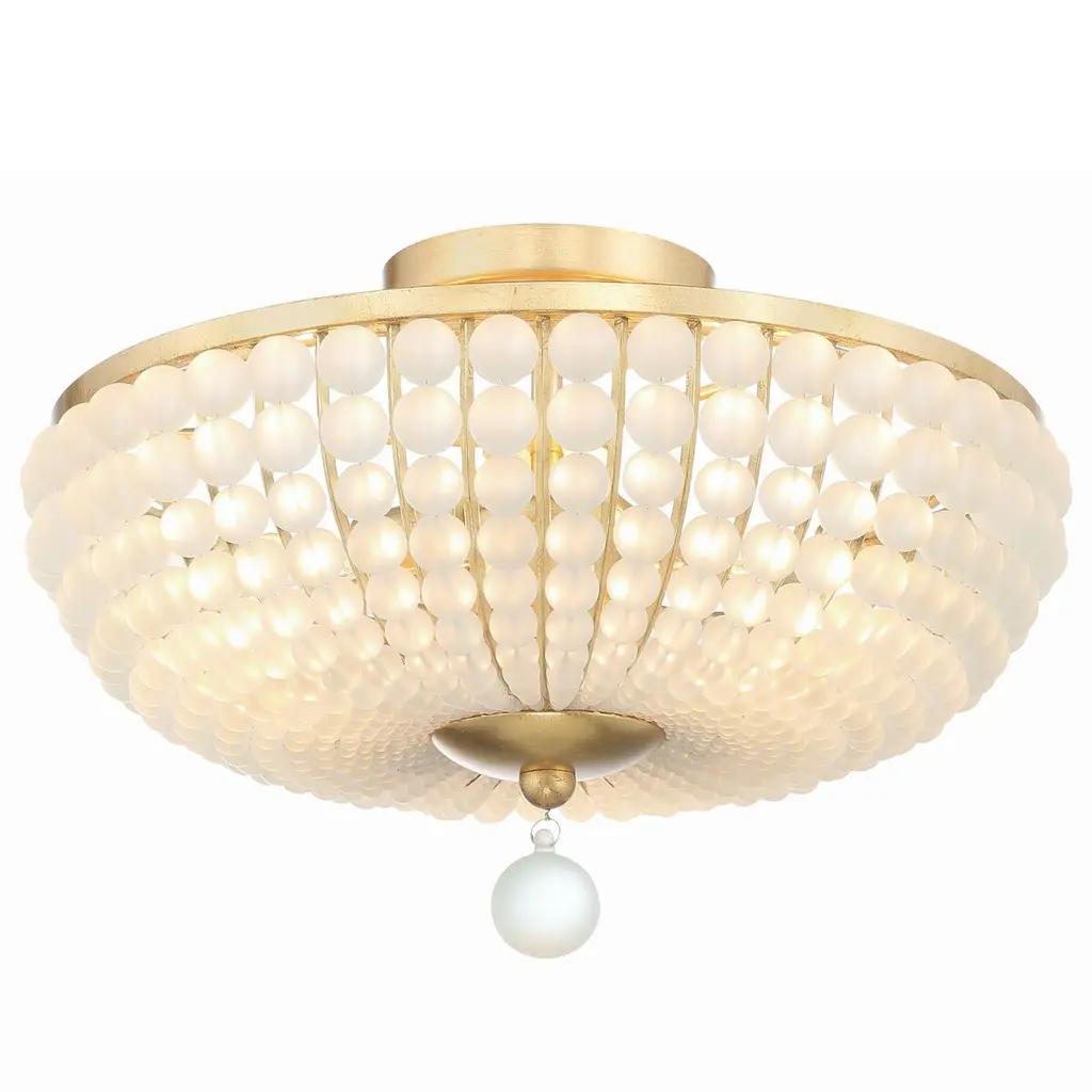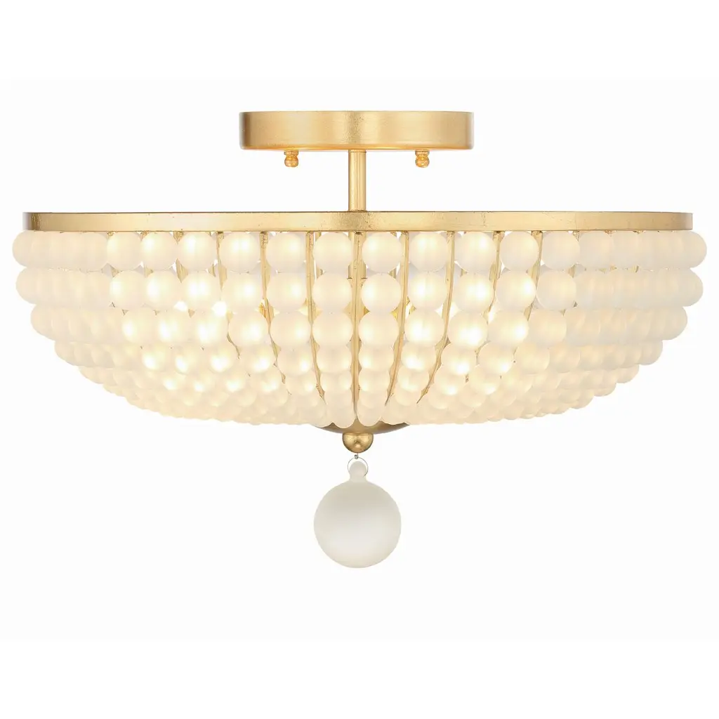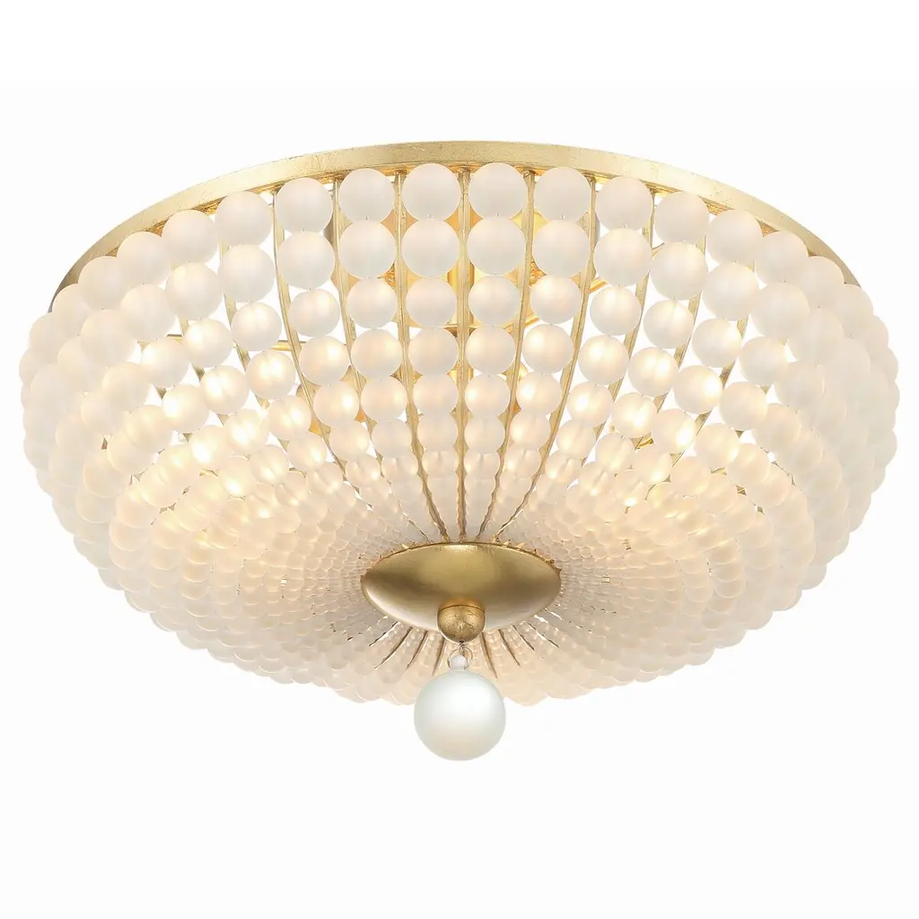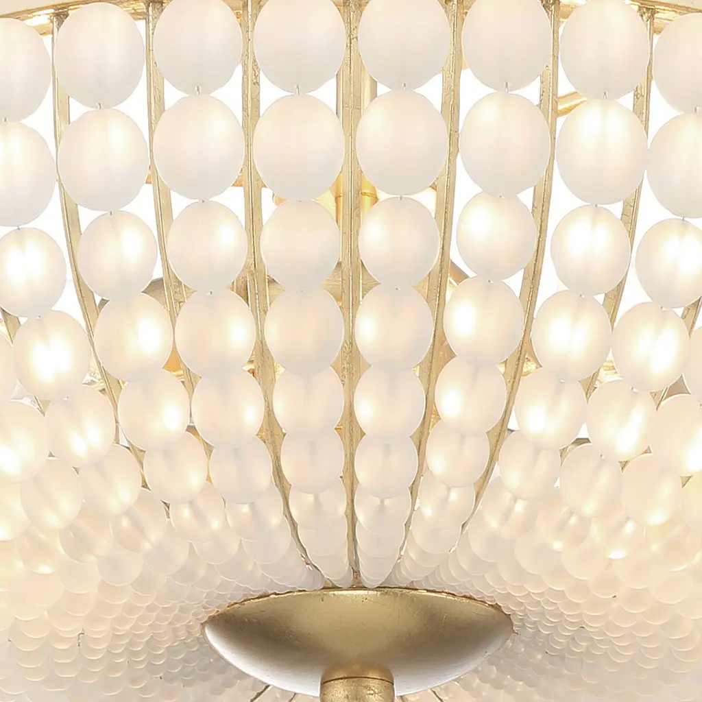 Add a touch of modern style to your décor with the frosted glass bead ceiling mount. The metal frame features glass beads sweeping downward and inward, connecting a larger hanging glass ball. This elegant contrast combined with frosted white glass adds a bold look to your indoor living areas.