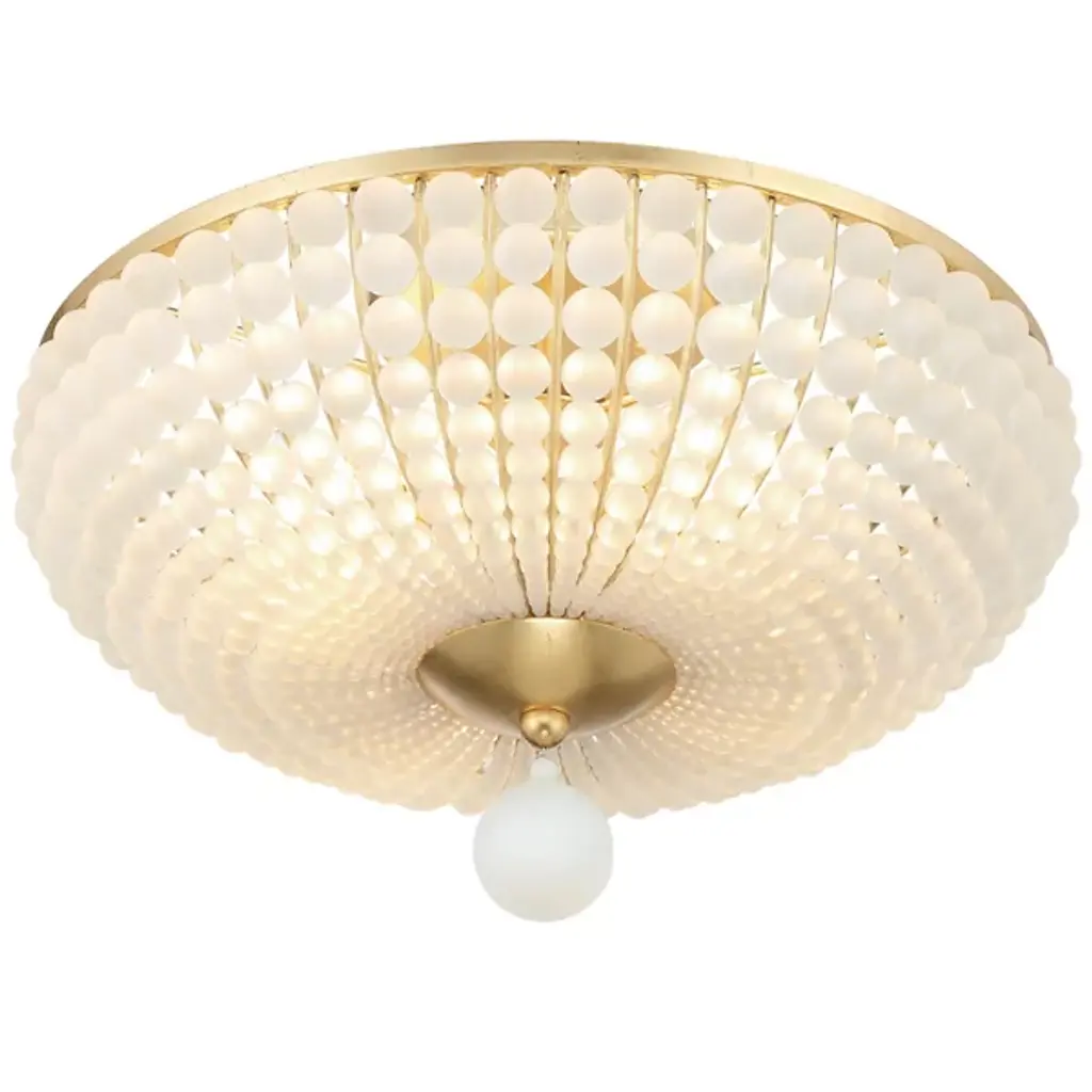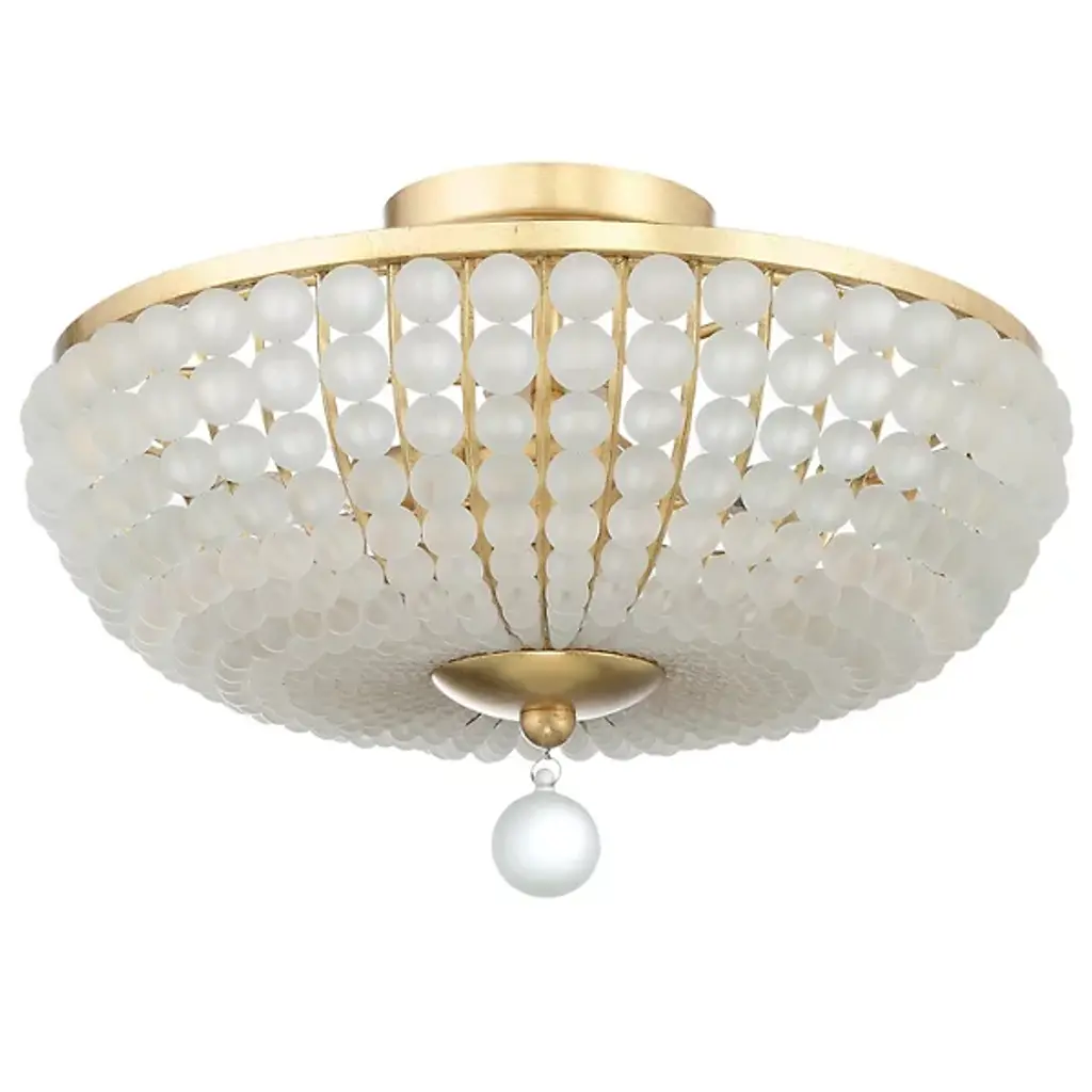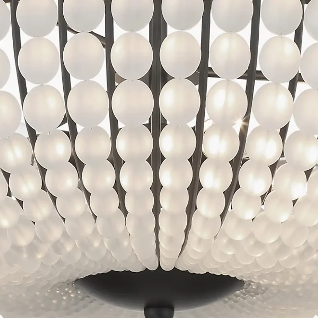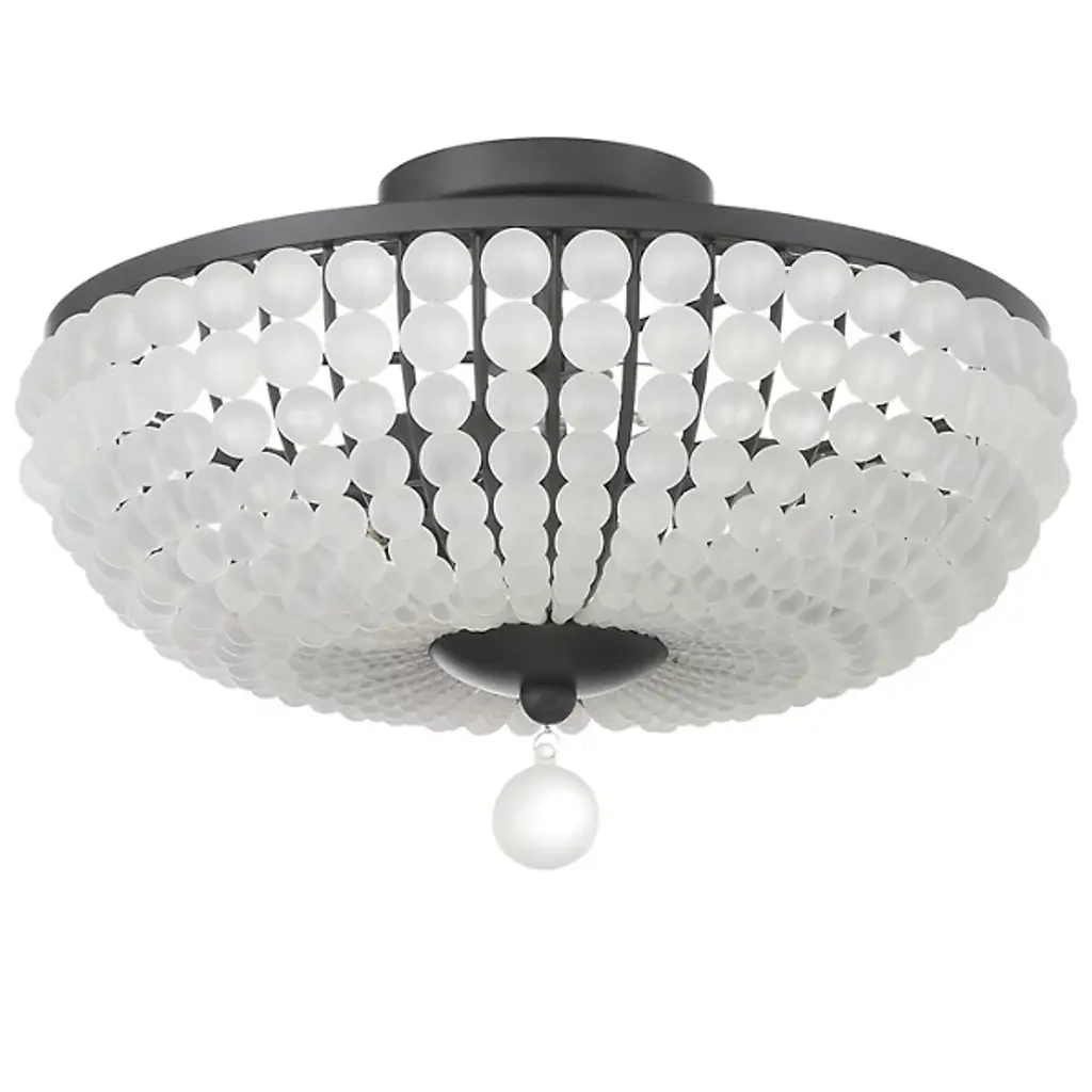 The Bella Semi Flushmount from Crystorama enhances décor with a modern touch. Its metal frame elegantly displays glass beads sweeping downward and inward, leading to a larger hanging glass ball. The captivating contrast and frosted white glass create a bold look that elevates the ambiance of indoor living areas. With contemporary sophistication, this exquisite light fixture becomes a charming focal point, adding allure to any space