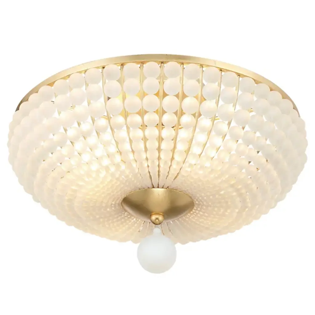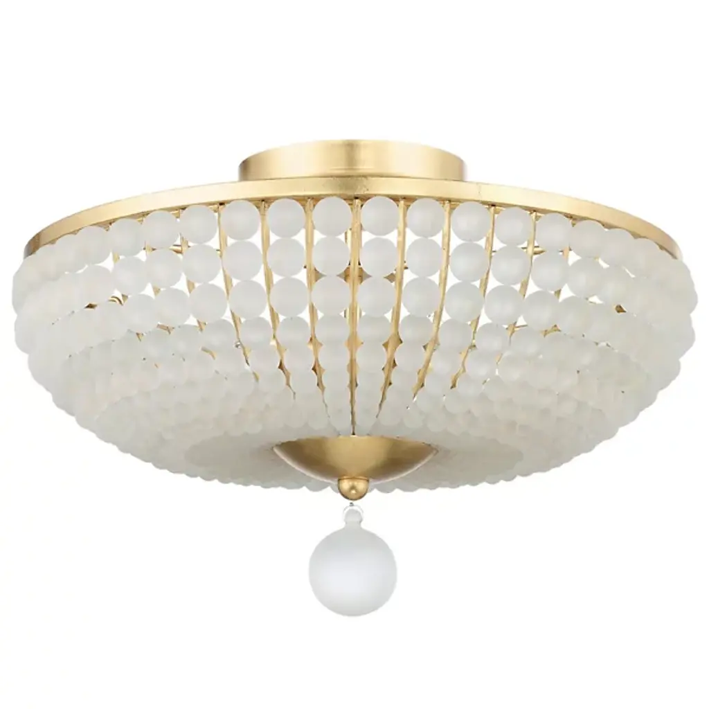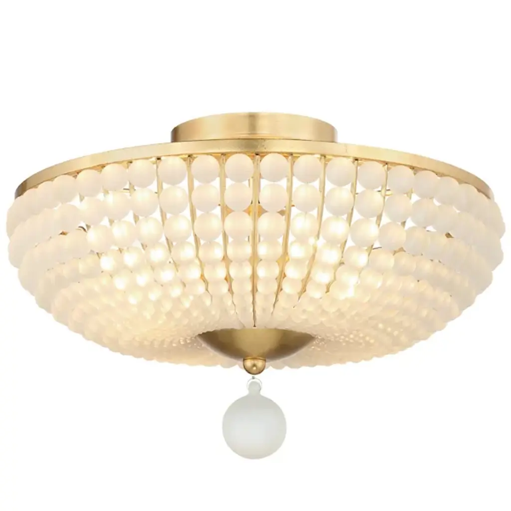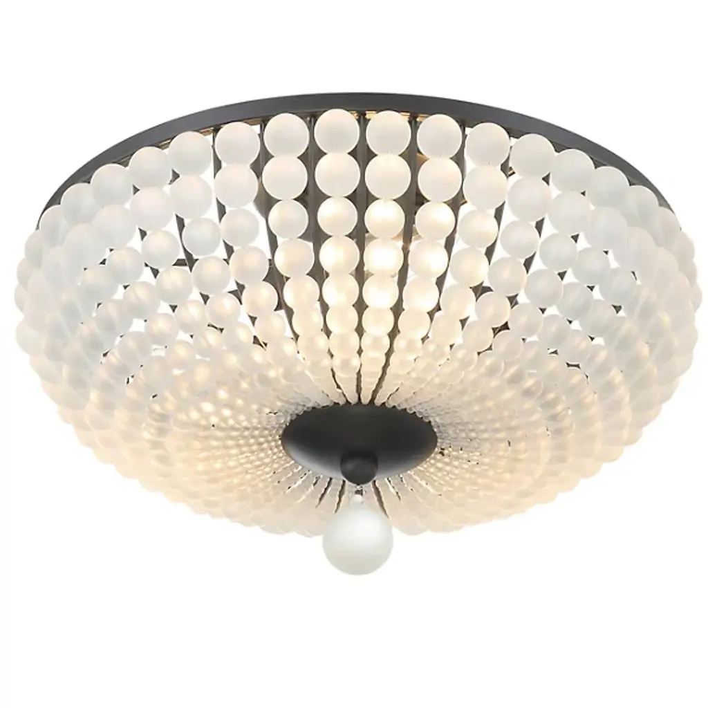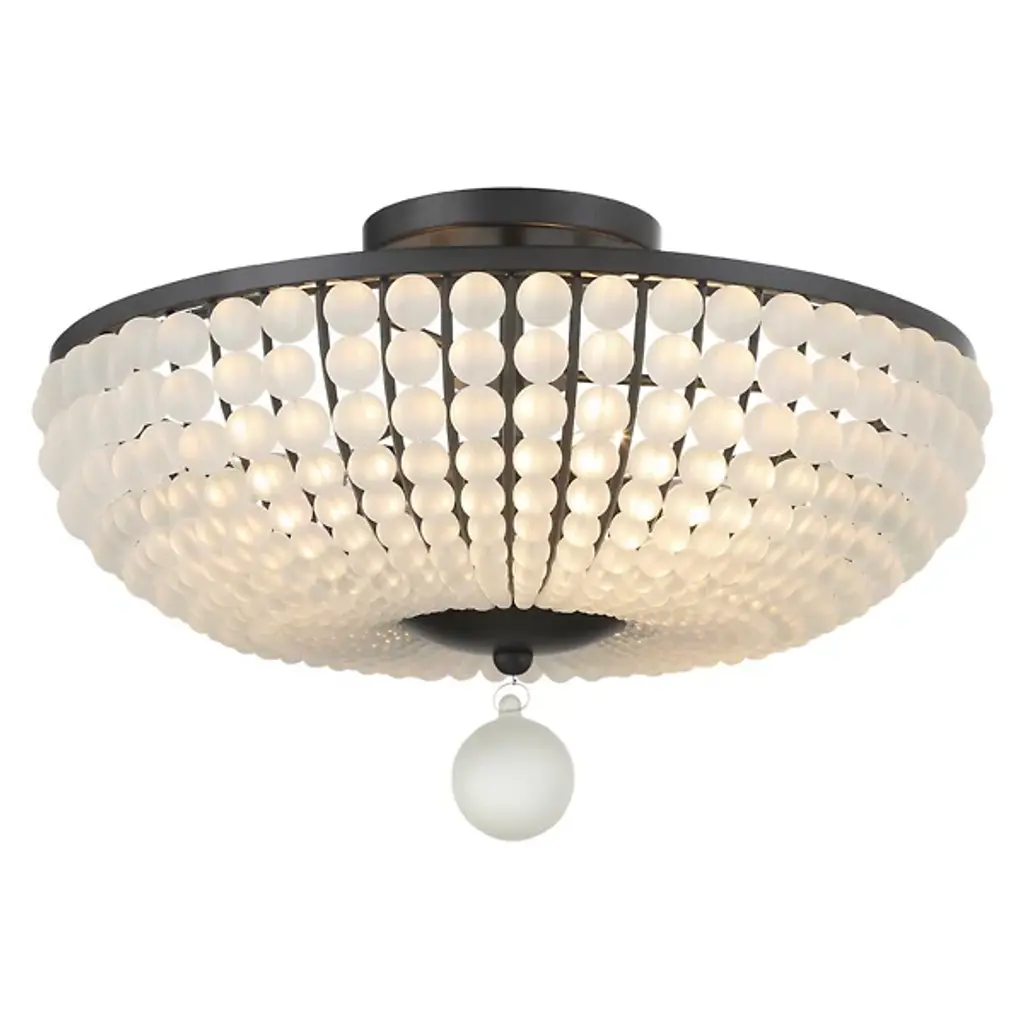 The Bella Semi Flushmount from Crystorama enhances décor with a modern touch. Its metal frame elegantly displays glass beads sweeping downward and inward, leading to a larger hanging glass ball. The captivating contrast and frosted white glass create a bold look that elevates the ambiance of indoor living areas. With contemporary sophistication, this exquisite light fixture becomes a charming focal point, adding allure to any space