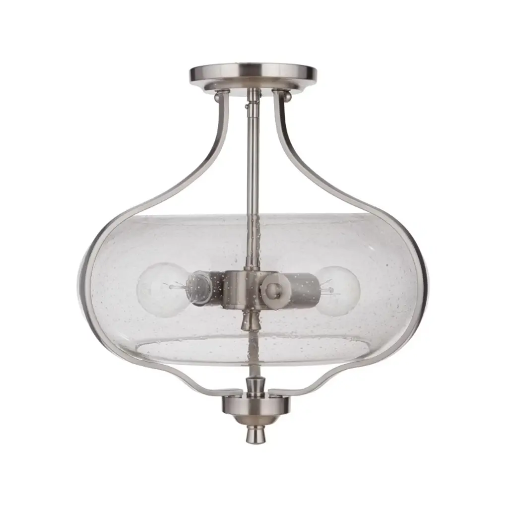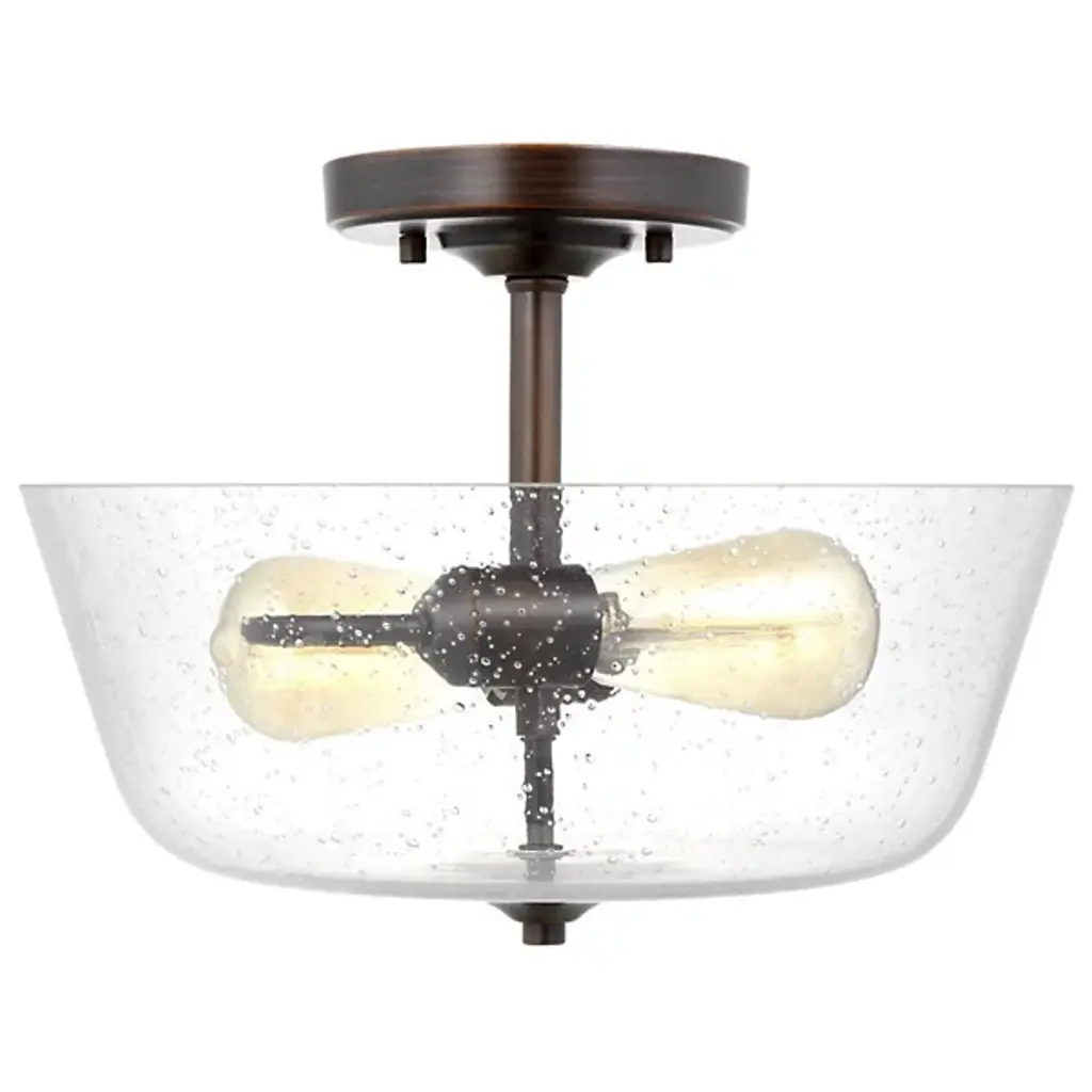 The industrial-inspired Belton Semi-Flushmount by Generation Lighting, formerly known as Sea Gull Lighting, is an ideal transitional piece that will add a touch of vintage appeal to your living space. A steel body suspends a tapered bowl-like shade of seeded glass, and the Edison bulbs within are held in place by elegantly curved arms. A versatile, unique addition to the Belton collection, this fixture will accentuate and elevate your home décor.