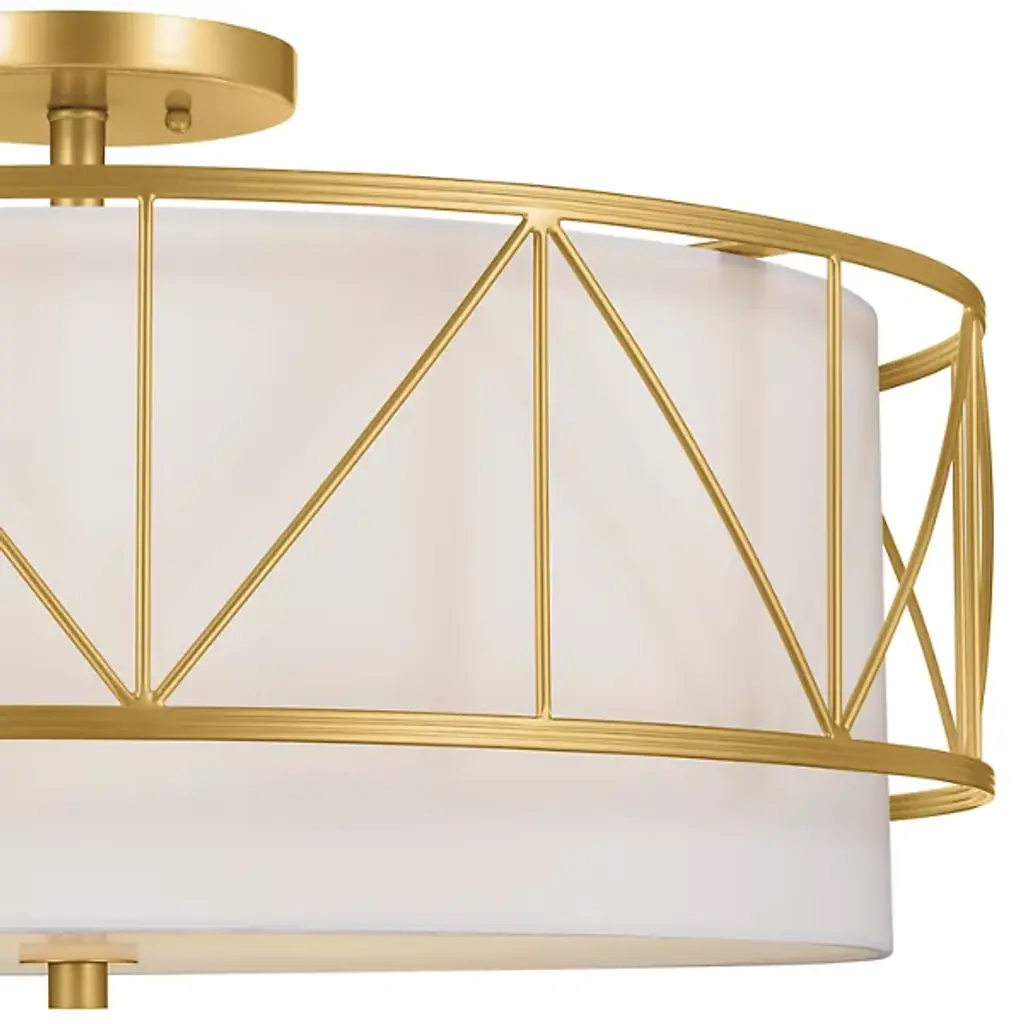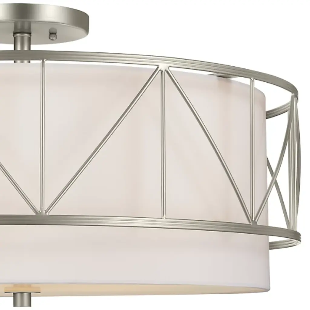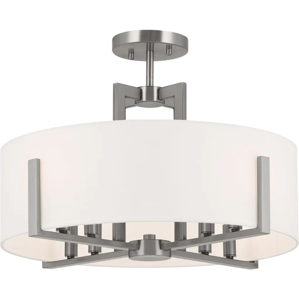 Give your living area a mid-century modern look with the Birkleigh Semi-Flushmount by Kichler. The finest steel has been worked into the shape of a drum. The framework of this light fixture takes on a triangulating pattern that encircles a lovely white fabric shade. The Birkleigh Semi-Flushmount maintains suspension in midair through attachment to a downrod connected to a ceiling canopy. The hanging nature of your semi-flushmounts makes it well-suited for the role of hallway light.
