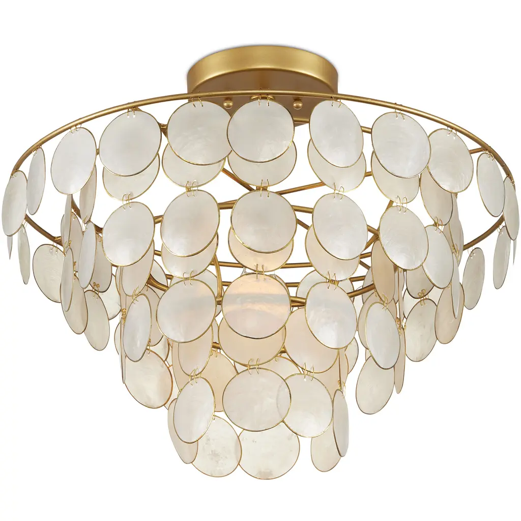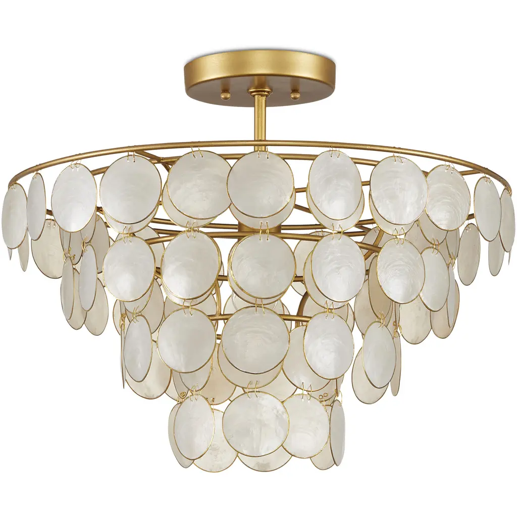 Ethereal in its make-up, the Bon Vivant Small Semi-Flush Mount was designed by Tom Caldwell. The discs that effervesce with illumination are made of Capiz shells ringed with a decorative metal edge. These match the contemporary gold finish on the rest of the fixture. The thinness of the wires that fasten the discs to the frame and to each other is a sophisticated design detail. This gold semi-flush is convertible to a chandelier when the lower canopy is removed.