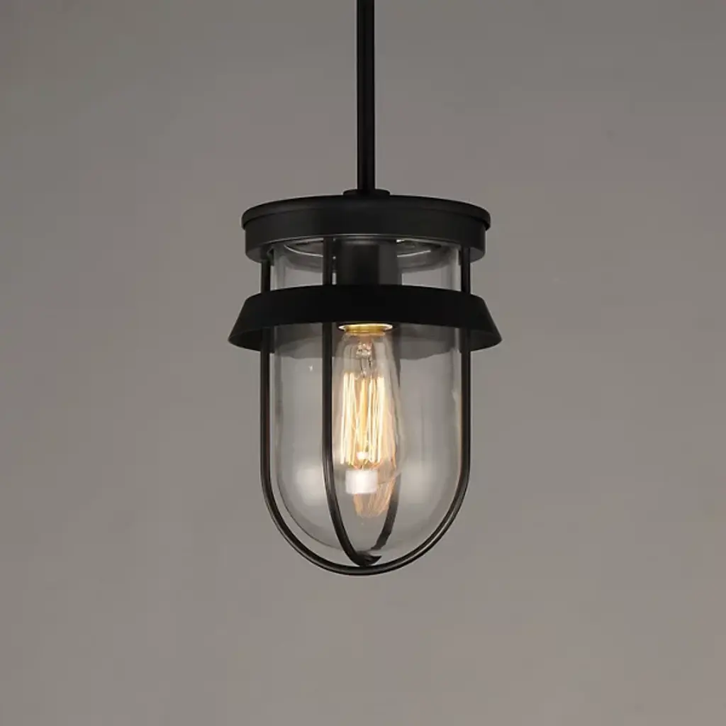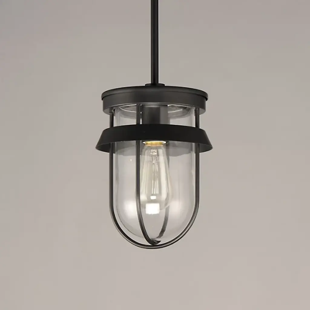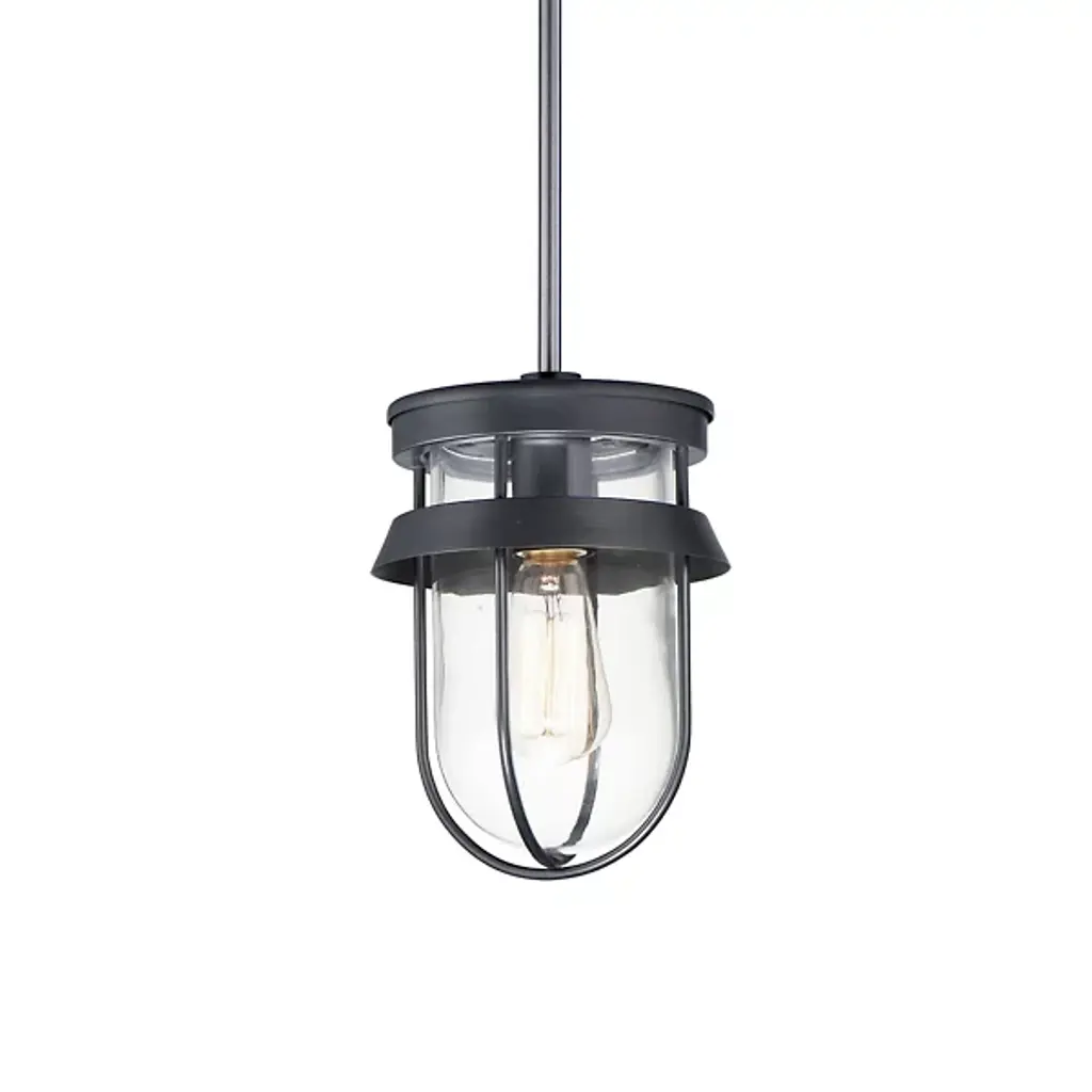 The Breakwater Outdoor Semi-Flushmount / Mini Pendant by Maxim Lighting brings a bold, industrial take on coastal lighting to spaces. Durably designed, a single downrod supports this piece as a flat top and angular ring adds a defined touch to a rounded body with an open cage underneath. A clear glass shade twists and locks into the frame for easy bulb replacement and maintenance, allowing the single visible source within to shine evenly out onto surroundings.