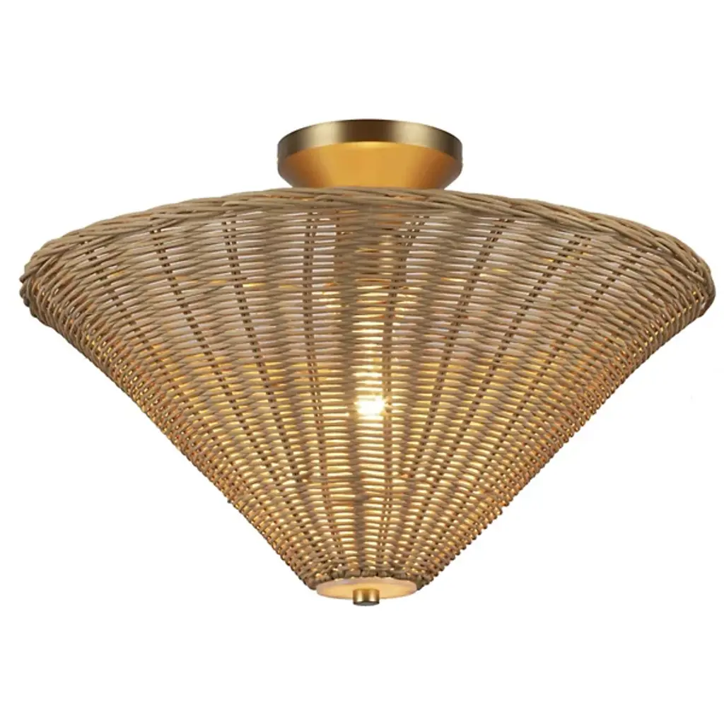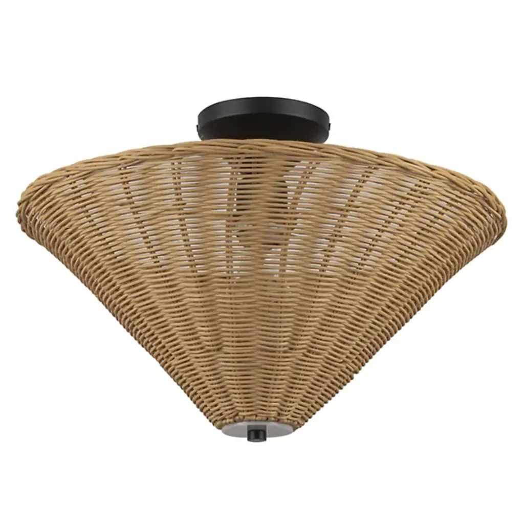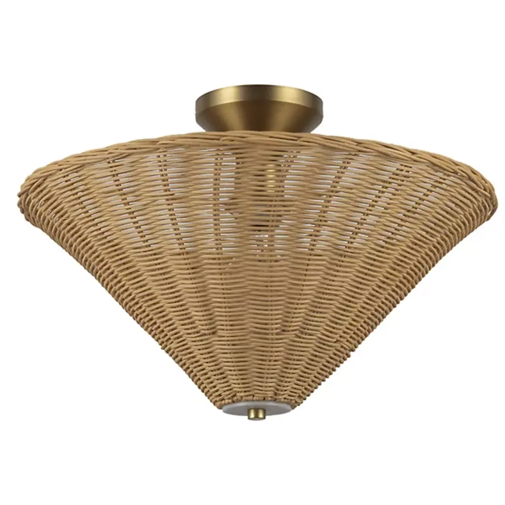 The Bridgette Rattan Semi-Flushmount from Alora Mood brings natural texture and relaxed charm to overhead lighting. Designed by Peyton Fox, this transitional design features a compact steel structure paired with a flared rattan shade that surrounds the light source. The woven material diffuses a gentle glow while casting soft reflections on the stem above, adding depth and warmth to the space. Perfect for dining areas, kitchens, or cozy corners, the design pairs casual style with a simple, thoughtfully composed form.