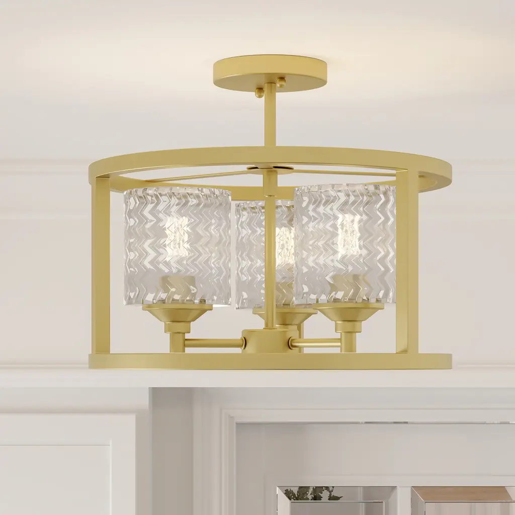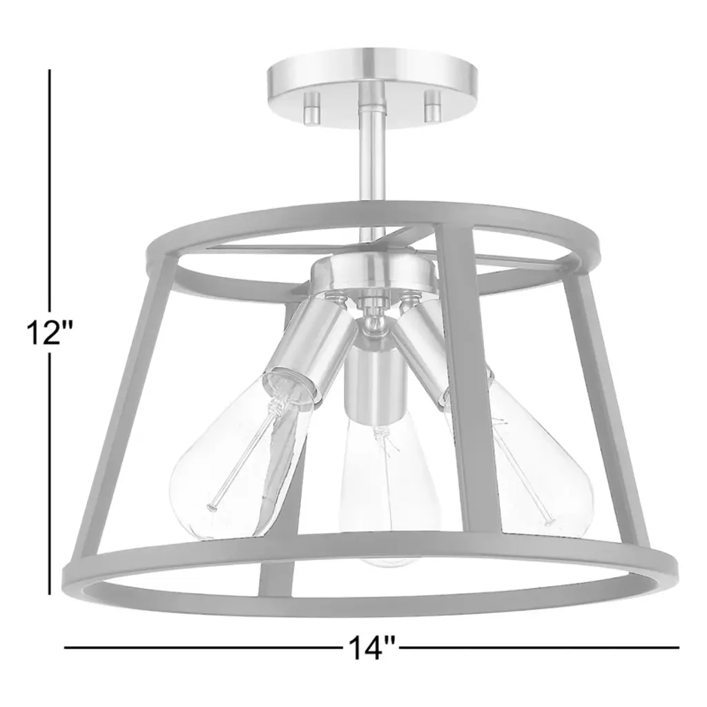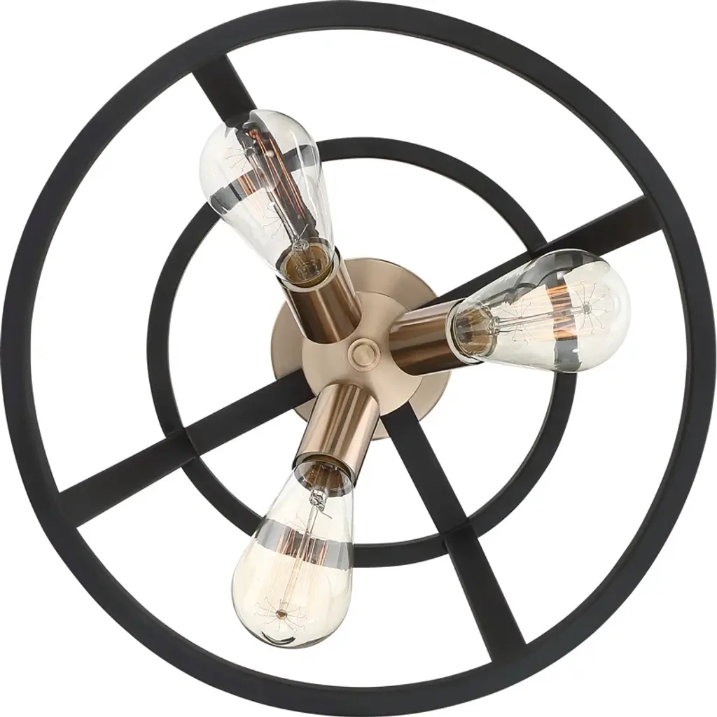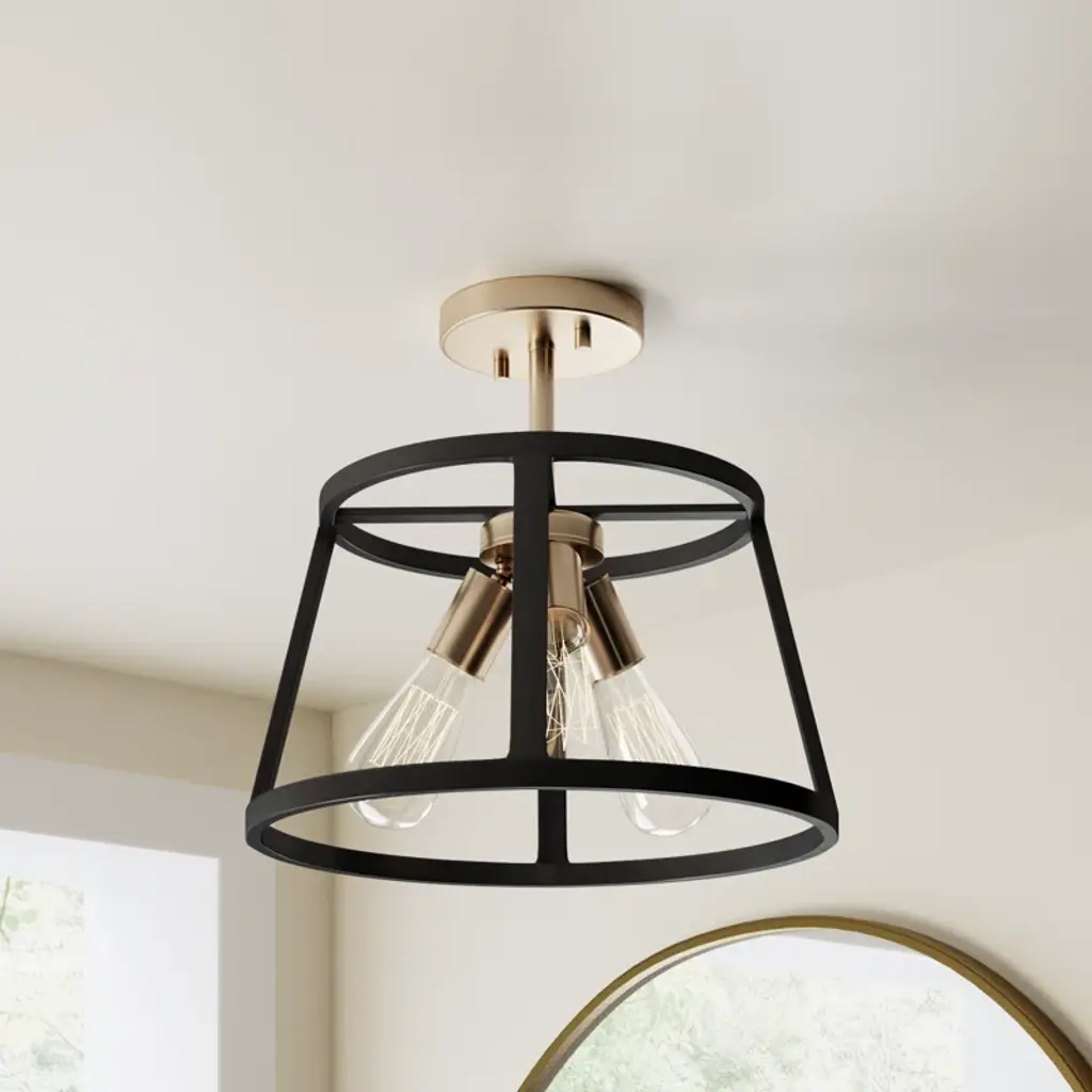 Providing the look of a classic shade with a modern industrial twist, this semi-flush mount features a round, geometric canopy outfitted in a matte black hue. 3 cylindrical sockets with room for 3 bulbs (not included) are angled in different directions, and finished in a copper brushed brass hue for added sparkle and shine. For a cohesive aesthetic, a brass backplate helps mount this piece to your ceiling, while the short downrod makes it ideal for smaller spaces. Best of all, it’s compatible with sloped ceilings and LED bulbs.