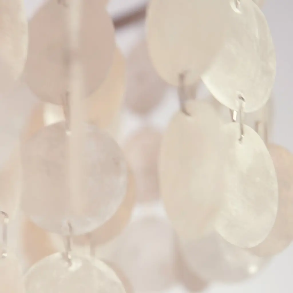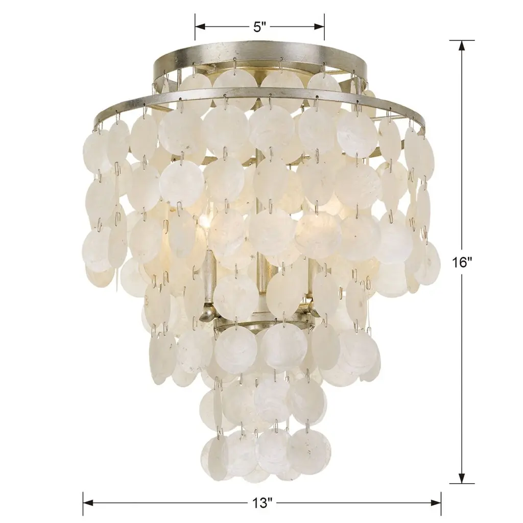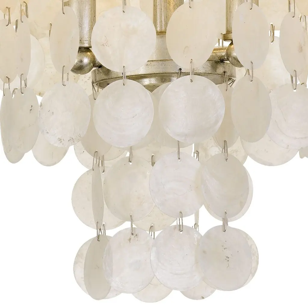 A naturally elegant addition to any room, this luminous semi-flush mount is framed in steel with an antiqued silver finish and embellished with tiers of shimmering capiz shells. Hardwired.