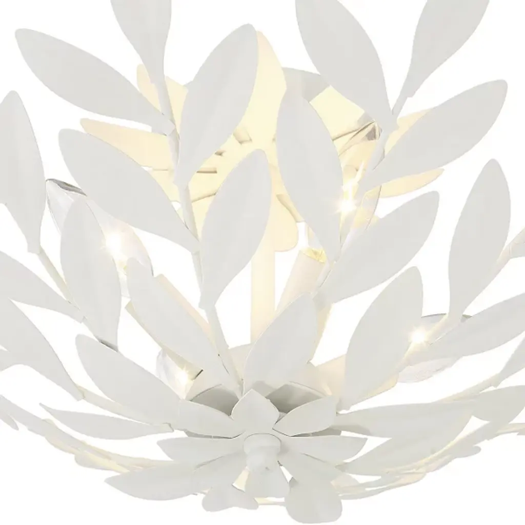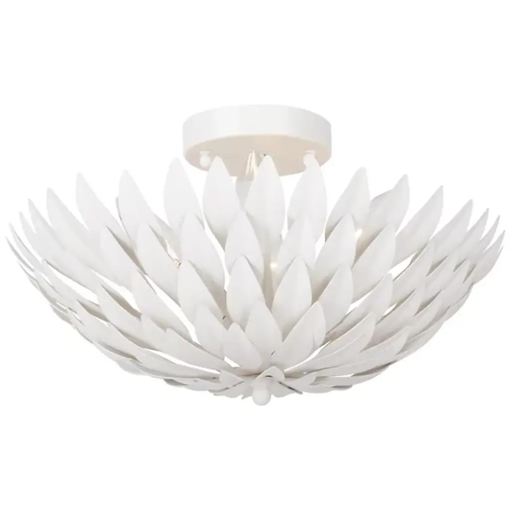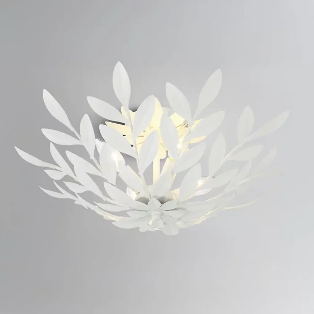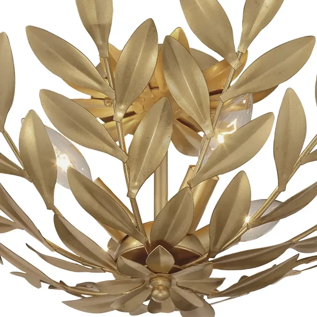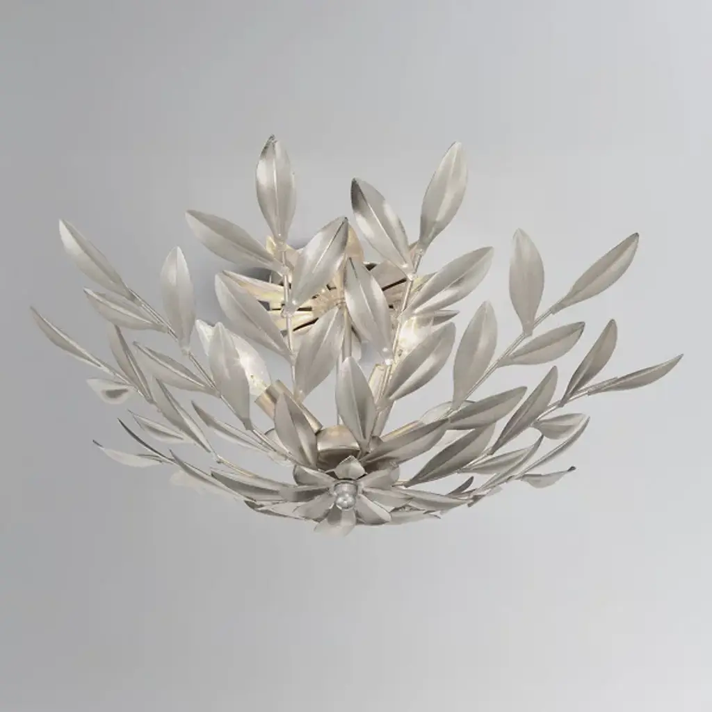 The Broche Semi-Flushmount from Crystorama features individually crafted wrought iron leaves, creating a striking and functional design with a unique, shimmering metallic finish. Its refined floral aesthetic brings tailored elegance, making it ideal for transitional interiors while remaining versatile enough to suit modern spaces. Perfect for bedrooms, living areas, or kitchens, it adds a touch of glamour wherever placed, offering a stylish statement piece that enhances both ambiance and visual appeal throughout the home.