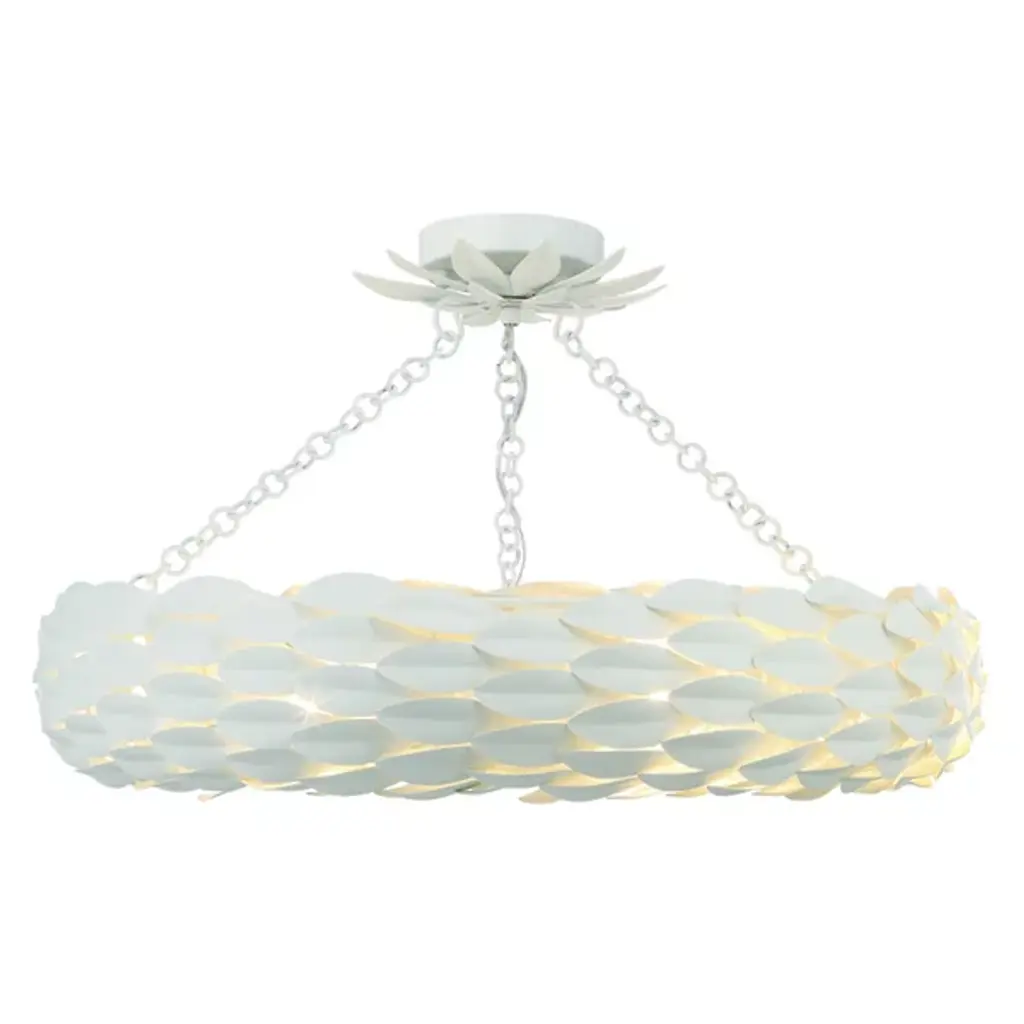 The Broche Semi Flushmount from Crystorama is a masterpiece that seamlessly combines traditional and modern aesthetics. This fixture radiates timeless elegance through its candelabra-style frame adorned with white linen shades. The intricately layered wrought iron leaves create a stunning visual and serve as a functional display of light. Whether gracing a bedroom, living area, or kitchen, this product infuses a touch of refined glamour into any space, making it an ideal choice for transitional and modern design themes.