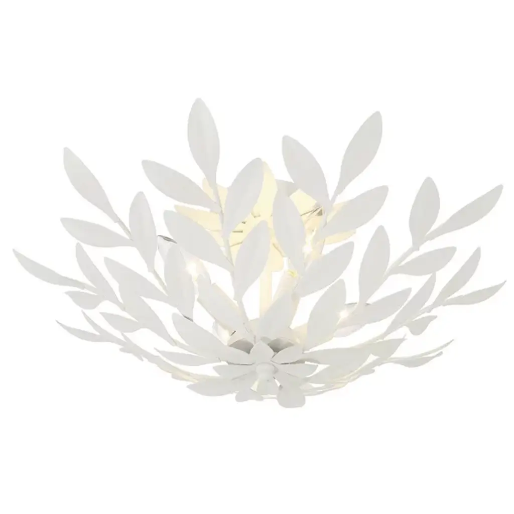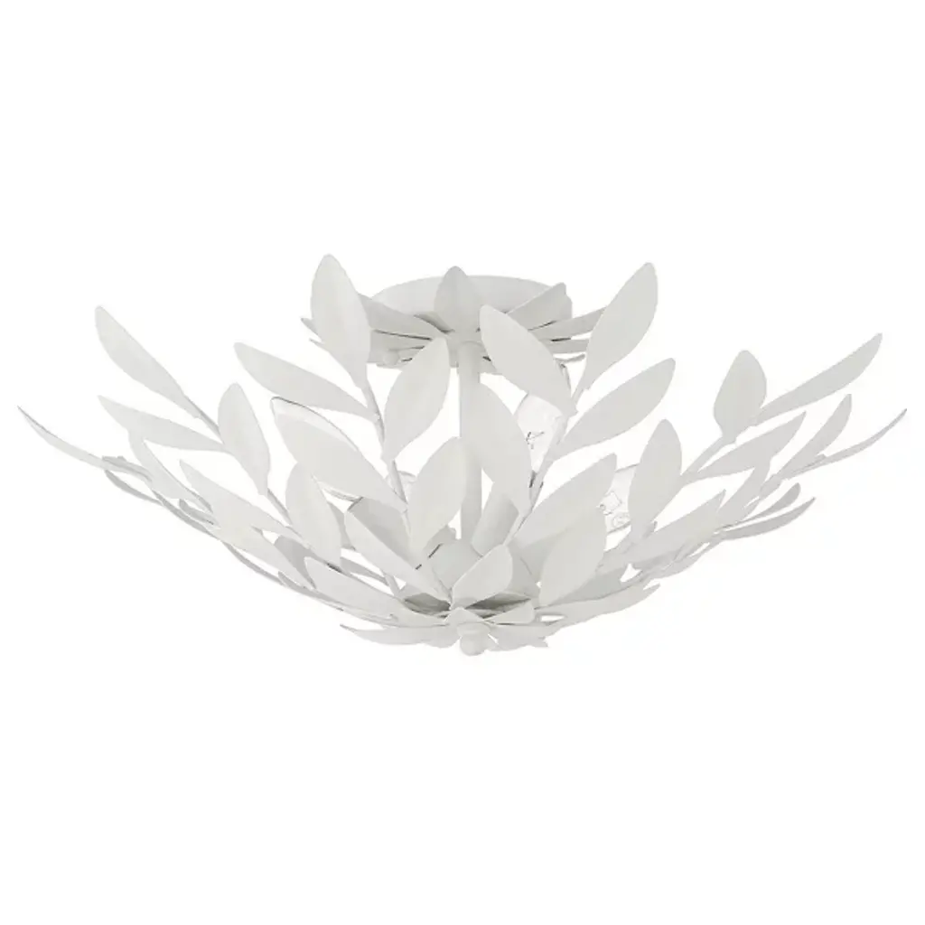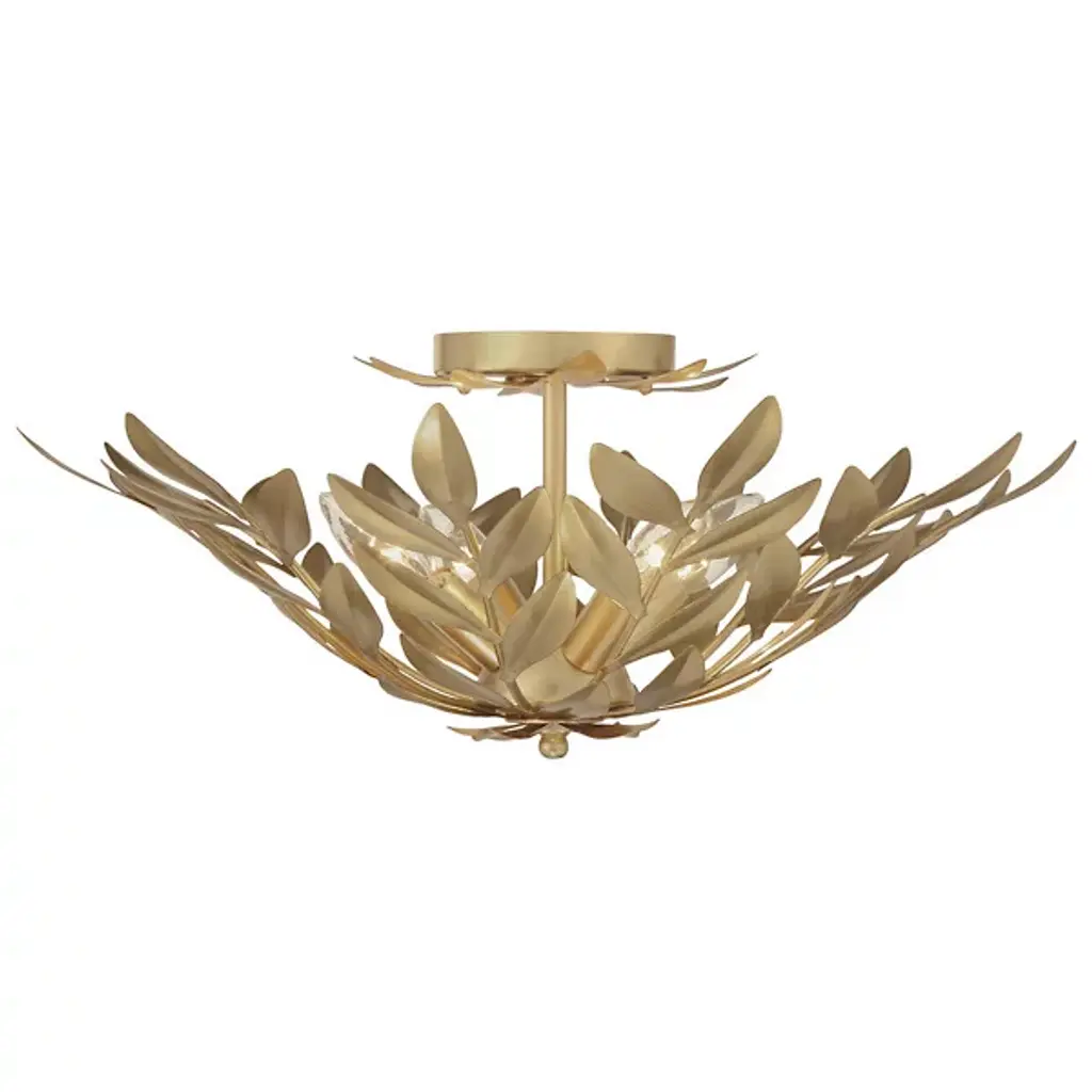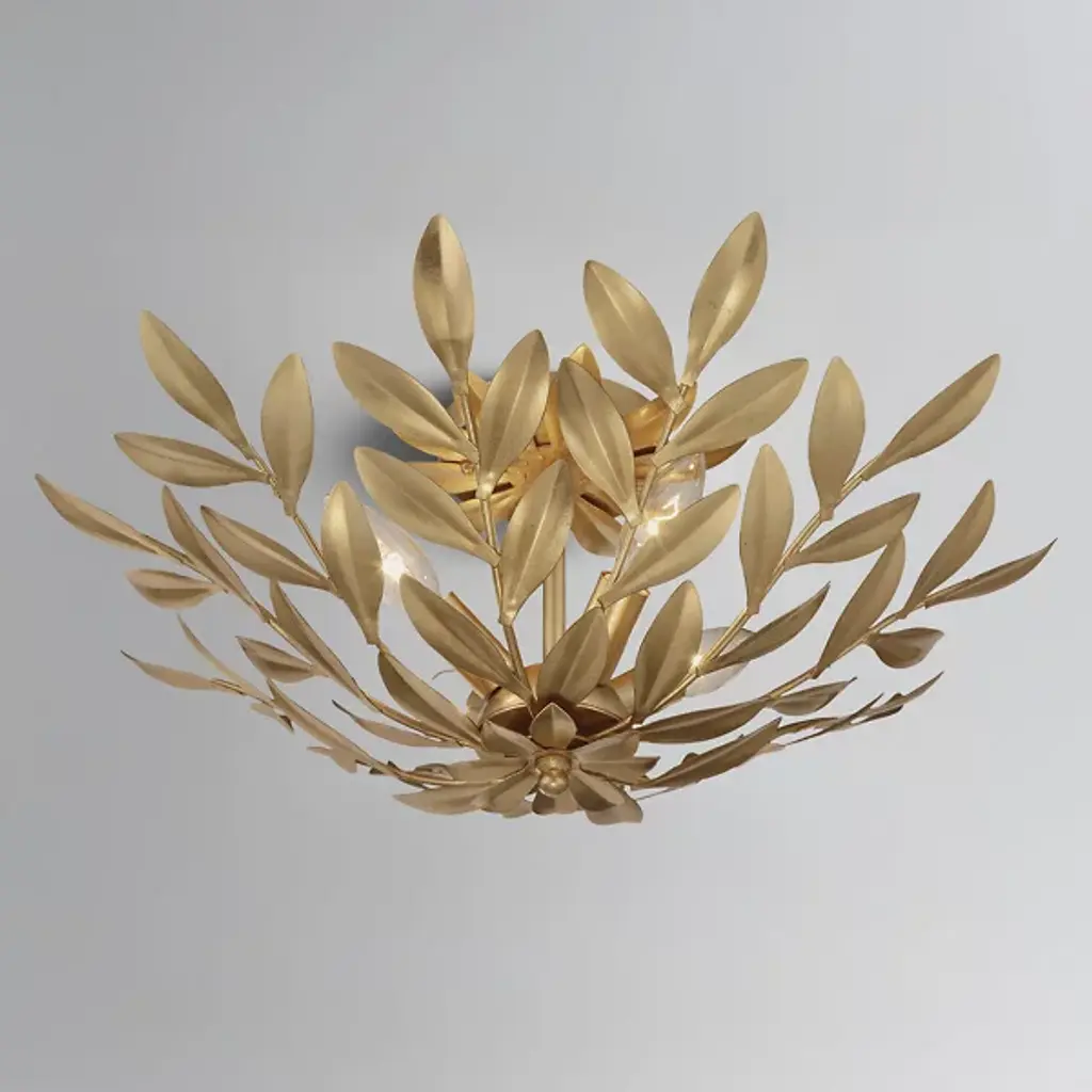 The Broche Semi-Flushmount from Crystorama features individually crafted wrought iron leaves, creating a striking and functional design with a unique, shimmering metallic finish. Its refined floral aesthetic brings tailored elegance, making it ideal for transitional interiors while remaining versatile enough to suit modern spaces. Perfect for bedrooms, living areas, or kitchens, it adds a touch of glamour wherever placed, offering a stylish statement piece that enhances both ambiance and visual appeal throughout the home.