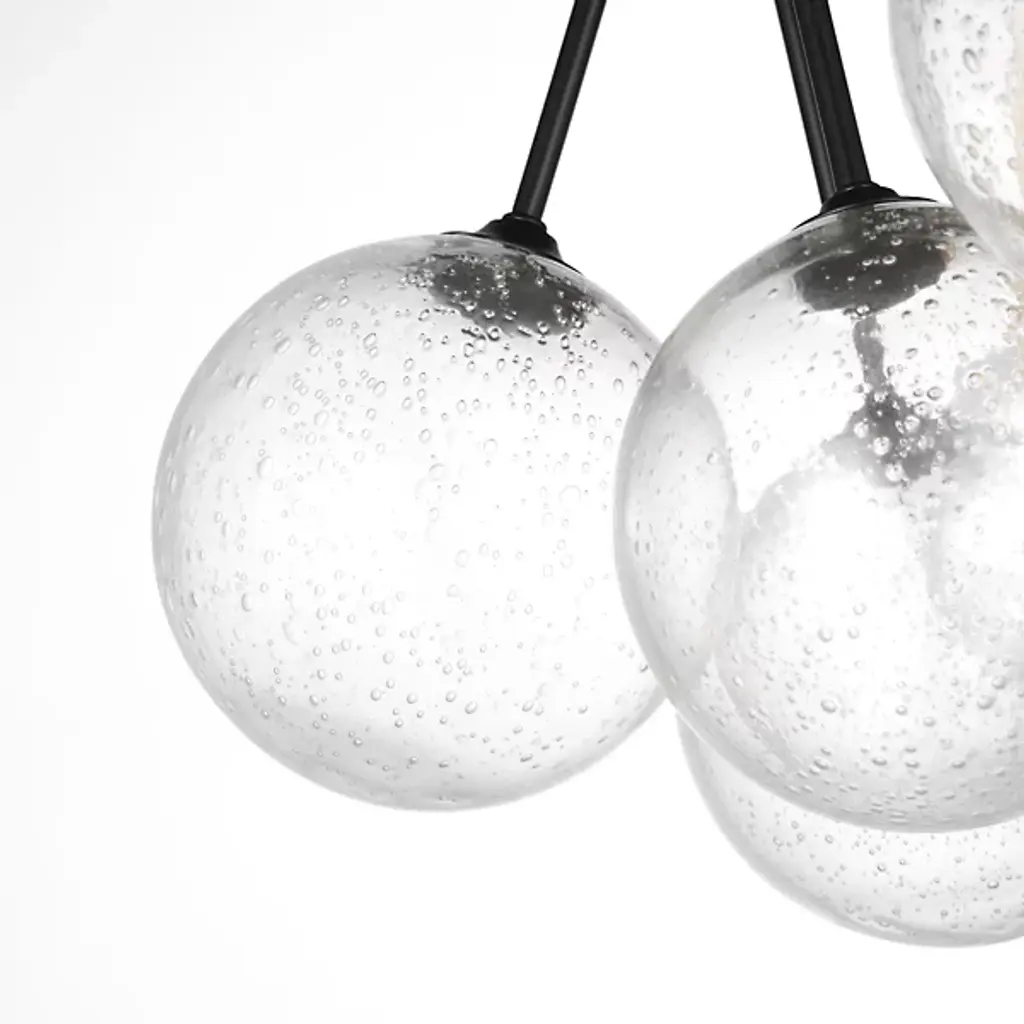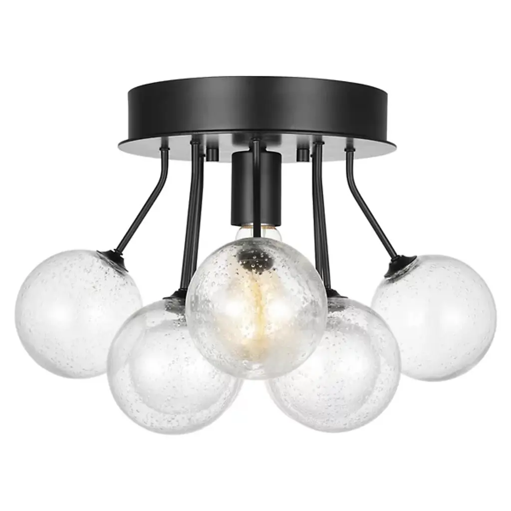 Enhance your interior spaces with the elegant lines of the Bronzeville Semi Flushmount from Visual Comfort Studio, formerly known as Sea Gull Lighting, A restrained mid-century modern design, it starts with a smooth-surfaced steel canopy that sends down a single socket from its central point. This damp-listed lamping is obscured from the sides by a series of glass globes held up by slender steel stems, some dropping directly downward while others are canted slightly outward. This sculptural construction blocks moderates direct glare from the sides into creating a pleasant glow all around the fixture.