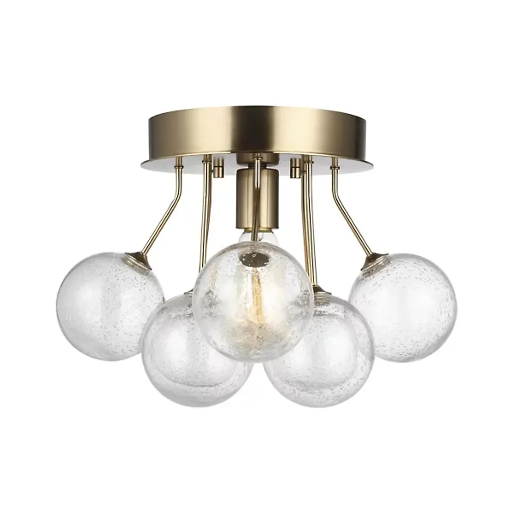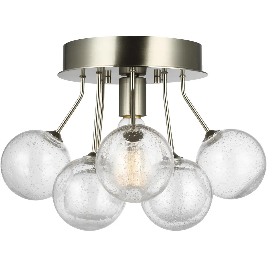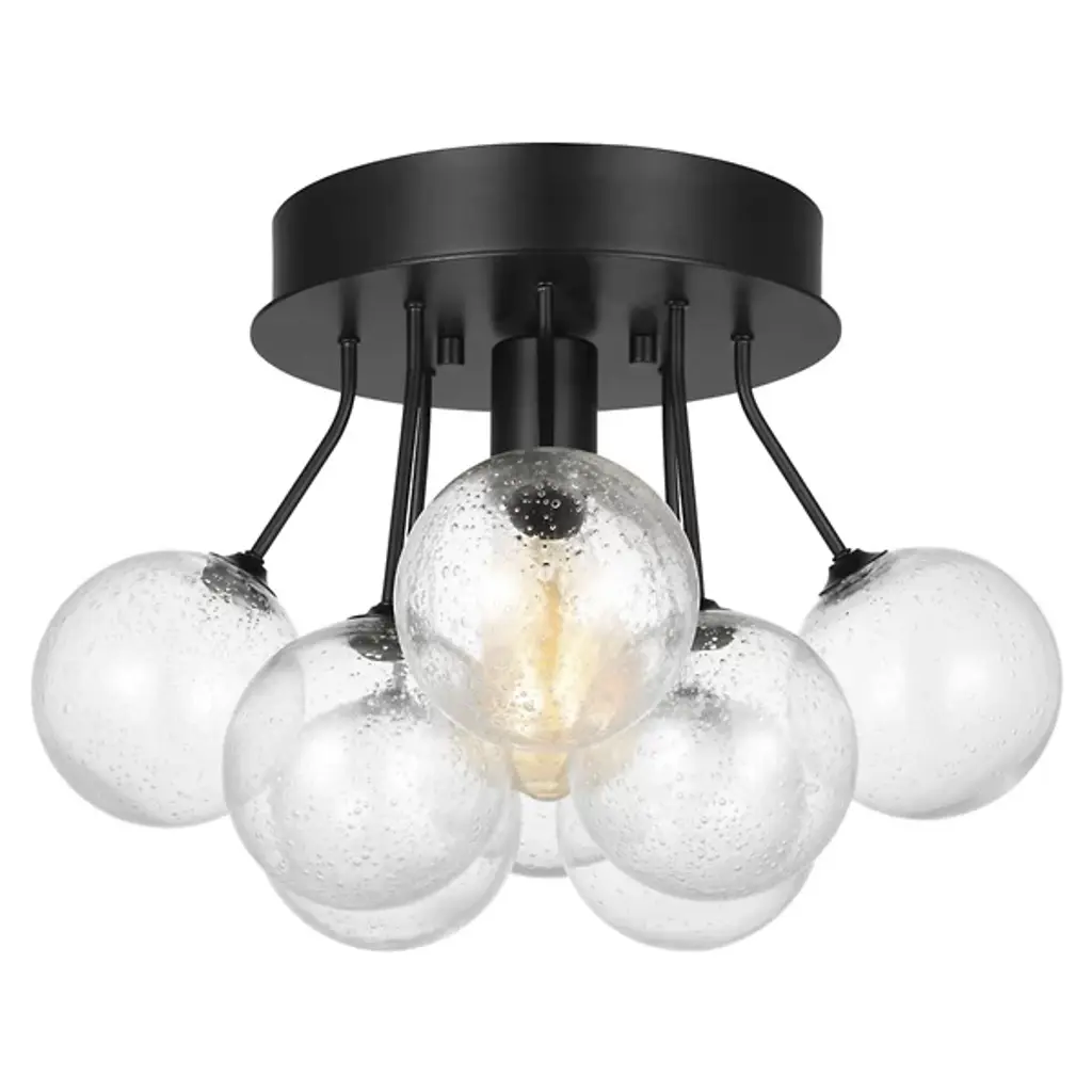 Enhance your interior spaces with the elegant lines of the Bronzeville Semi Flushmount from Visual Comfort Studio, formerly known as Sea Gull Lighting, A restrained mid-century modern design, it starts with a smooth-surfaced steel canopy that sends down a single socket from its central point. This damp-listed lamping is obscured from the sides by a series of glass globes held up by slender steel stems, some dropping directly downward while others are canted slightly outward. This sculptural construction blocks moderates direct glare from the sides into creating a pleasant glow all around the fixture.