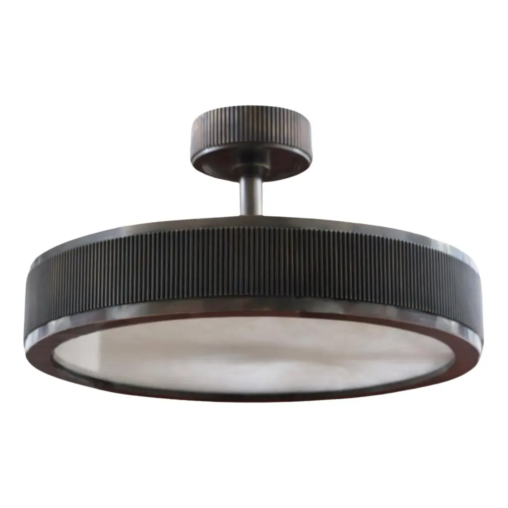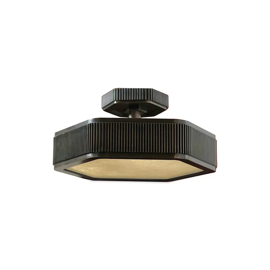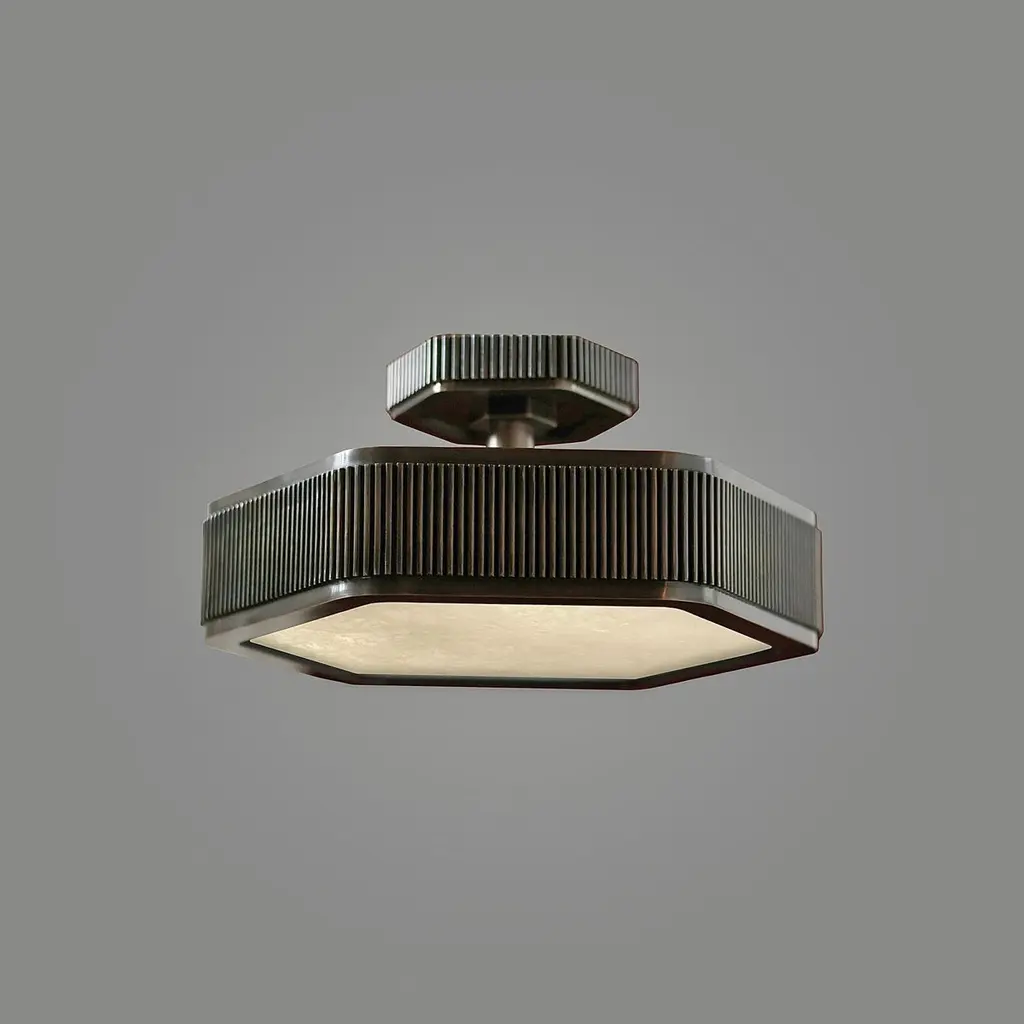 Hexagon Form Antique brass semi flush mount with rock crystal Panel,crated by Phoenix.Three e12 sockets installed,180w total.Custom finish upon request.
