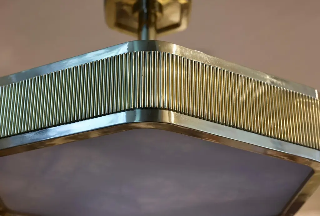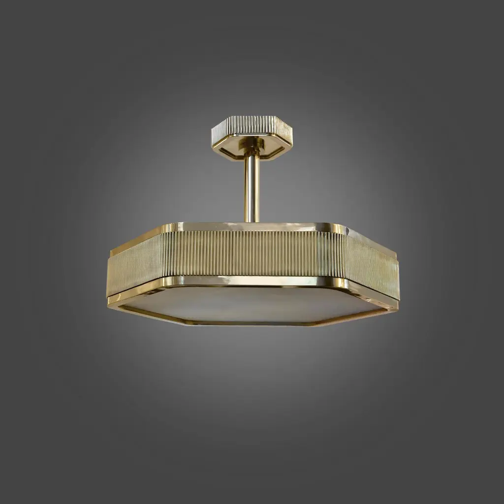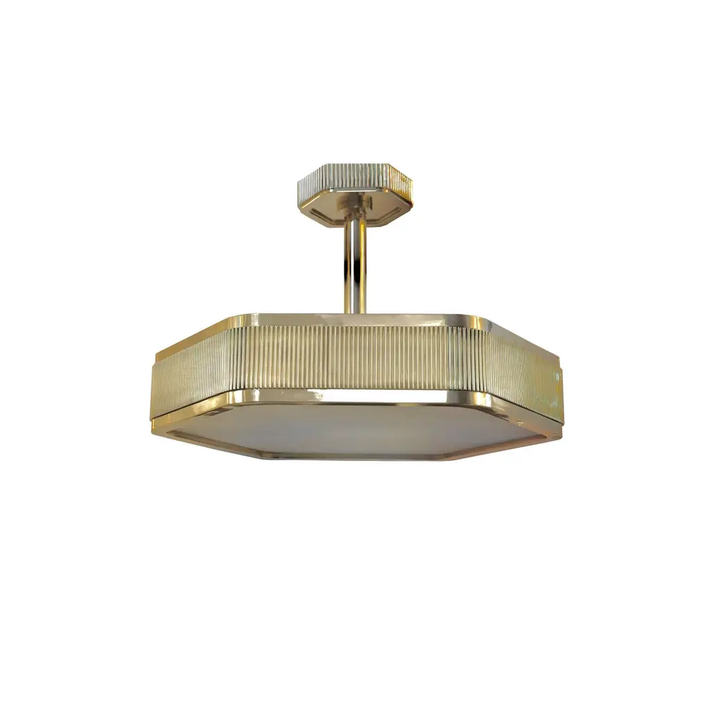 BSO 18 fixture, hexagon form fixture with polished brass frame and rock crystal panel. Three sockets installed, 180w total.Custom size and metal finish available upon request. Please message for availability and lead time.Created by Phoenix, NYC.