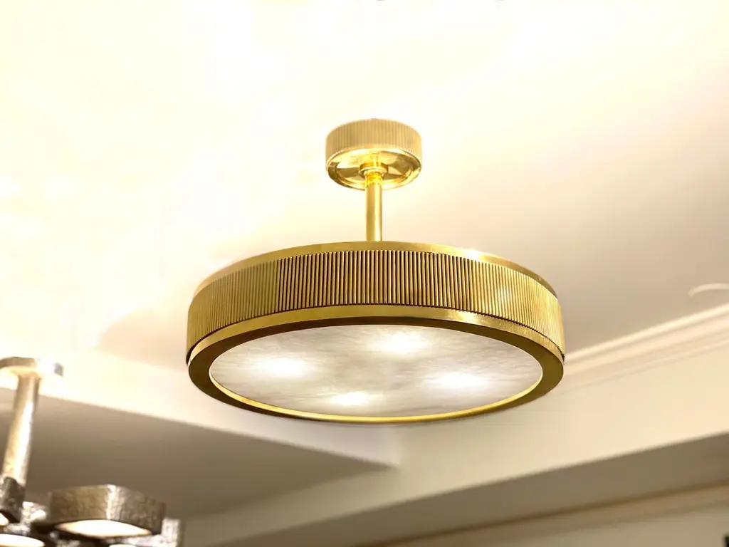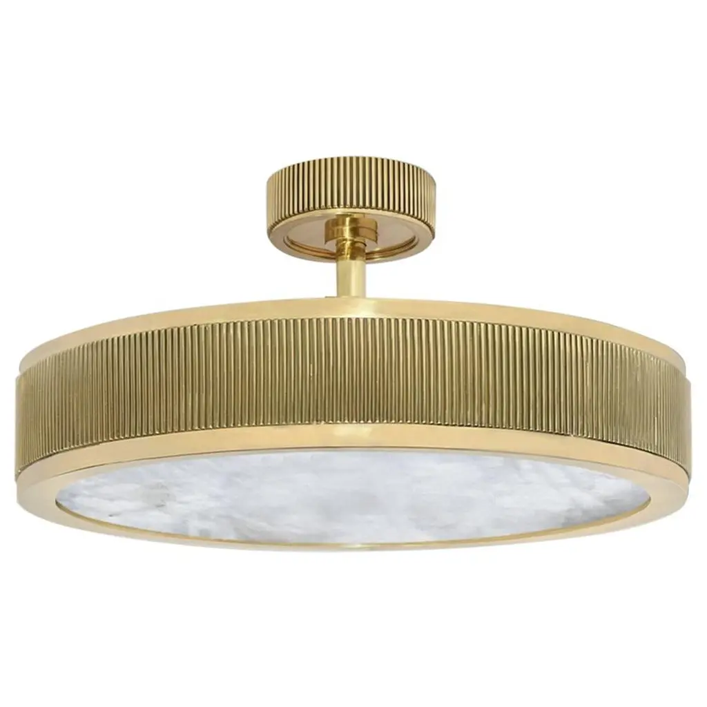 Rock crystal semi flush mount with polished brass frame. Created by Phoenix Gallery, NYC.Height can be adjustable.The height of the brass frame is 4". Lutron dimmer system. Each fixture installs four E26 base sockets. Use four 60W each LED light bulb. (240W total).
