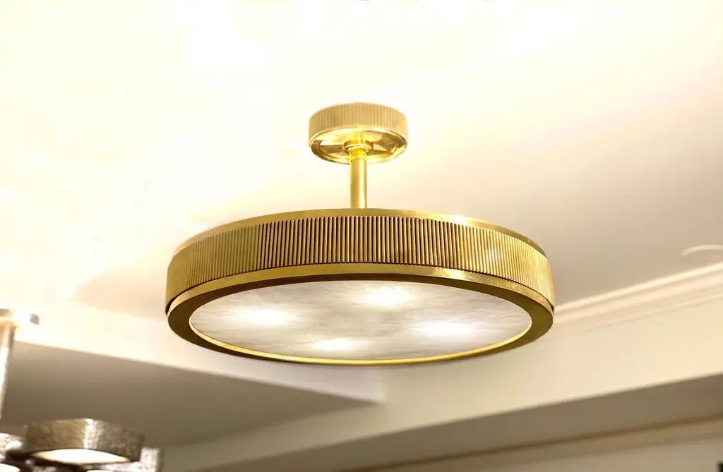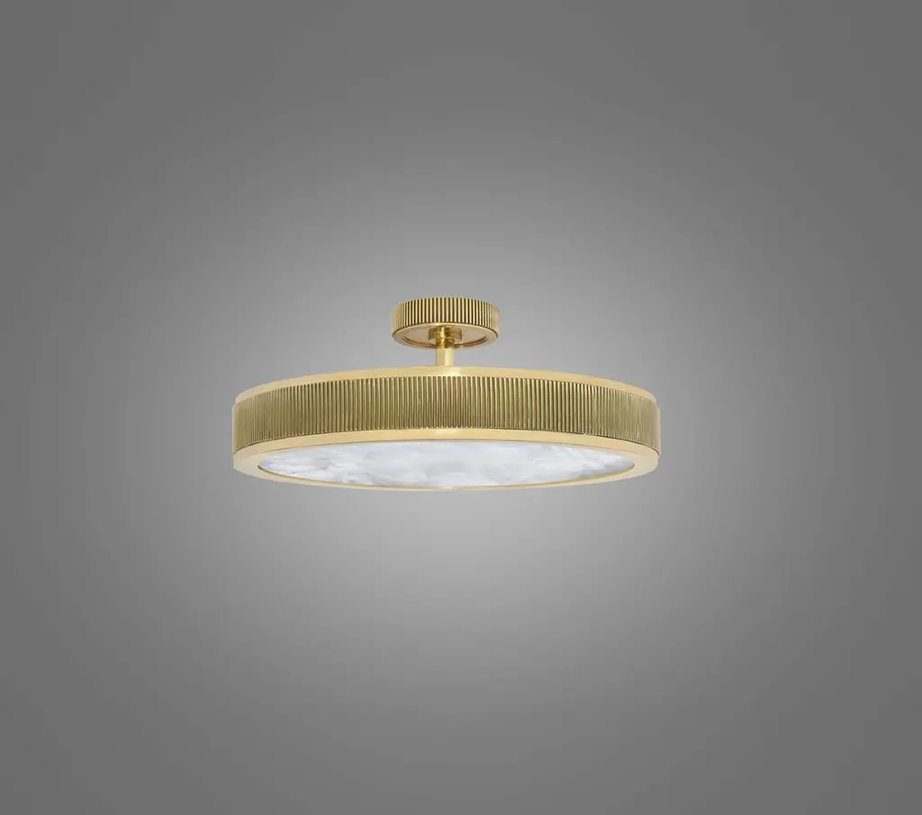 Rock crystal semi flushmount with polished brass frame. Created by Phoenix Gallery, NYC.Height can be adjustable.The height of the brass frame is 4".
