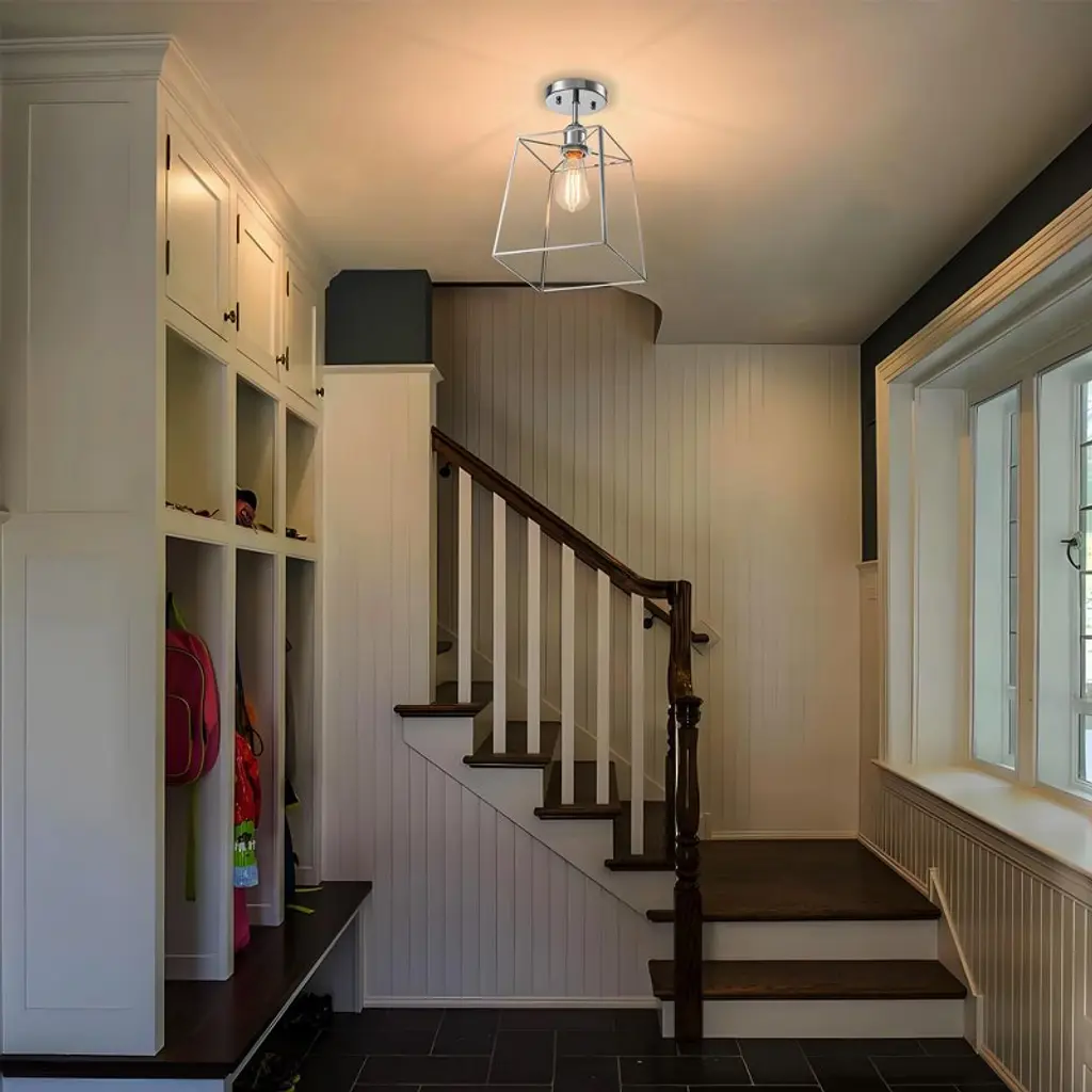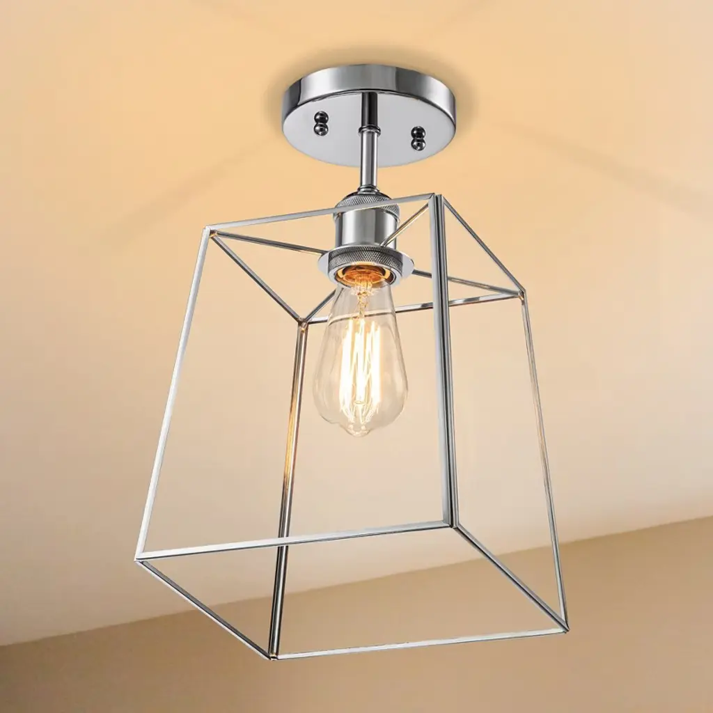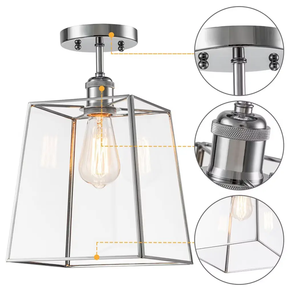 The semi-flush mount ceiling light comes in a trapezoidal shape, delivering an simple and stylish look. It features brass frame in chrome finish with a clear tempered glass shade, presenting a modern minimalist style. The open bottom design dissipates heat quickly and allows for the installation of high power bulbs to provide enhanced illumination.This ceiling light is not only practical but also aesthetically pleasing, making it the ideal choice for both indoor and outdoor spaces.