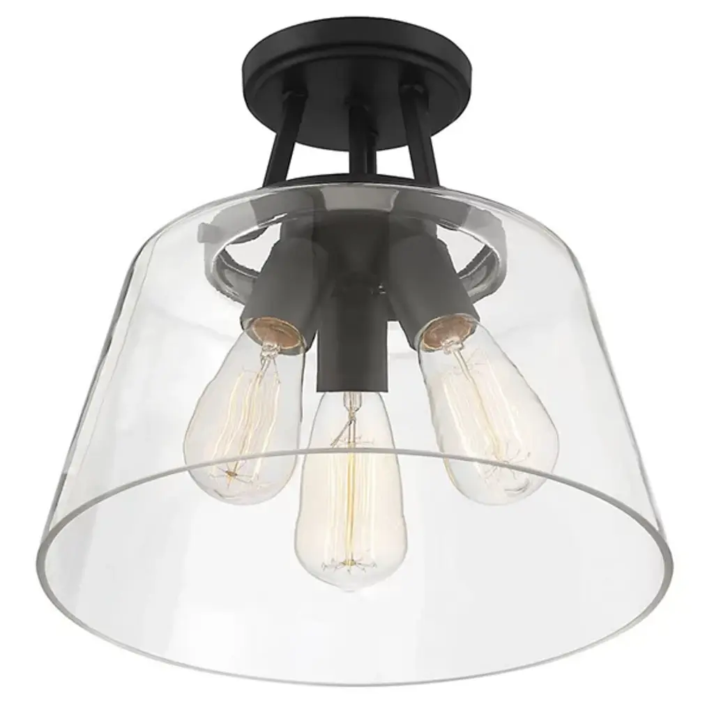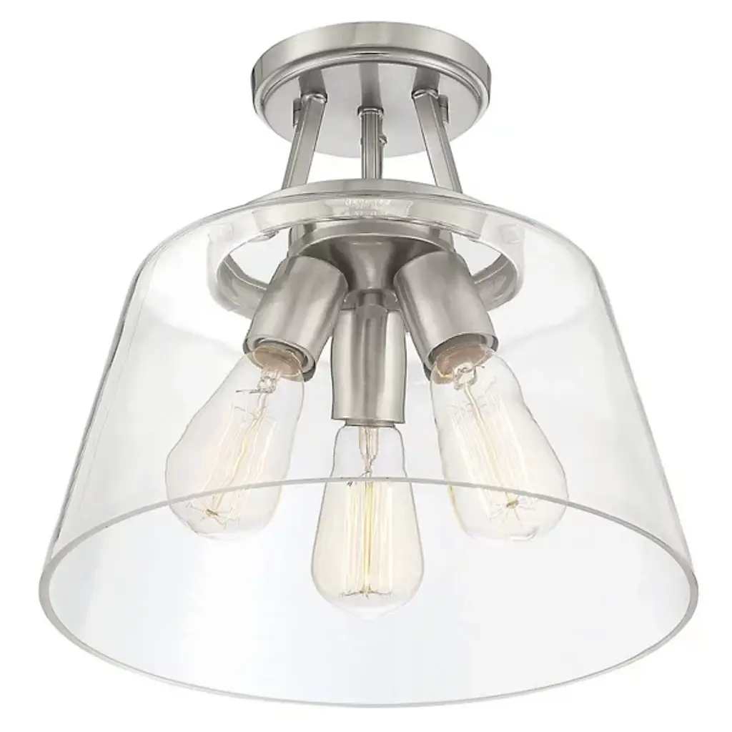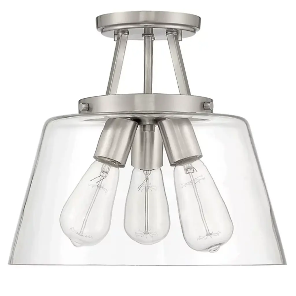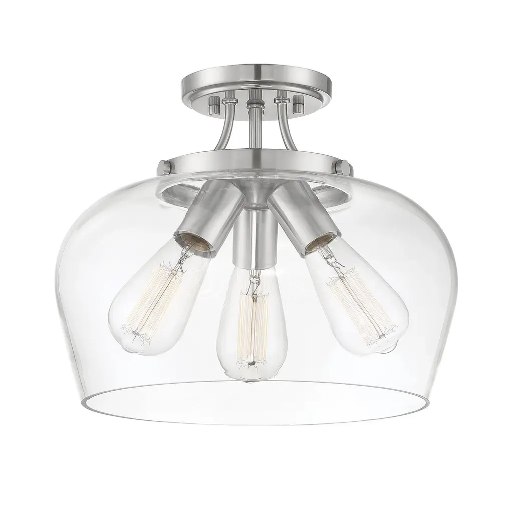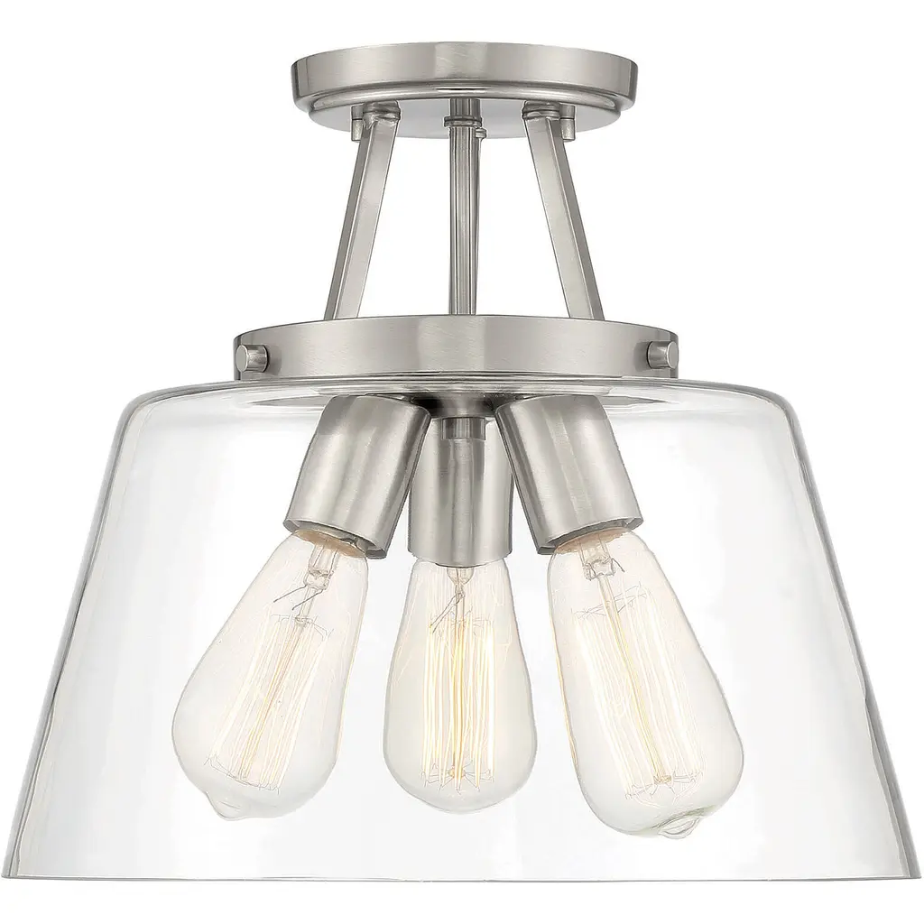 The Calhoun Semi Flushmount by Savoy House has a clean, contemporary look that is at home in a wide range of spaces. Set close to the ceiling, this design is supported by a round canopy and a collection of short, angled stems that hold a clear glass shade. Within this shade, a set of visible bulbs shine, casting an even layer of illumination onto surroundings. The metal elements are completed with a lovely finish, allowing this piece to bring a bright, beautiful touch to rooms.