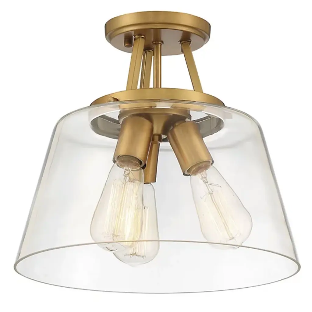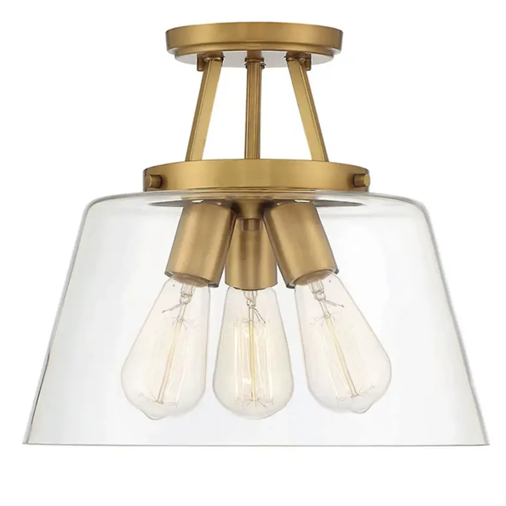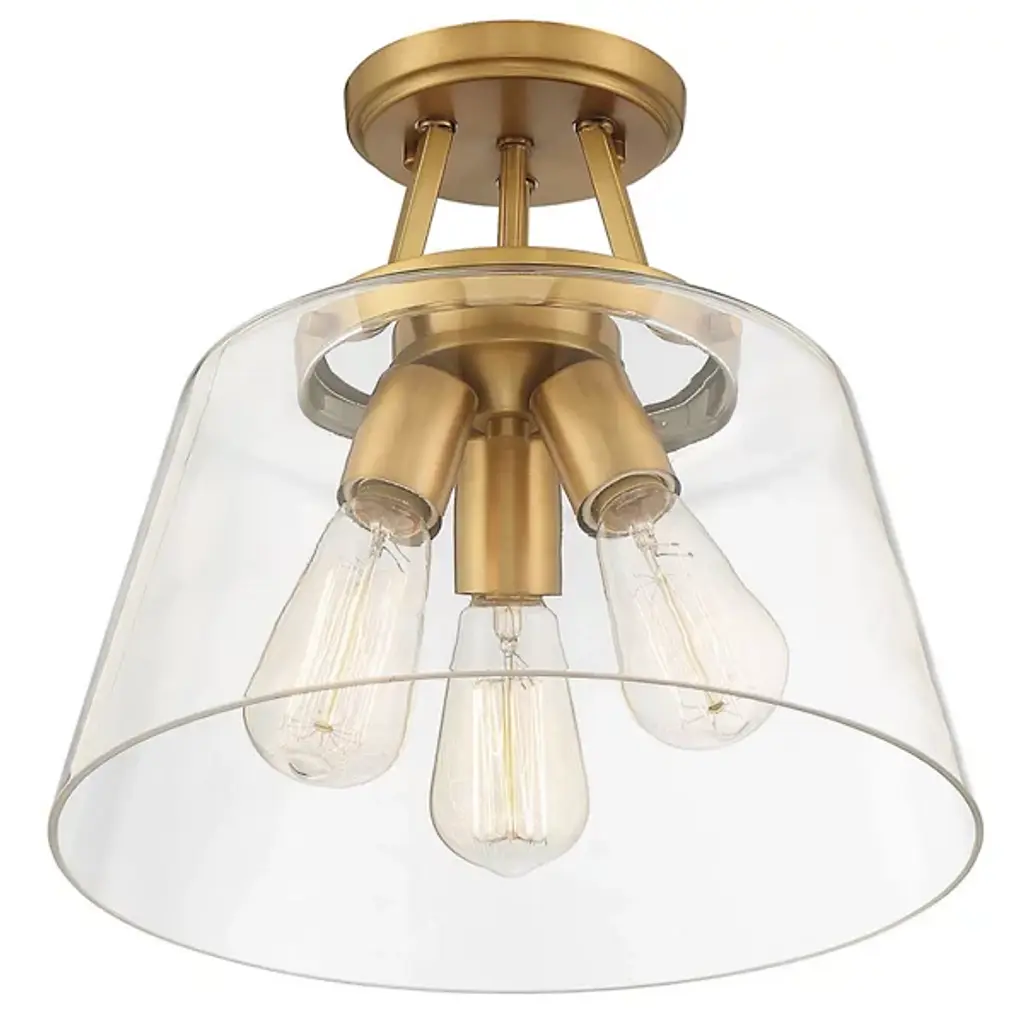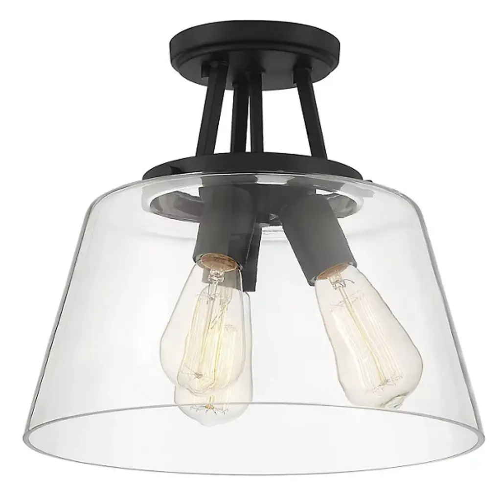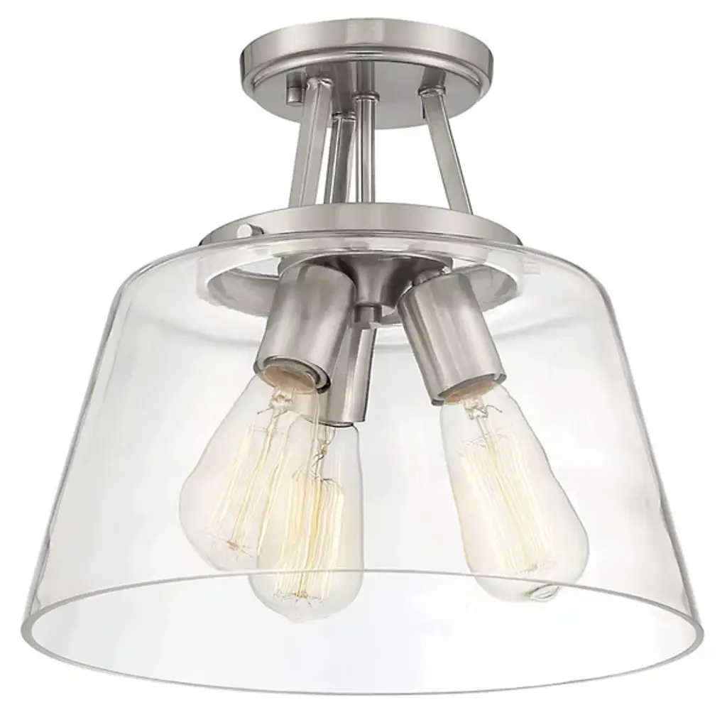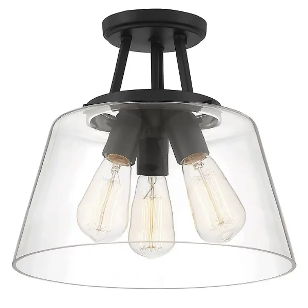The Calhoun Semi Flushmount by Savoy House has a clean, contemporary look that is at home in a wide range of spaces. Set close to the ceiling, this design is supported by a round canopy and a collection of short, angled stems that hold a clear glass shade. Within this shade, a set of visible bulbs shine, casting an even layer of illumination onto surroundings. The metal elements are completed with a lovely finish, allowing this piece to bring a bright, beautiful touch to rooms.