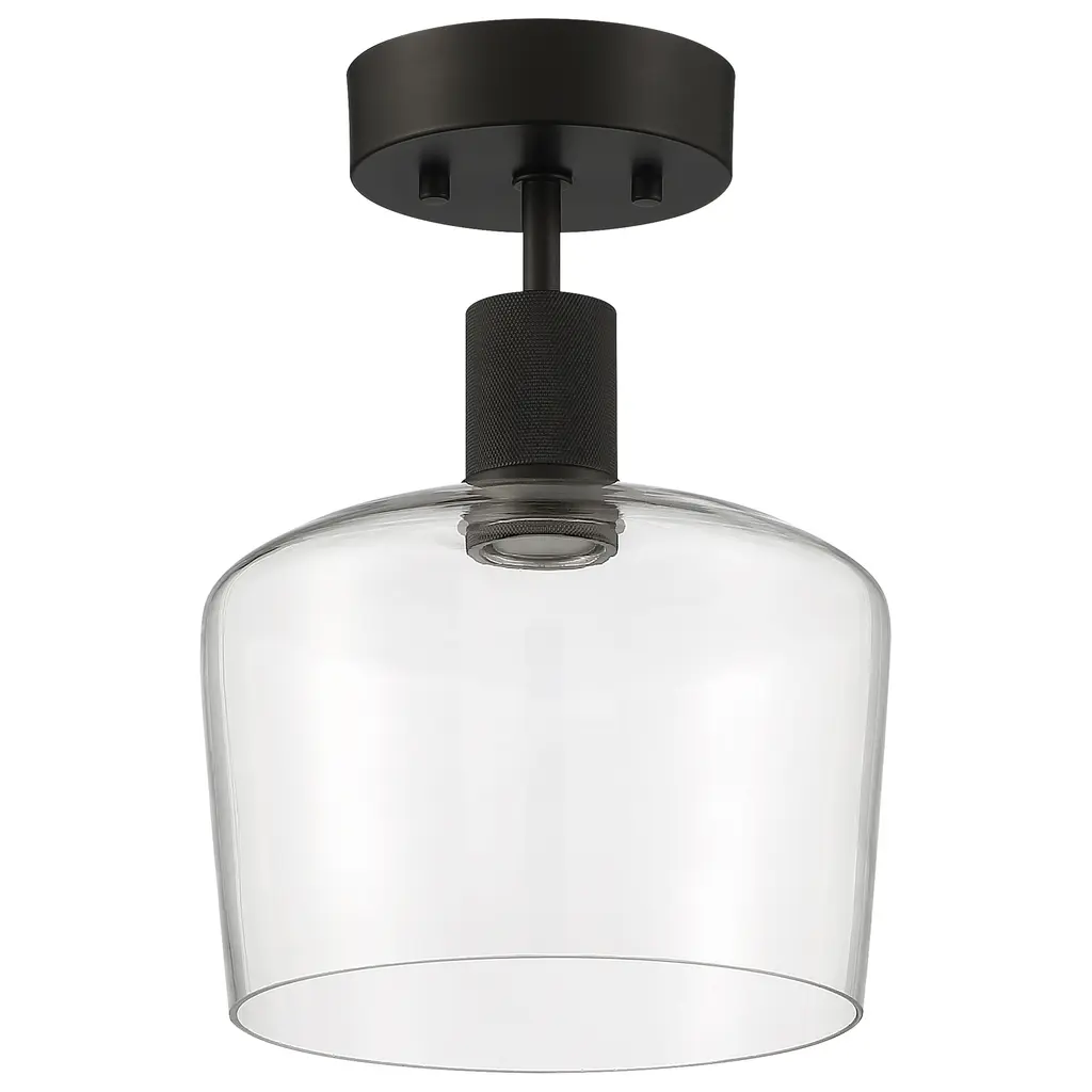 This semi flush mount is in a black finish. It comes with a clear glass shade. The bulb is not included.