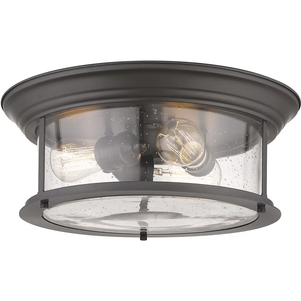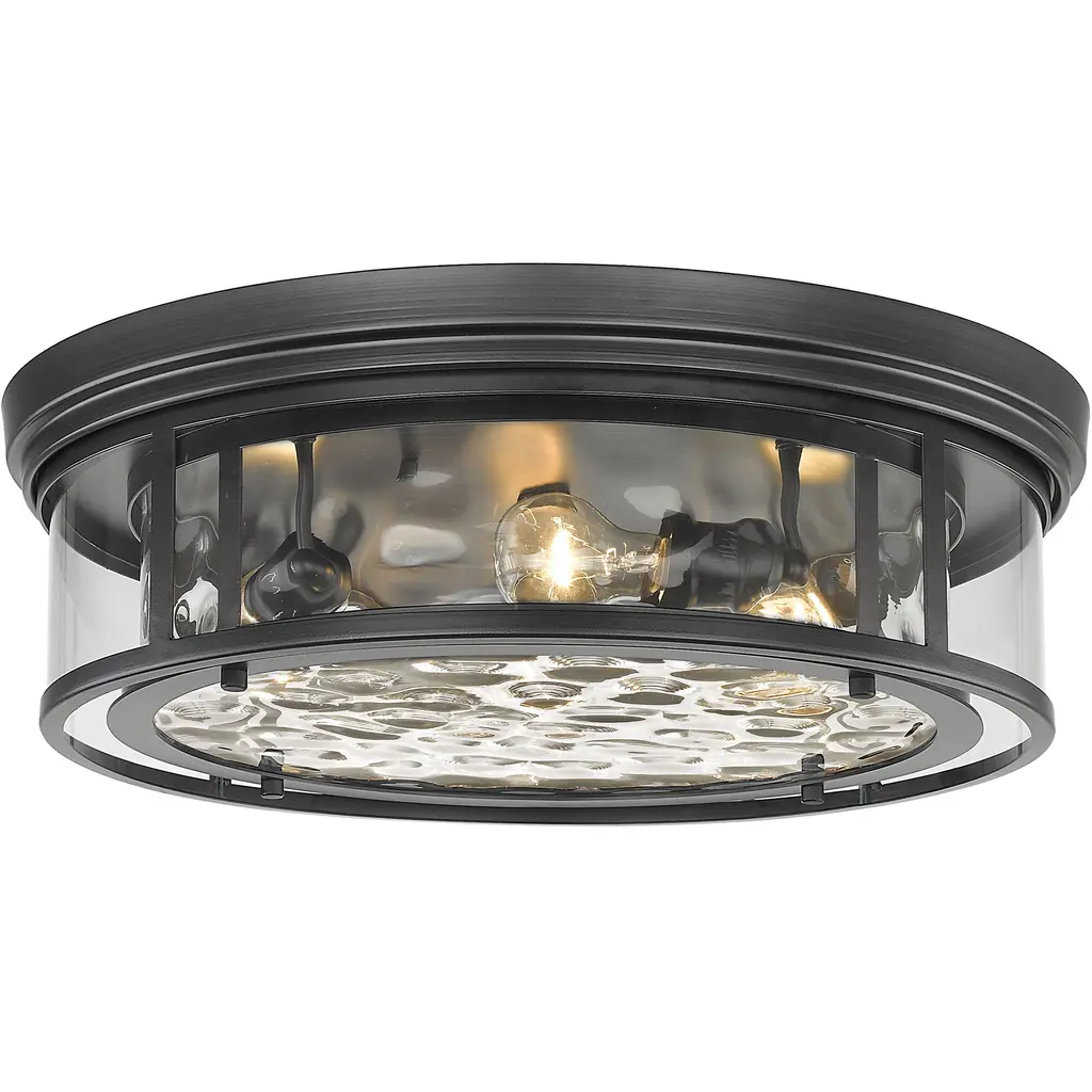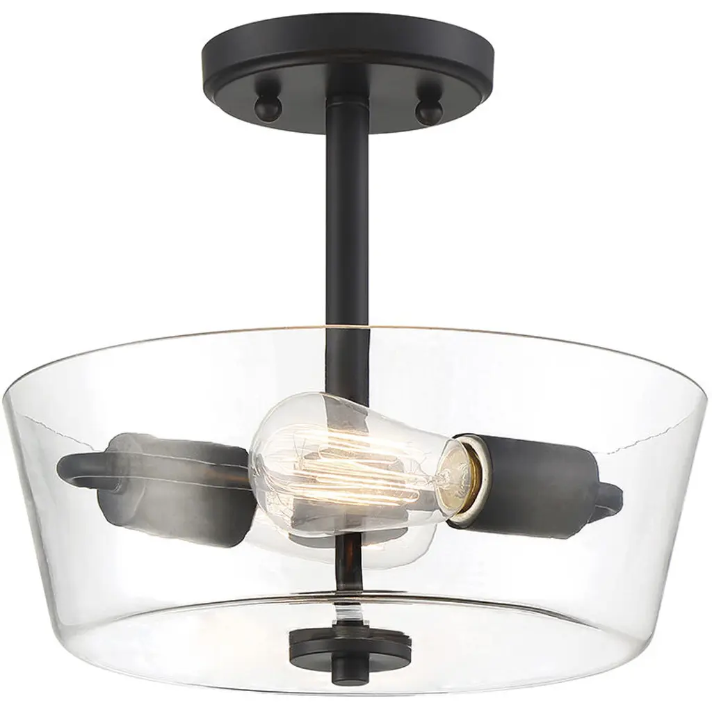 This semi flush mount is in a black finish. It comes with a clear glass shade and the bulbs are not included.