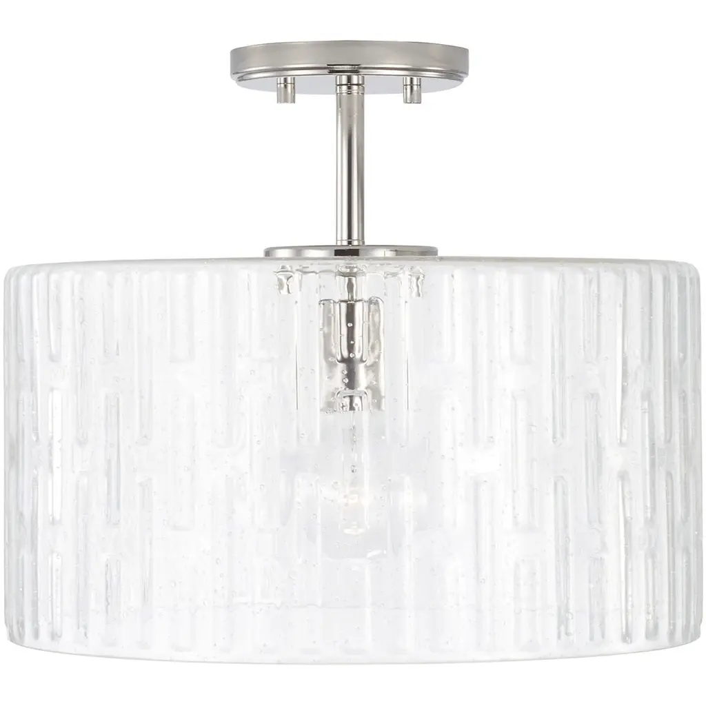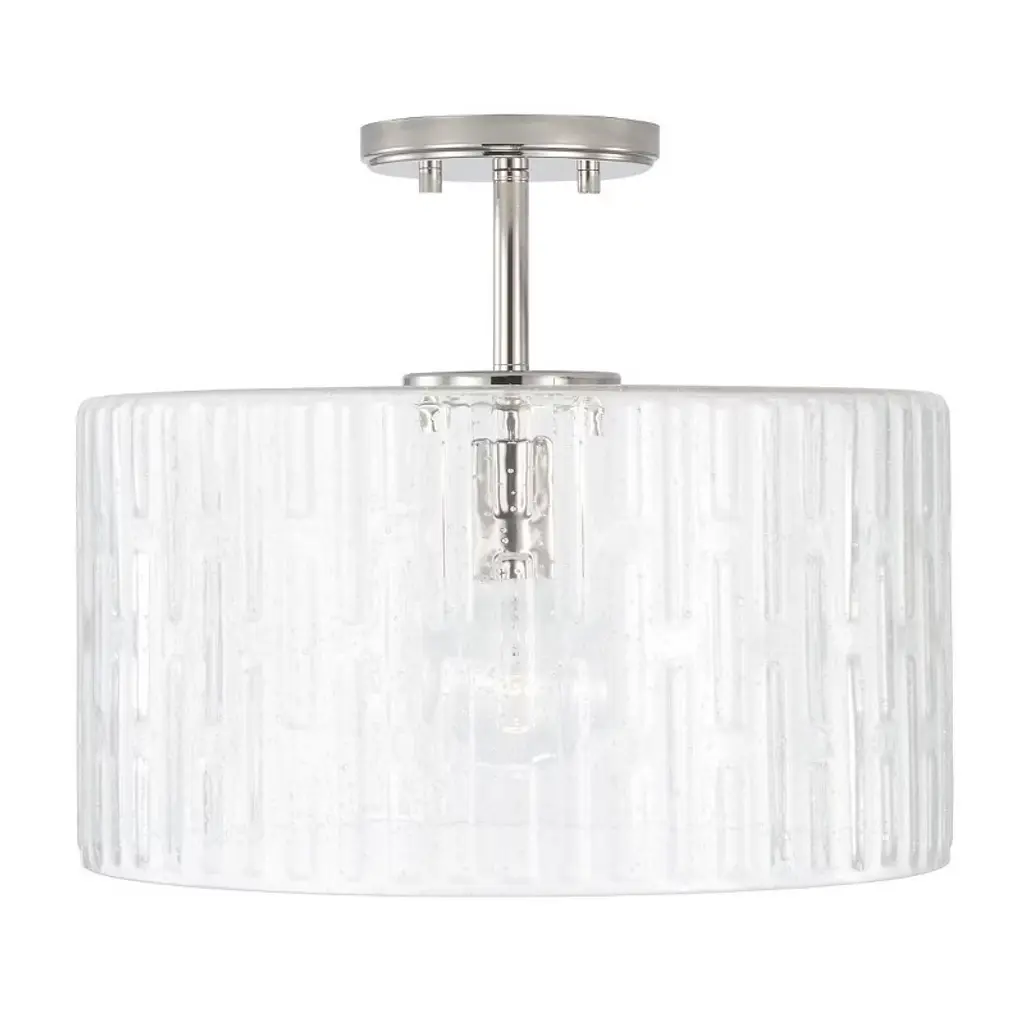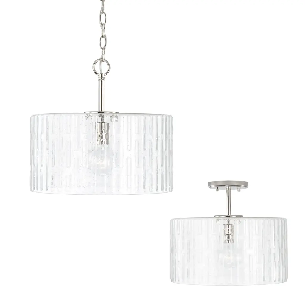 Create a simple and striking statement with the Emerson 1-Light Dual Mount Pendant. This fixture features a wide seeded glass shade with an embossed geometric pattern that sparkles on a clean and classic Polished Nickel frame. This fixture can be used as a Semi-Flush or as a Pendant. APPLICATIONS: Perfect for use in foyer entryways, dining room, kitchens, stairways and offices. The simple polished nickel fixture suspends a patterned glass shade in this beautiful modern piece CONVERTIBLE: May be mounted either as a pendant or as a semi-flush mount (all hardware included). VERSATILE: Dimmable and LED/CFL/Incandescent compatible, uses one 100-Watt (max) E26 medium base bulb (Not Included) DIMENSIONS: Adjustable Height (from 12.5 inch to 140 inch), 15 inchW x 14 inchH; includes 10' of chain and 15' of wire. RELIABLE: Includes 1-Year Limited Manufacturer's Warranty. Warranty: 1 Year Room Recommendation: Foyer/Entryway/Hallway/Stairway/Bathroom/Powder Room/Kitchen/Bedroom Mounting Directi