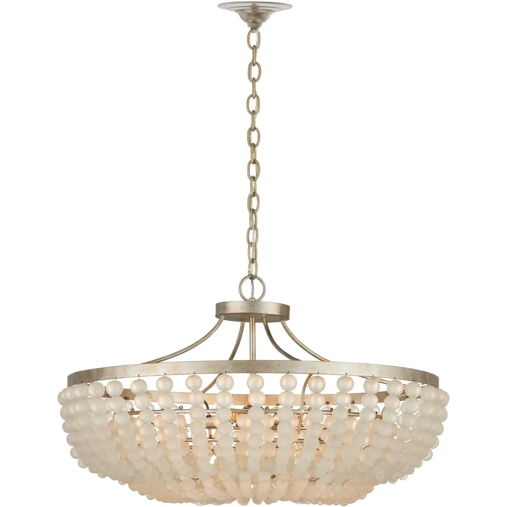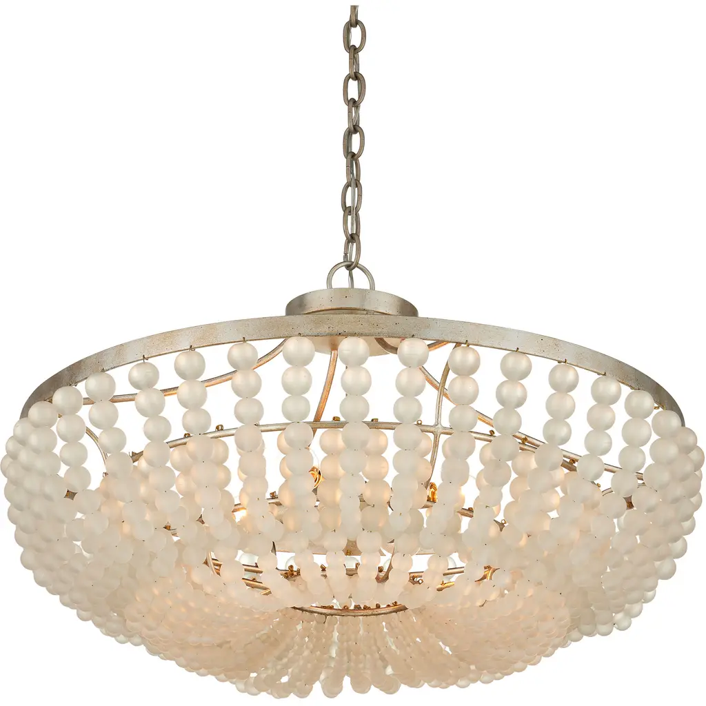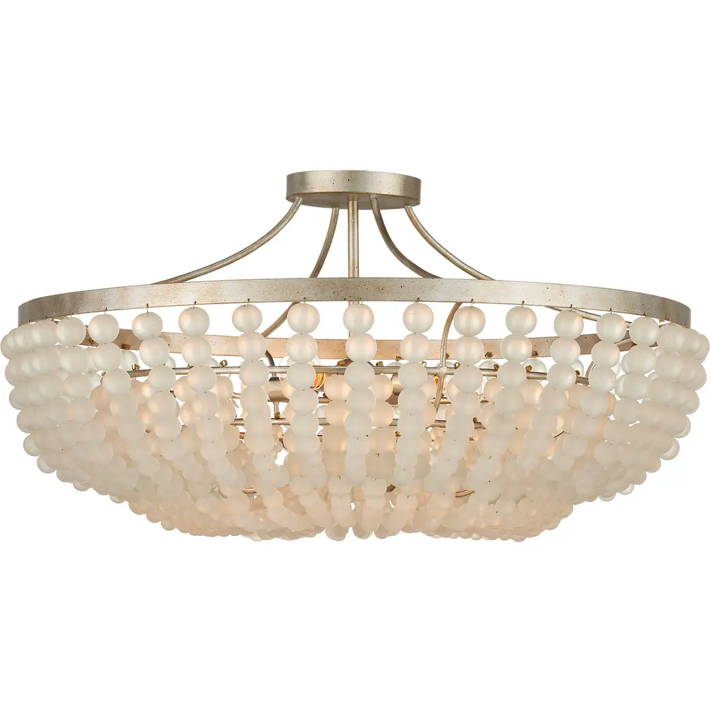 The Chanteuse Chandelier features two cascading rows of ivory glass beads in graduated sizes, suspended from a wrought iron frame finished in elegant Silver Granello. Smaller beads at the bottom diffuse the light from four bulbs, giving the fixture a warm, luminous quality. Designed for versatility, this piece can be installed as either a chandelier or a semi-flush mount, making it a flexible option for spaces with varying ceiling heights. Adjustable from 15.5" to 118" with use of included chain/rod kit/cable. If your space calls for a longer drop, additional chain/rods/cable is available for purchase.