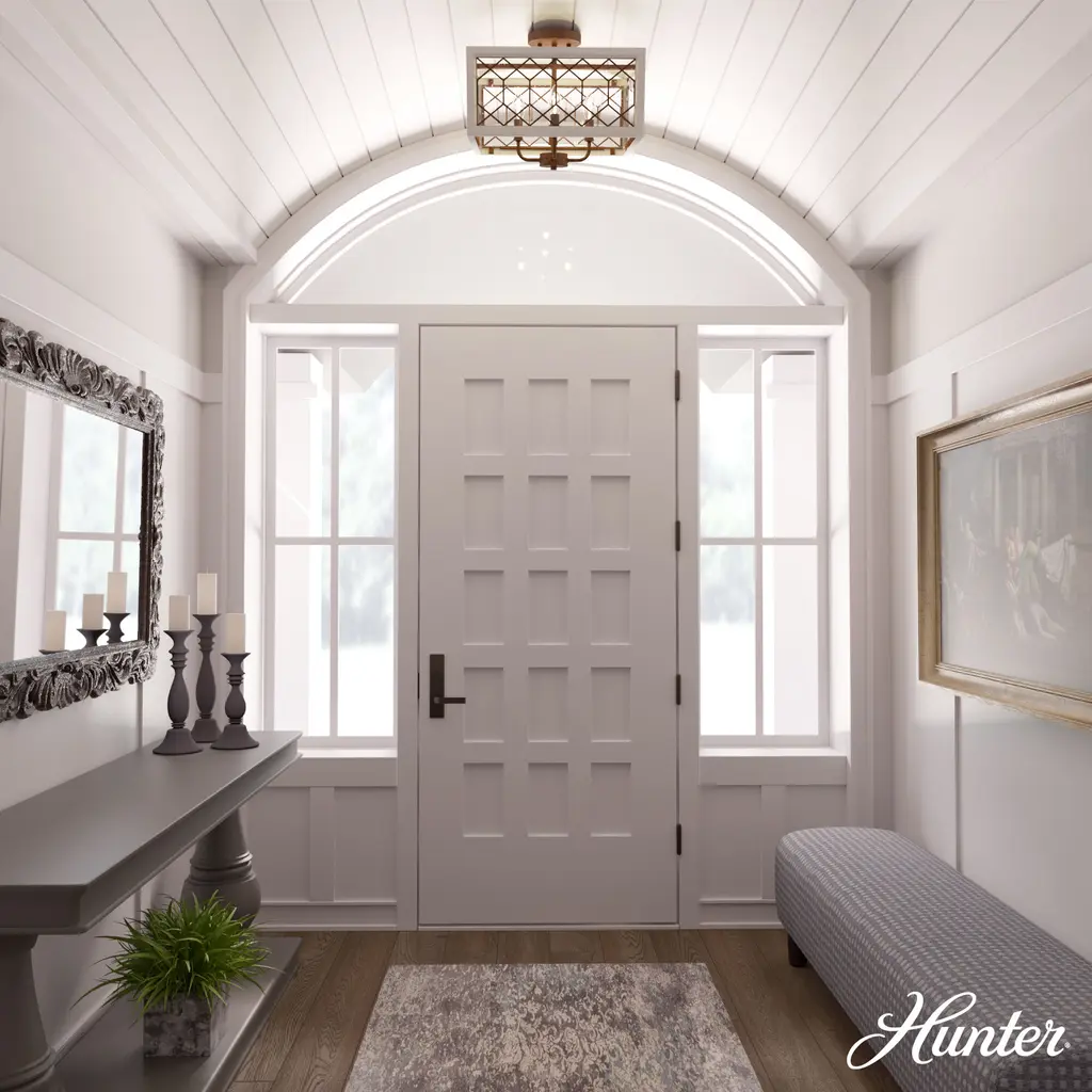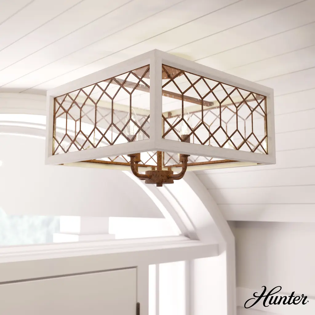The Chevron semi-flush mount light brings a modern feel to the classic elegance of harmonious design. Its wood-inspired frame with glass and metal lattice detailing adds a hint of coziness to the traditional style and creates an inviting atmosphere. The Chevron collection is a charming addition to your space. Mix and match with other fixtures from this collection or from our ceiling fan designs.