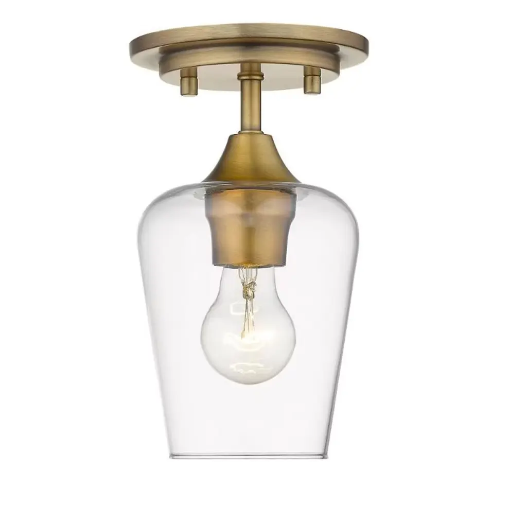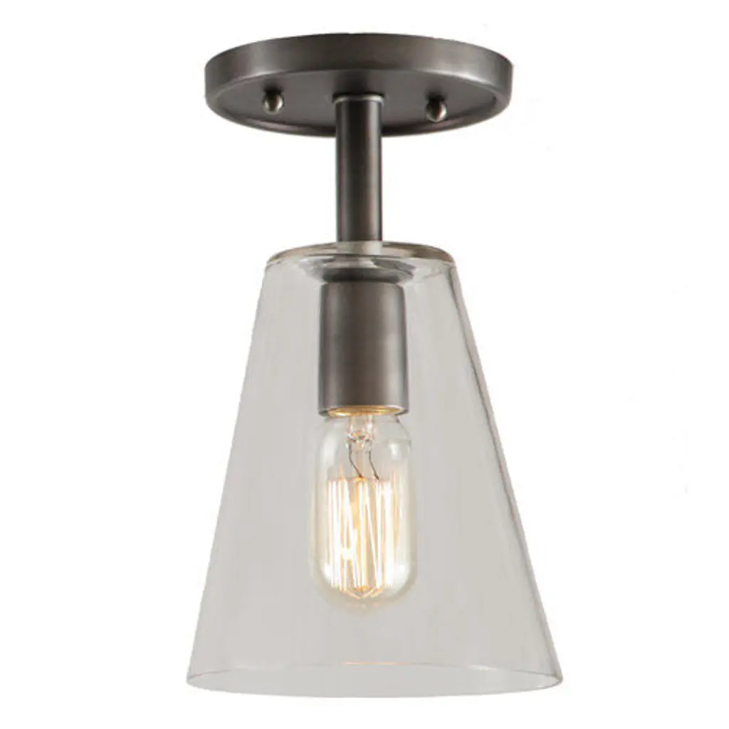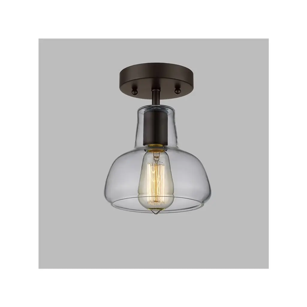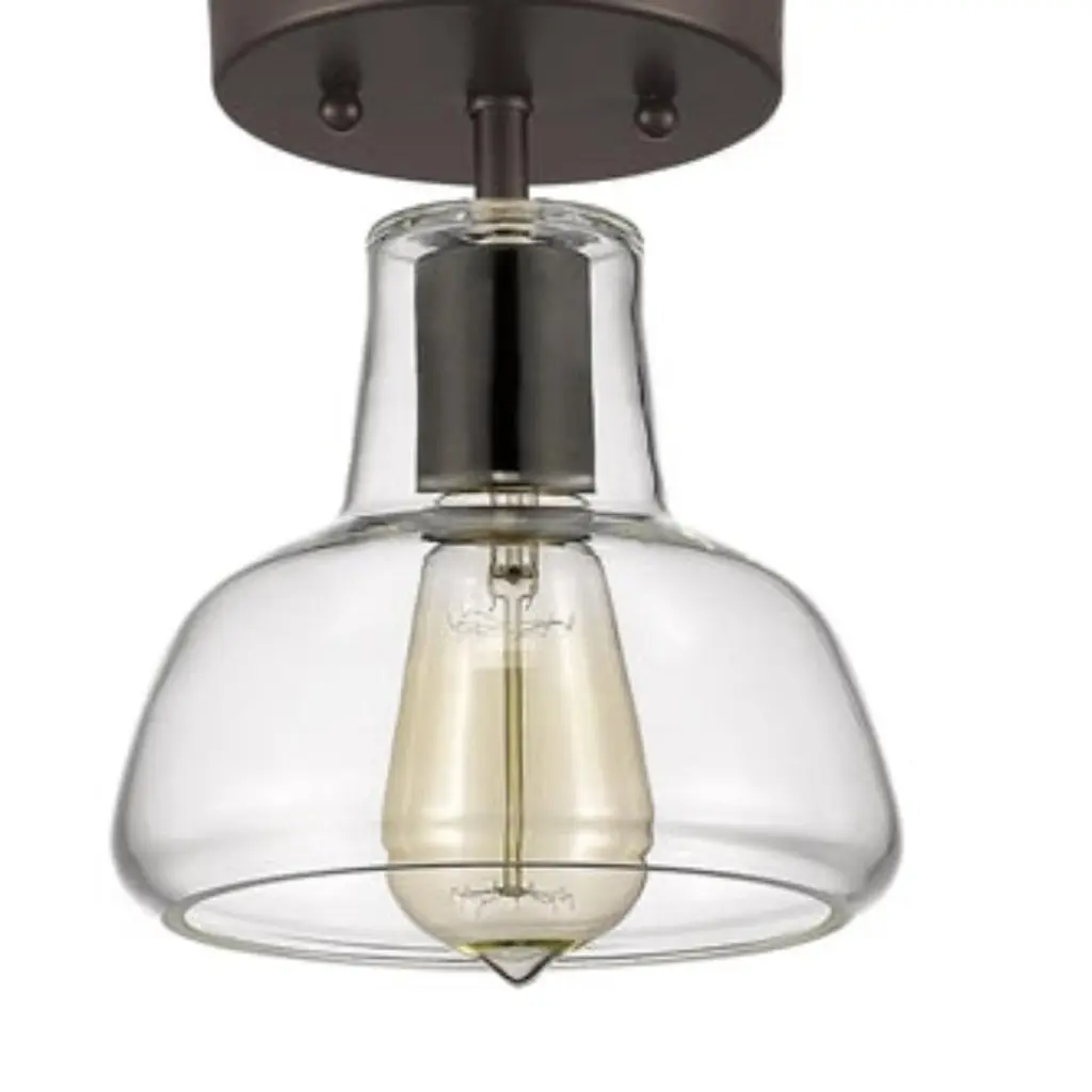 The Dickens Semi-Flush Ceiling Fixture captures industrial elegance with a vintage twist. Featuring an oil rubbed bronze finish and a clear glass shade, it pairs seamlessly with Edison-style filament bulbs to cast a warm, inviting glow. Ideal for lofts, transitional spaces, or urban interiors, this compact piece delivers bold style in a modest size. Key Features: Uses (1) 100W max E26 Filament Bulb (60W included) Finished in oil rubbed bronze with clear rounded glass shade Industrial-inspired design for transitional or urban interiors Downfacing light powered by hardwired wall switch Dimensions: 8.19"H x 6.7"W x 6.7" Projection | Net Weight: 1.5 lbs