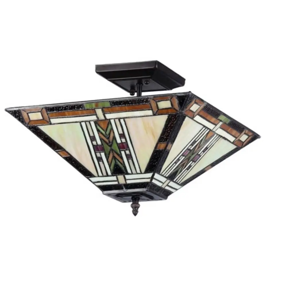 The Chloe Lighting Gode semi‑flush fixture channels the iconic Mission style with handcrafted Tiffany‑inspired art glass in soothing pastel tones, housed in a striking antique bronze frame. This 2‑light fixture, spanning 14″ in diameter, creates a warm and inviting ambiance via its intricate mosaic shade. Perfect for kitchens, hallways, dining rooms, and dens, the Gode brings timeless craftsmanship and subtle elegance to your space. The fixed-height, hardwired installation ensures a tight fit against the ceiling, offering style without sacrificing headroom. Key Features: Artistic Illumination: Unique pastel mosaic casts warm, decorative light even when offCompact Profile: Semi‑flush design suits rooms with standard ceiling heightsQuality Craftsmanship: Hand‑placed stained glass and metal frame ensure durability and styleVersatile Aesthetic: Mission-style complements wood finishes, vintage furniture, and eclectic interiorsEasy Setup: Hardwired fixture installs flush for a clean, finished look