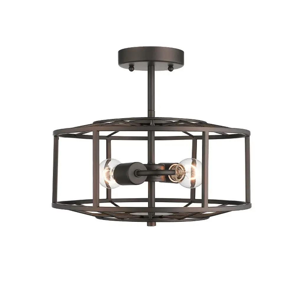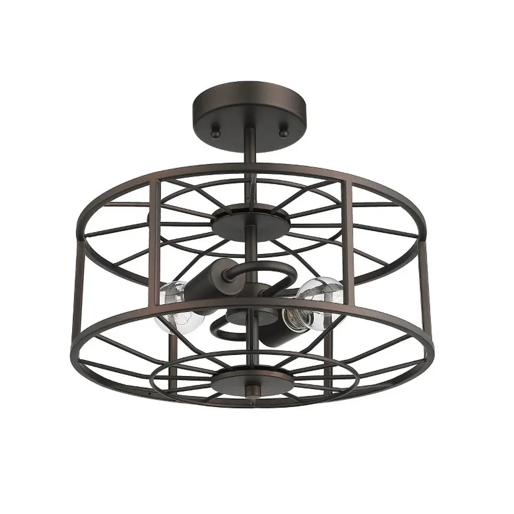 Infuse your space with bold industrial charm using the Ironclad 2-Light Semi-Flush Ceiling Fixture. Designed with clean, modern lines and a rich oil rubbed bronze finish, this ceiling light features an open drum-style metal shade that offers uninterrupted illumination to any room. Key Features Industrial-style open drum design in rich oil rubbed bronze Accommodates (2) 100W max E26 Type A bulbs (not included) No glass shade allows full illumination across your space Measures 12.5" H × 14" W × 14" D; 6" wiring included UL and cUL listed for safe, hardwired indoor installation