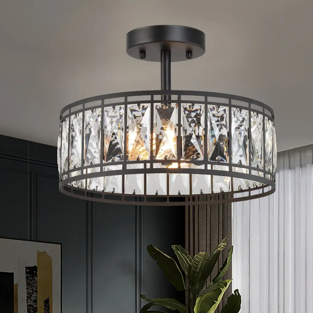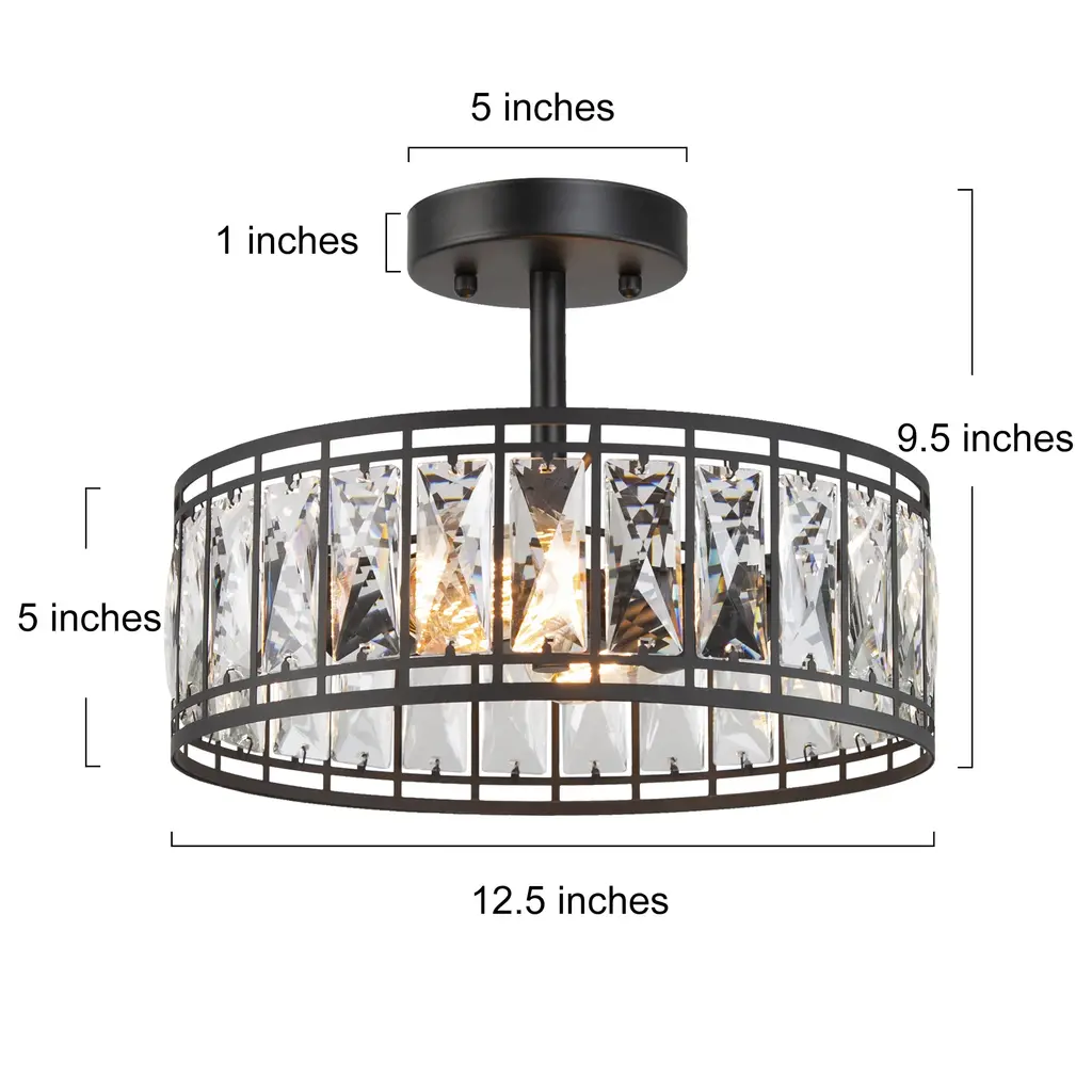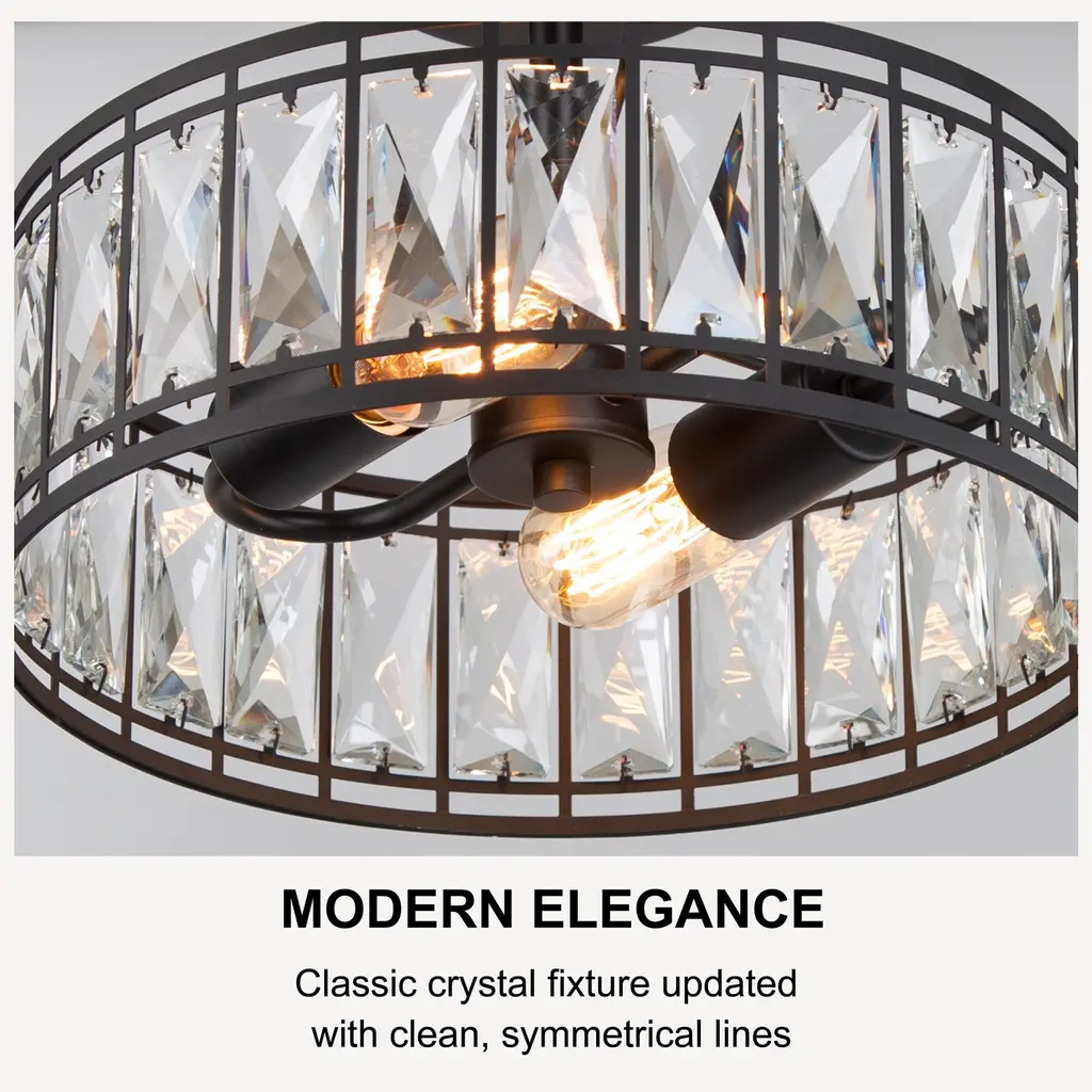 Cirstal 2-Light Modern Black Drum Crystal Chandelier Semi-Flush Mount Ceiling Lights - D12.5"x H 9.5" - D12.5"x H 9.5"