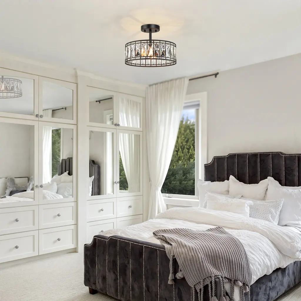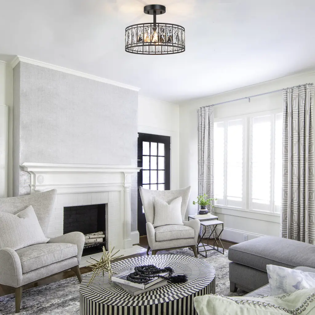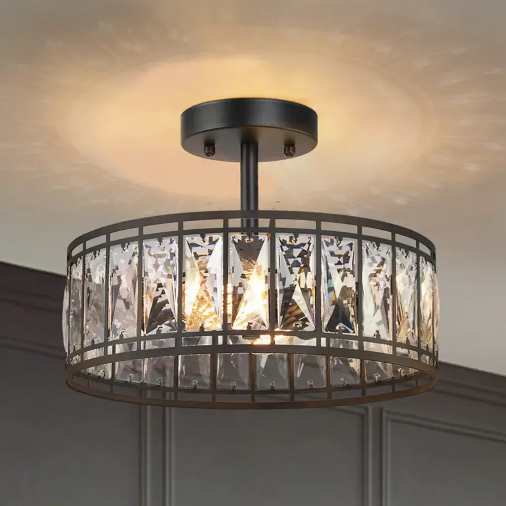 Cirstal 2-Light Modern Black Drum Crystal Chandelier Semi-Flush Mount Ceiling Lights - D12.5"x H 9.5" - D12.5"x H 9.5"