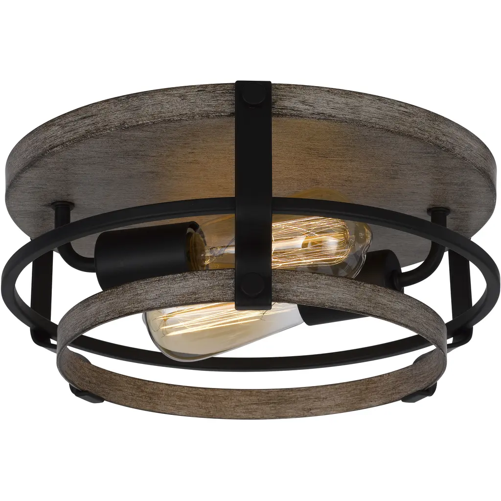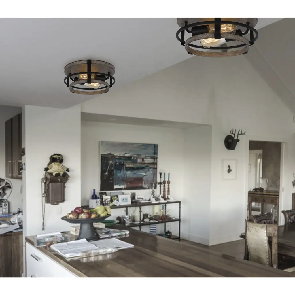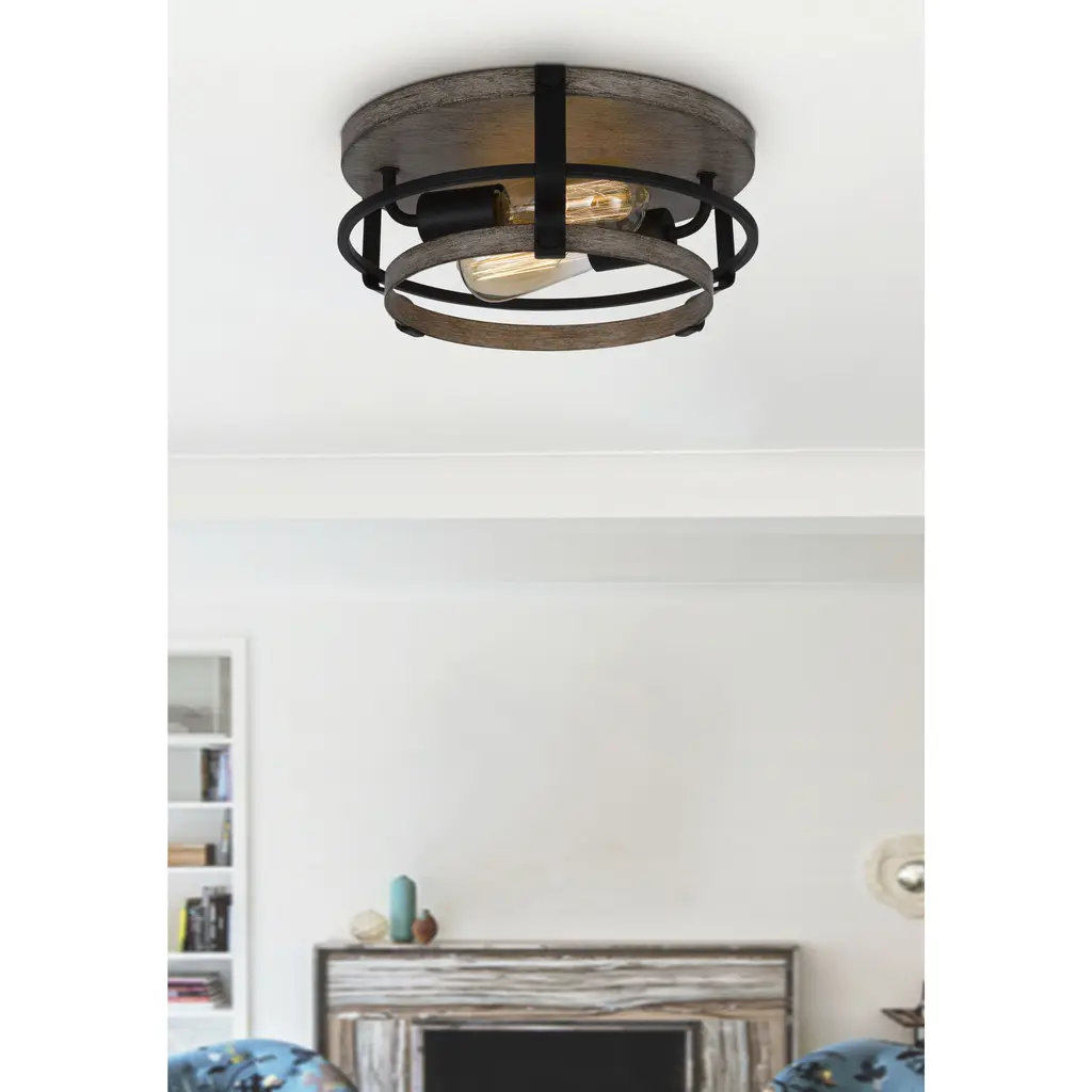 Refresh your space with this painted faux wood finish two-light semi flushmount light. It features an open painted black grill that allows for an undifused flow of light. With a neutral two tone finish, this lamp works well with many different types of style and décor.