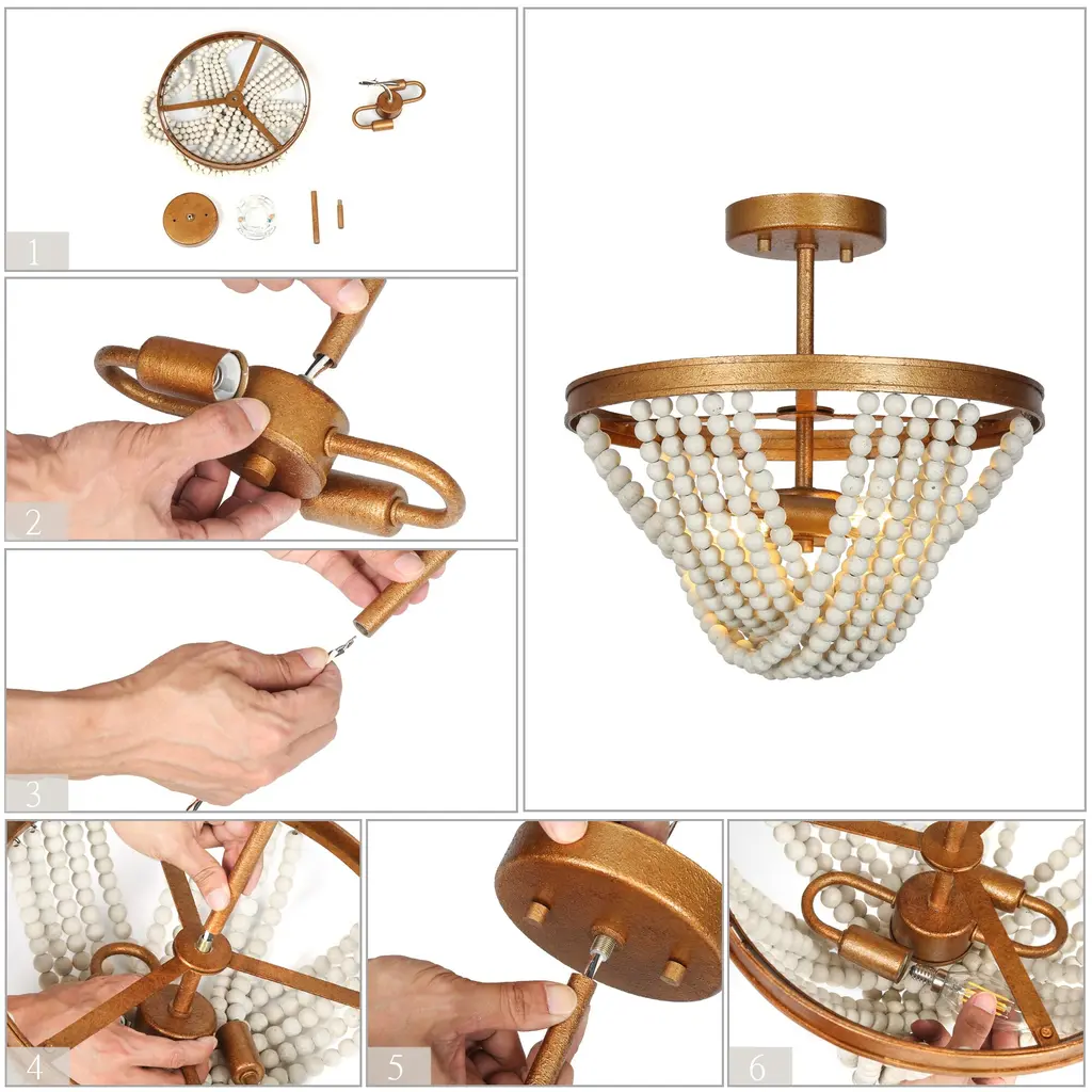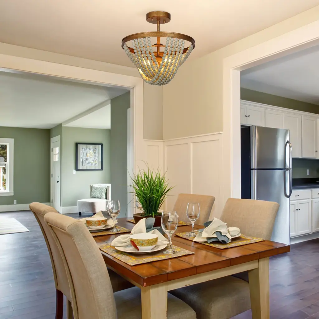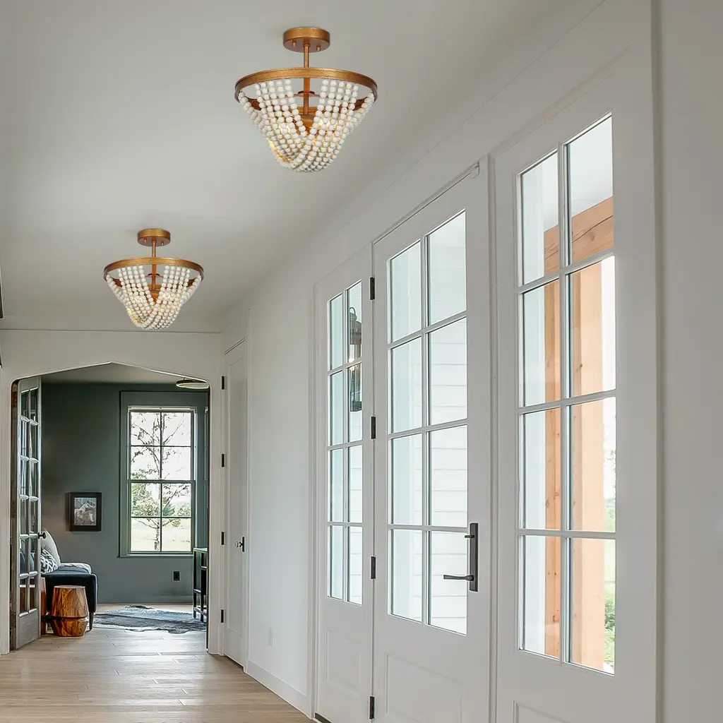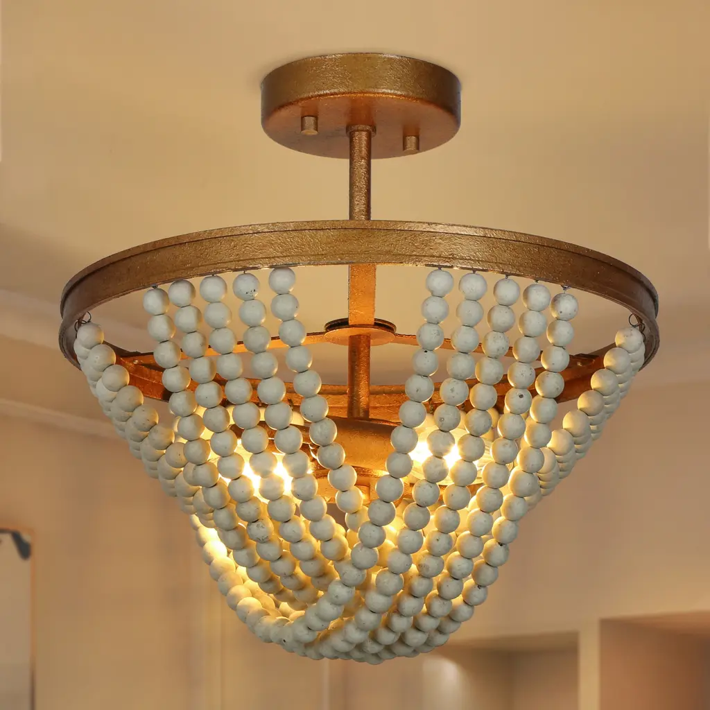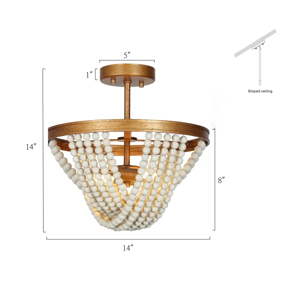 Coasa Mid-Century Modern Gold 2-Light Semi-Flush Mount Lights Wooden Beads Chandelier For Dining Room - D14'' X H14'' - D14'' X H14'' - Distressed White